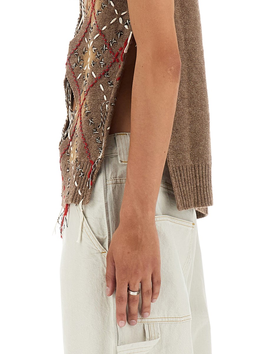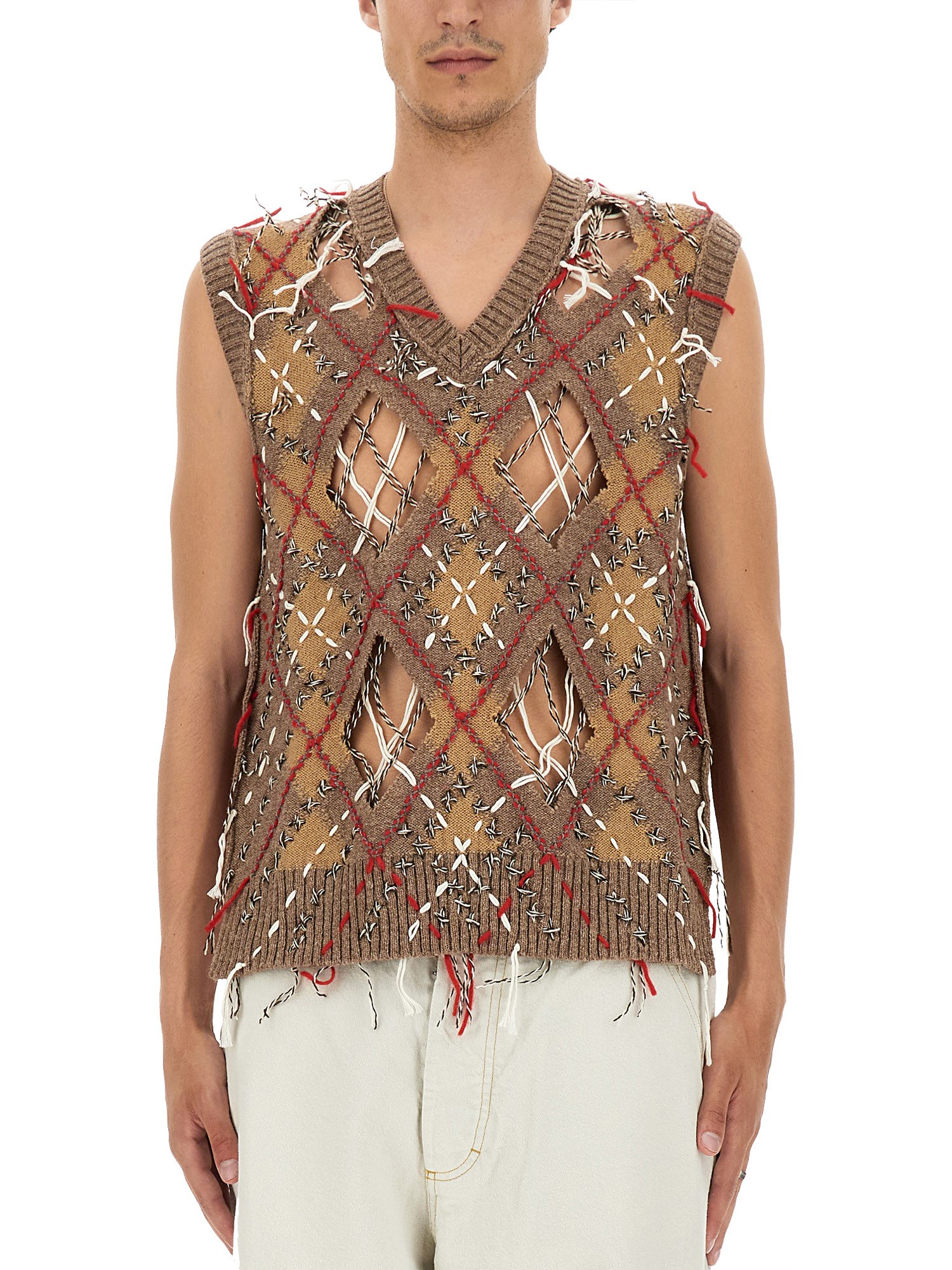 Caldo e leggero, questo gilet di Maison Margiela è realizzato in misto alpaca e lana. Il motivo a rombi è una firma e aggiunge un tocco di eleganza al capo. Un look classico che diventerà sicuramente il vostro preferito. Il gilet senza maniche è realizzato in misto lana, per un'atmosfera accogliente e calda sia all'interno che all'esterno.