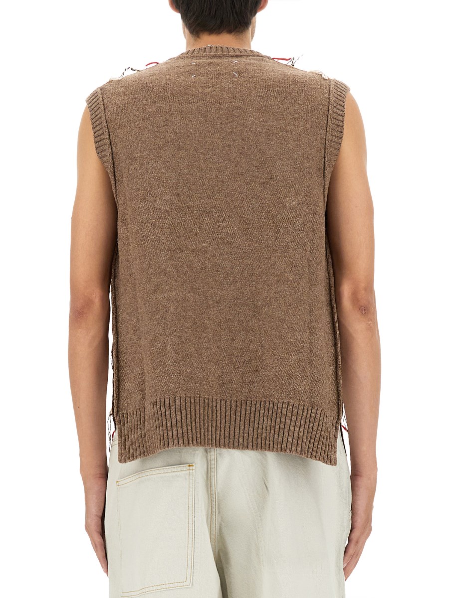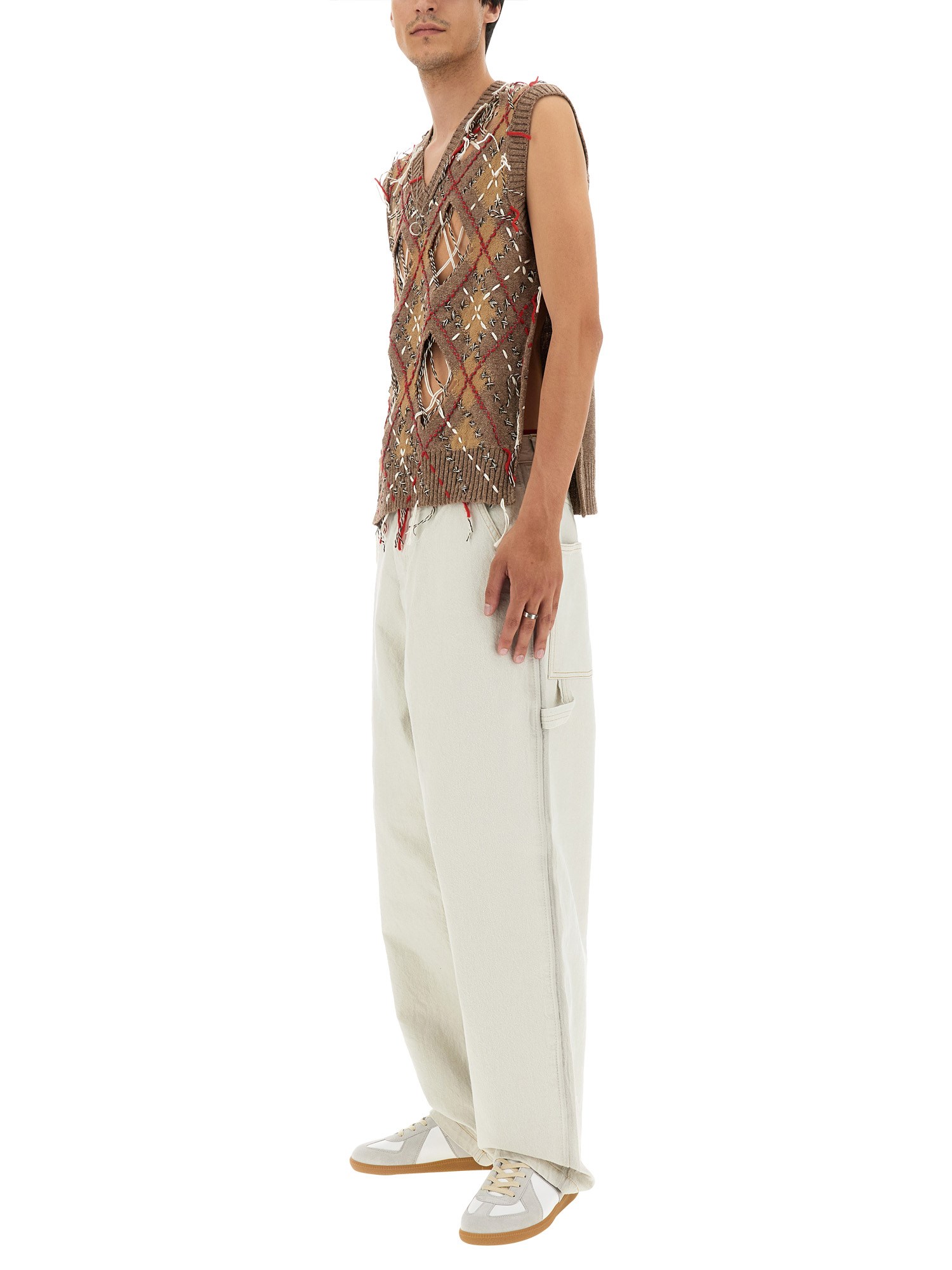 Caldo e leggero, questo gilet di Maison Margiela è realizzato in misto alpaca e lana. Il motivo a rombi è una firma e aggiunge un tocco di eleganza al capo. Un look classico che diventerà sicuramente il vostro preferito. Il gilet senza maniche è realizzato in misto lana, per un'atmosfera accogliente e calda sia all'interno che all'esterno.