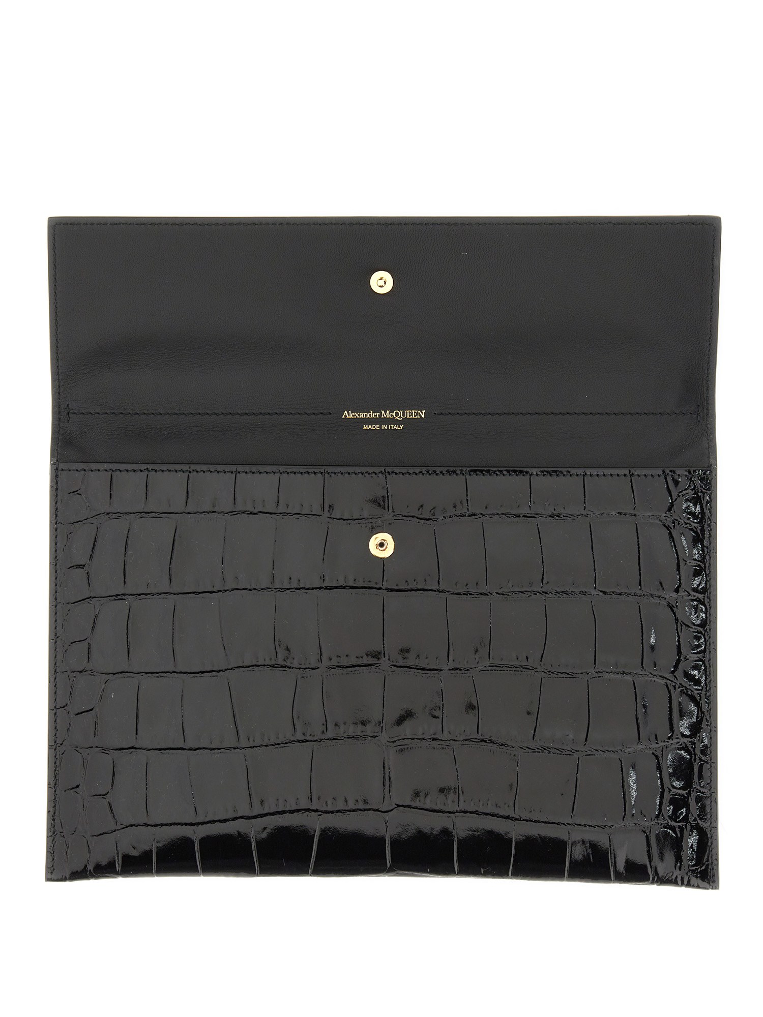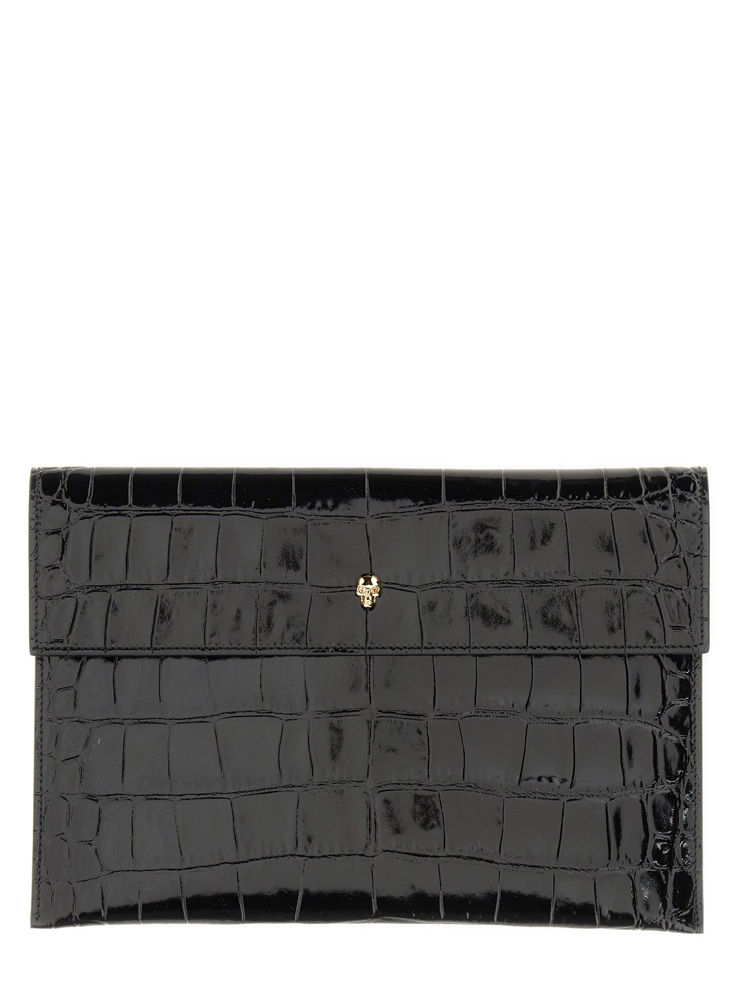 La Skull Clutch è una pochette per tutti i giorni di Alexander McQueen che vi terrà alla moda. Questa splendida e ben fatta clutch è realizzata in pelle di vitello di alta qualità. Ha una bella chiusura con bottone a pressione sul davanti e un'applicazione sulla parte superiore. La pochette è ideale per una serata in città o come borsa per tutti i giorni.