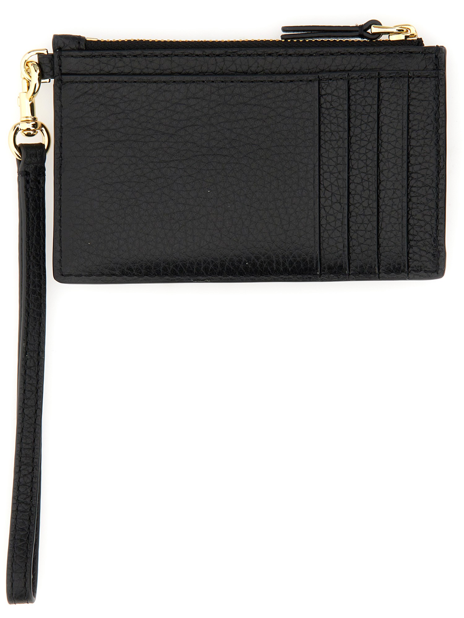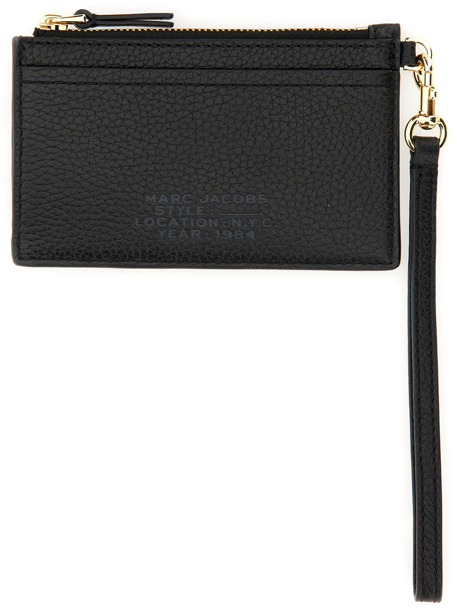 Un portacarte di Marc Jacobs realizzato in morbida pelle e dotato di un comodo cinturino regolabile. Il portacarte è dotato di un cinturino da polso rimovibile e presenta quattro scomparti per carte, due tasche esterne e una tasca centrale con cerniera.