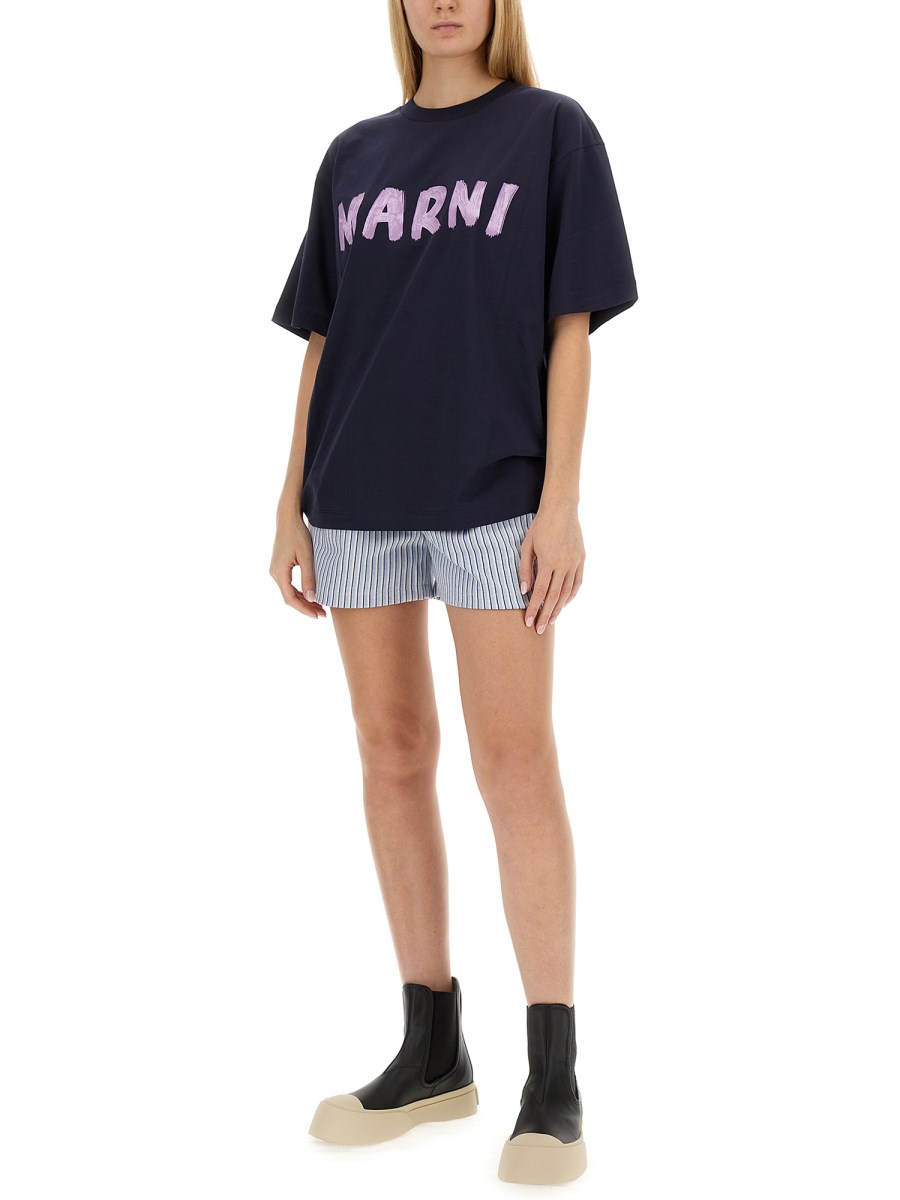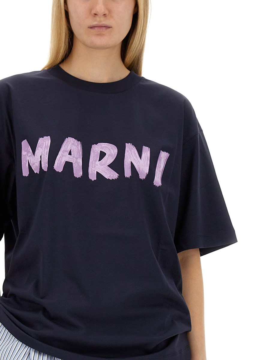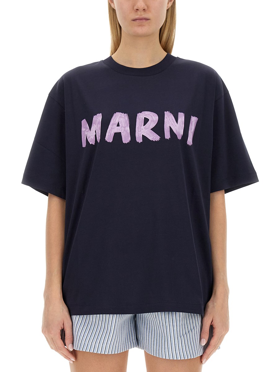 Vi presentiamo la raffinata T-shirt in cotone a girocollo di Marni, impreziosita da un'accattivante stampa frontale con logo che emana raffinatezza e stile. Realizzato con la massima precisione, questo lussuoso capo combina senza sforzo comfort ed eleganza, rendendolo un'aggiunta indispensabile al vostro guardaroba. Il morbido tessuto di cotone assicura un tocco delicato sulla pelle, mentre il design a girocollo aggiunge un tocco di fascino senza tempo.