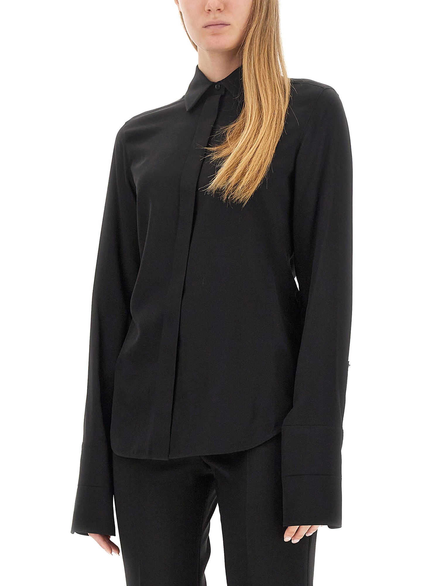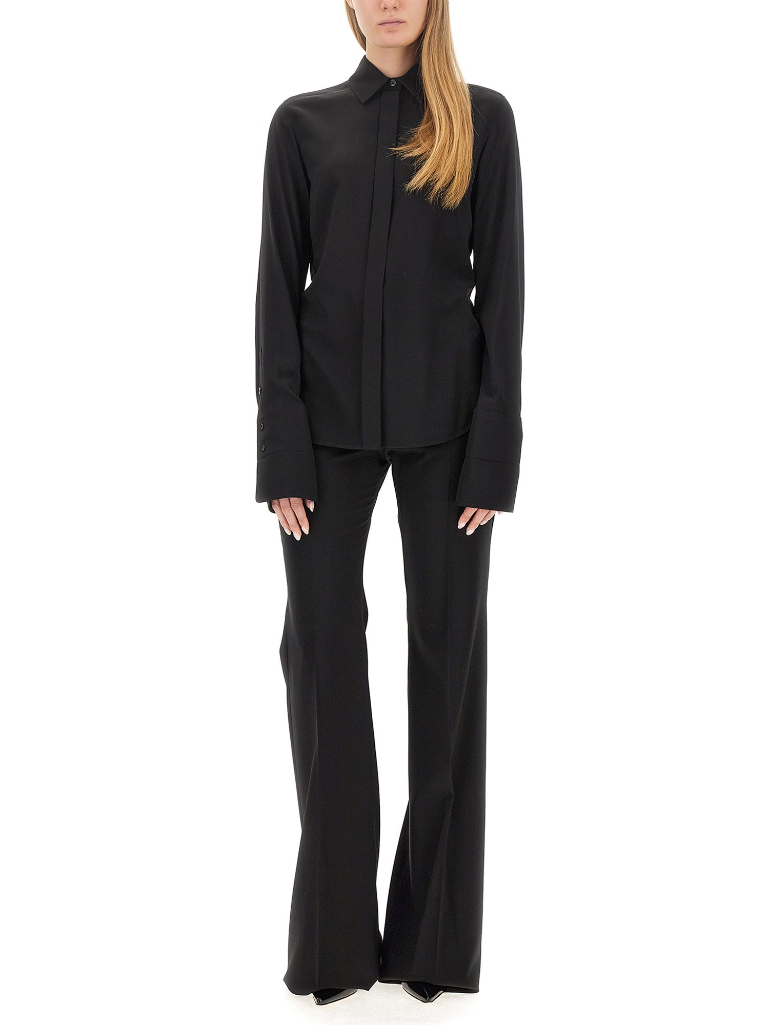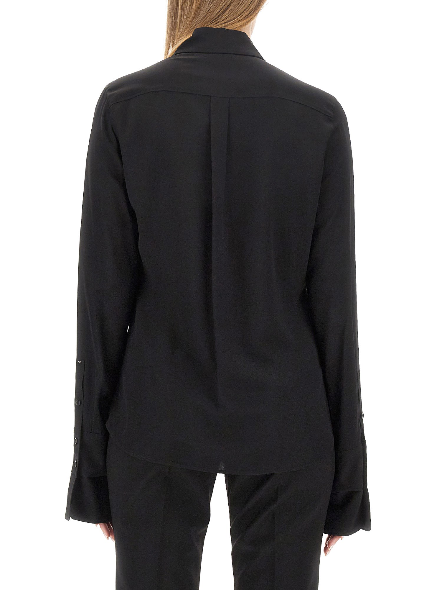 Questa camicia di Max Mara combina senza sforzo stile e comfort, rendendola un must-have nel guardaroba di ogni donna attenta alla moda. La texture liscia e morbida del tessuto di seta aggiunge un tocco di lusso, drappeggiando splendidamente sul corpo. Caratterizzata da un classico colore nero, questa camicia è perfetta sia per le occasioni formali che per quelle casual, offrendo opzioni di stile versatili. Il design raffinato prevede una vestibilità sartoriale che valorizza la silhouette e trasmette sicurezza.
