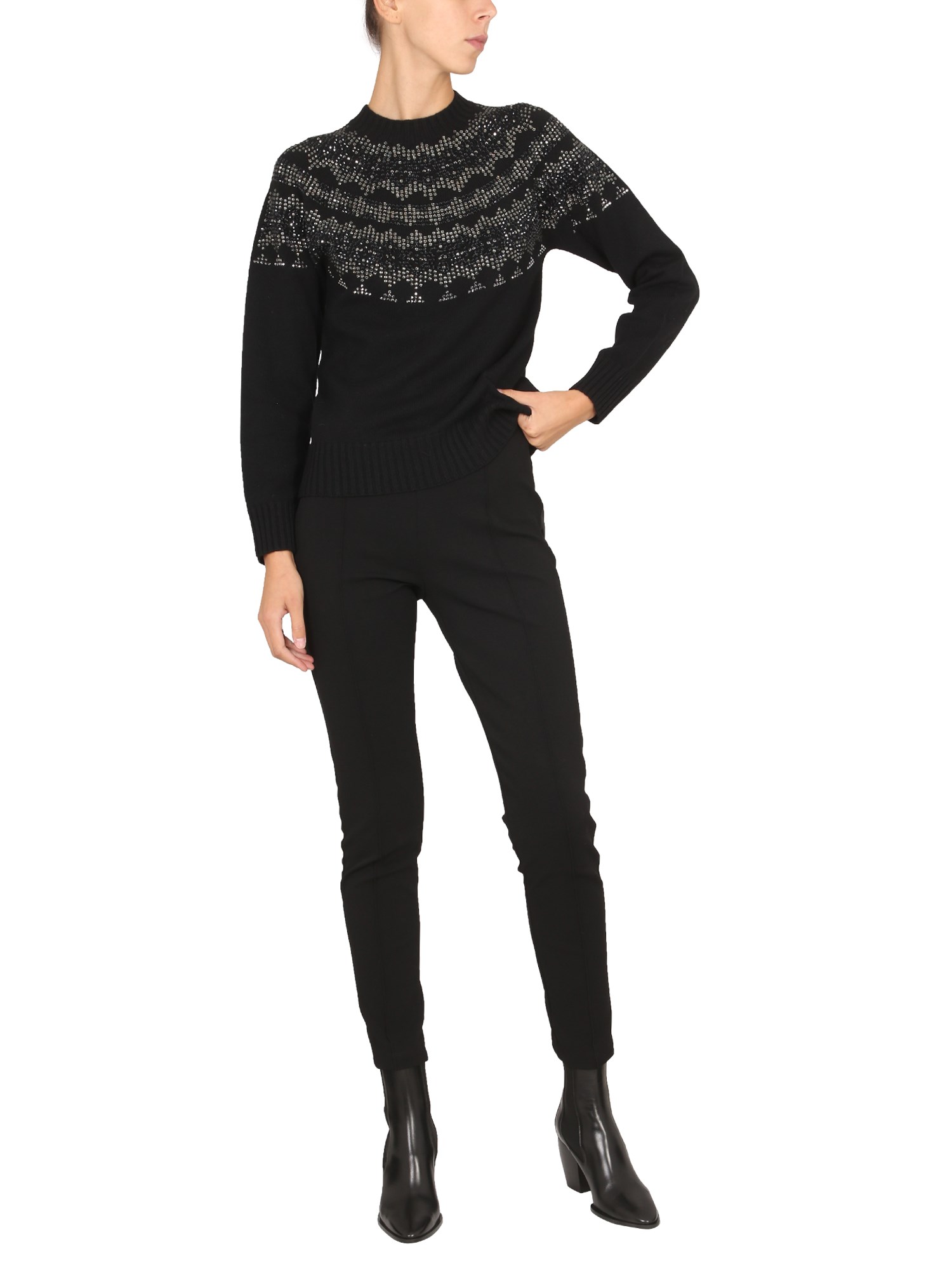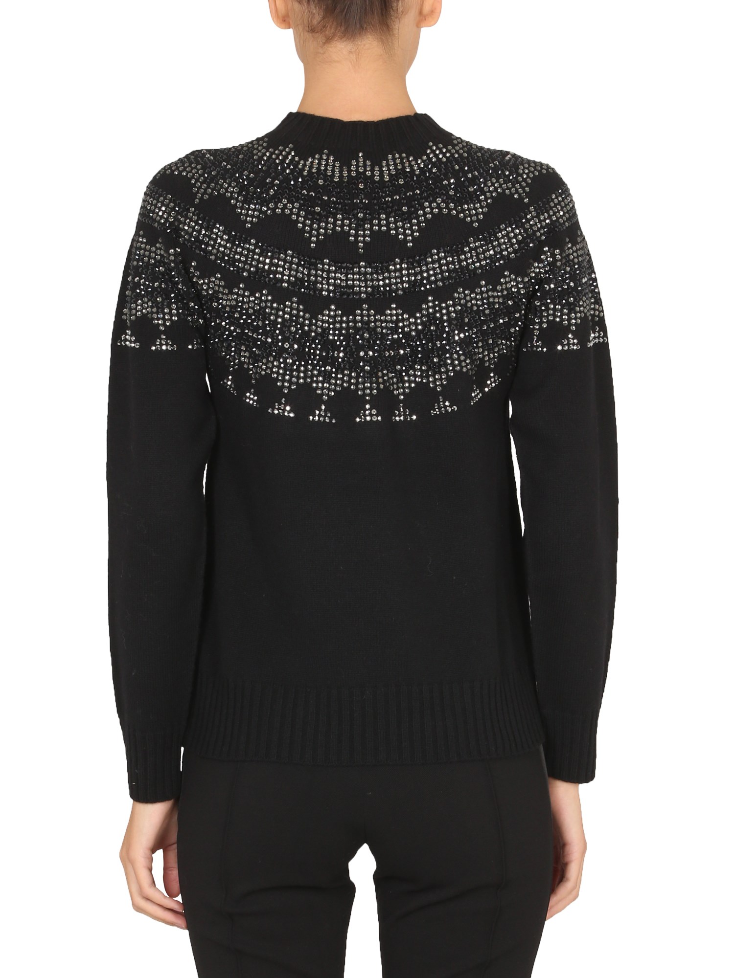 Il maglione a maniche lunghe di Max Mara è realizzato in 100% lana vergine e presenta un disegno folk di strass sul carré. I bordi a coste sono un complemento perfetto per il maglione. Il maglione ha un'aria casual e d'altri tempi, grazie alla comoda lana a coste. Il carré con strass bianchi e neri è bellissimo e si abbina perfettamente ai vostri jeans preferiti.