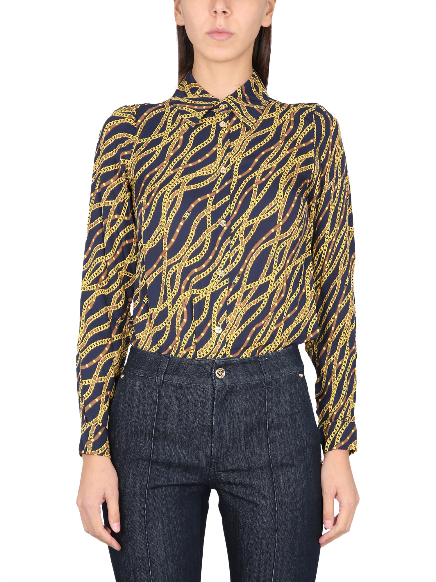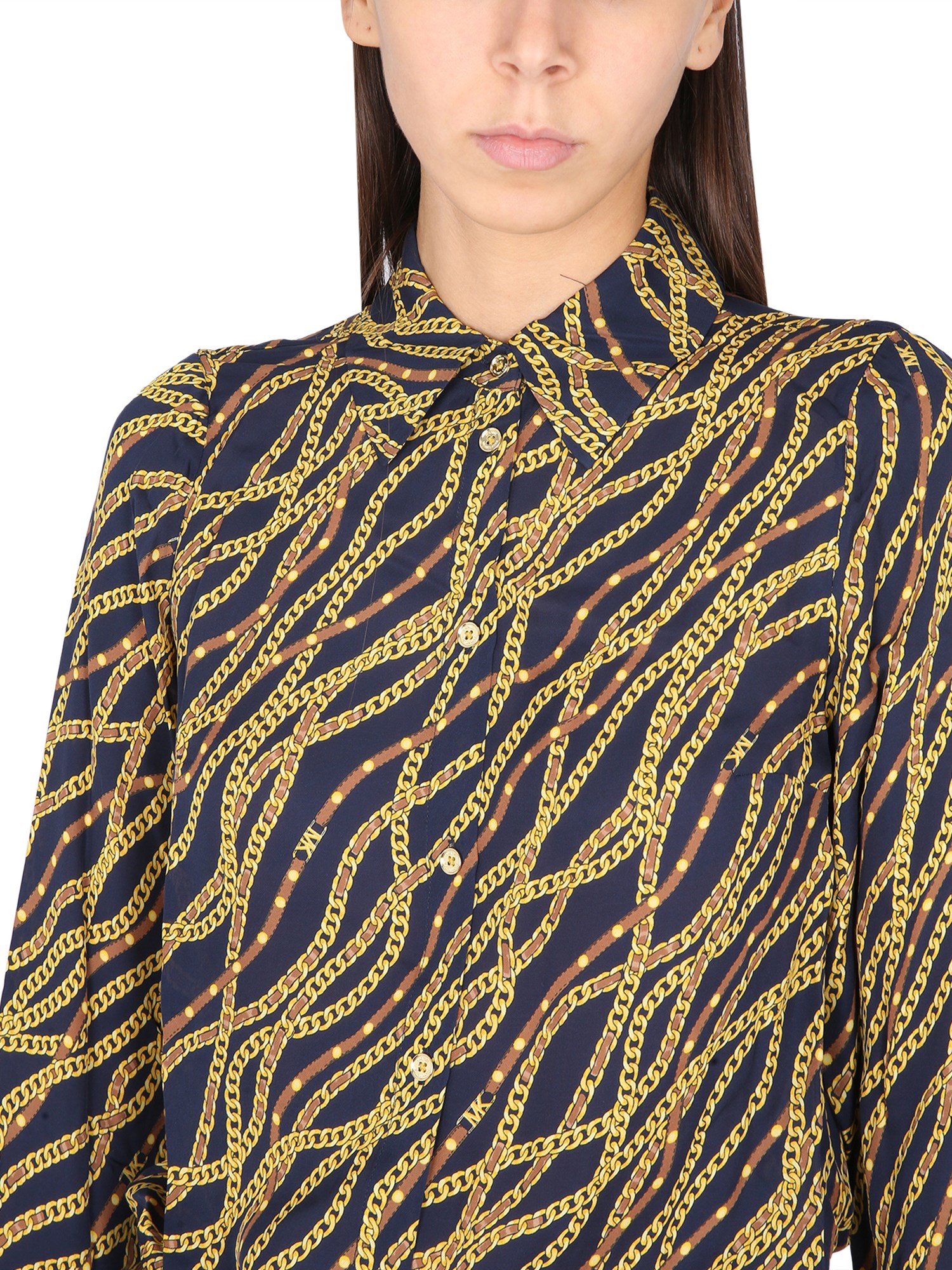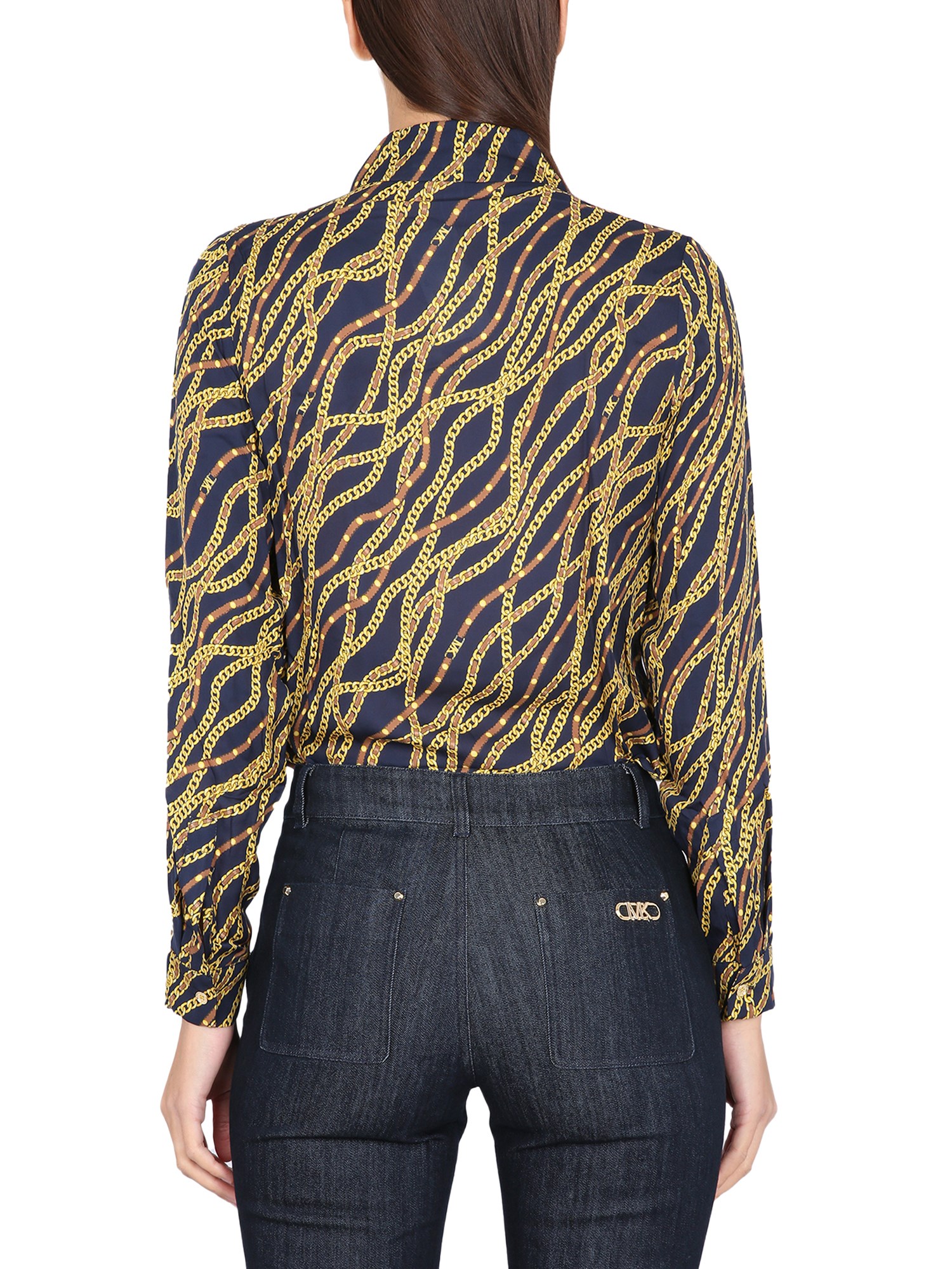 La camicia di Michael by Michael Kors è realizzata in seta di viscosa, più morbida della seta e dalla consistenza simile a quella del cotone, che la rende ideale per i mesi più caldi. Questa camicia in seta viscosa presenta una classica chiusura a bottoni sul colletto e una splendida stampa a catena a mano. È il capo perfetto da indossare con un paio di jeans scuri e delle ballerine in pelle scamosciata per una giornata fuori casa.