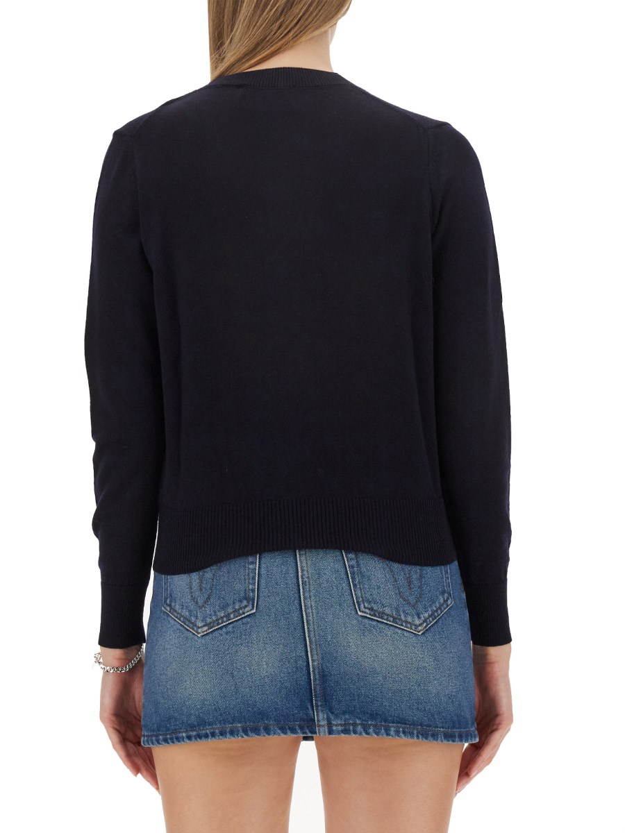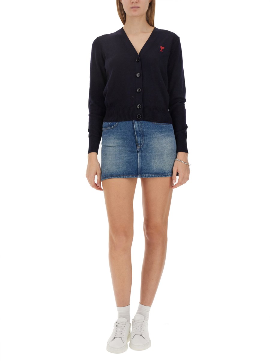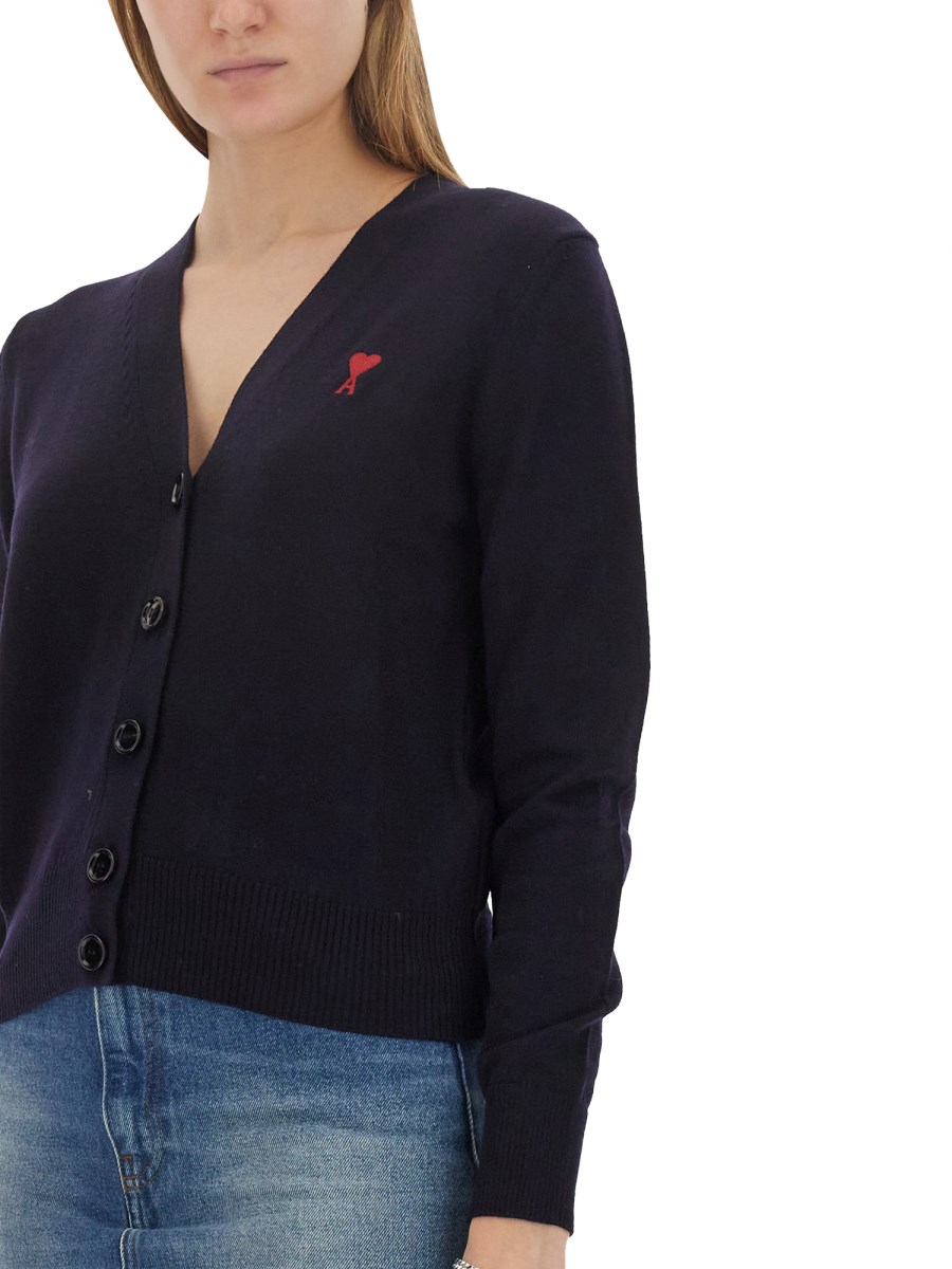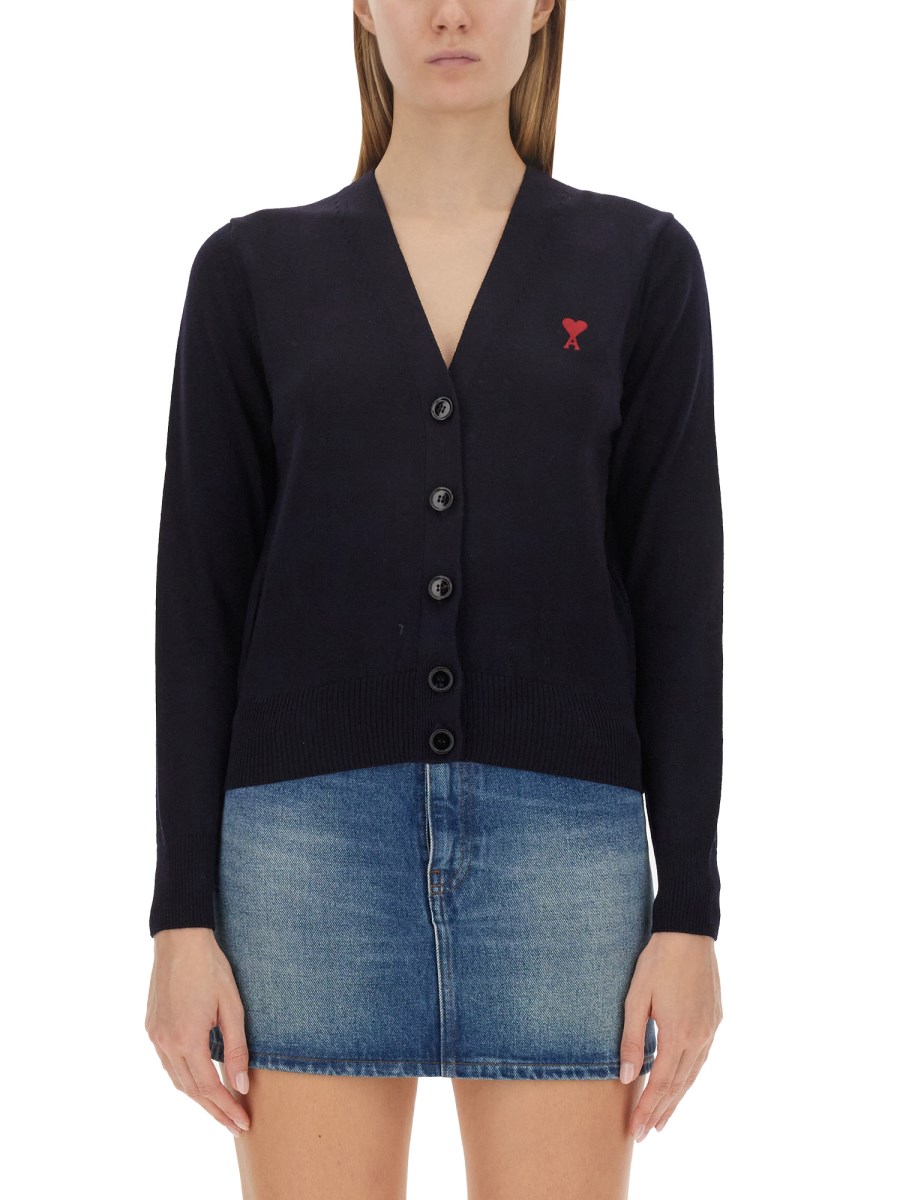 Vi presentiamo lo squisito cardigan da donna in lana con scollo a V e chiusura frontale a bottoni, meticolosamente realizzato da Ami Paris. Questo capo senza tempo emana eleganza e raffinatezza, rendendolo un'aggiunta indispensabile al guardaroba di ogni donna esigente. Impeccabilmente confezionato con lana pregiata, offre un comfort e un calore impareggiabili, elevando al contempo il vostro stile.
