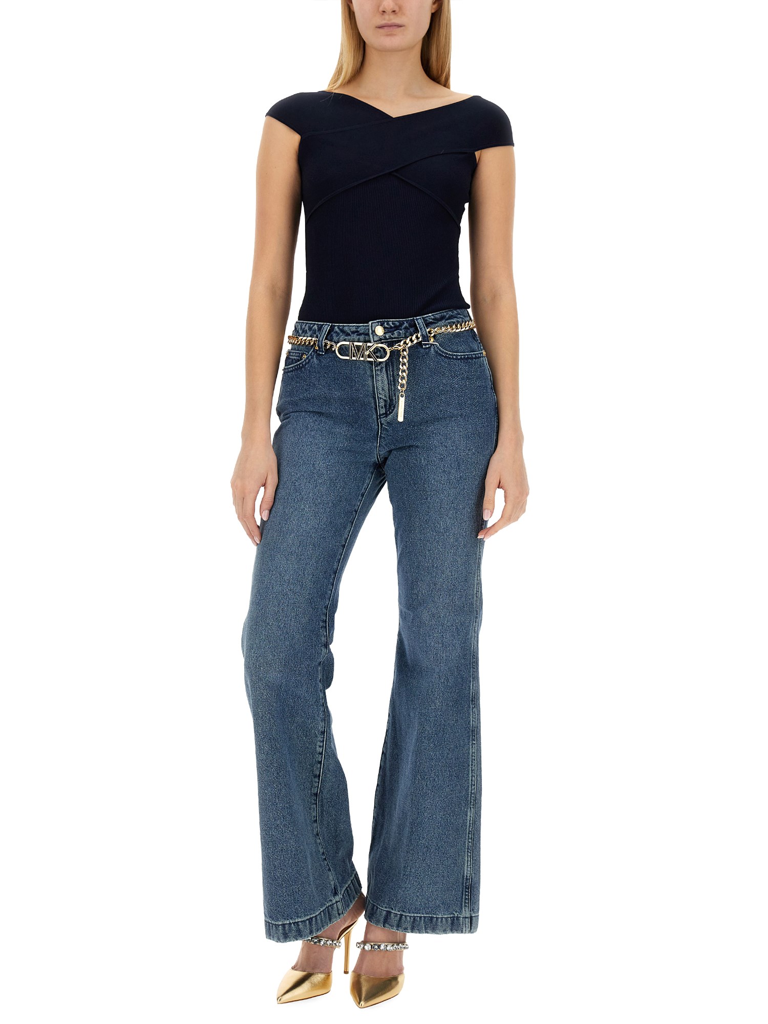 Questo paio di jeans di Michael by Michael Kors è stato progettato per accentuare le vostre curve e fornire una silhouette lusinghiera. Realizzati in cotone denim della migliore qualità, offrono un comfort e una durata impareggiabili e saranno un'aggiunta senza tempo al vostro guardaroba. La vestibilità svasata aggiunge un tocco di eleganza, mentre il dettaglio della cintura a catena aggiunge un tocco di raffinatezza, rendendo questi jeans un must-have per ogni individuo alla moda.