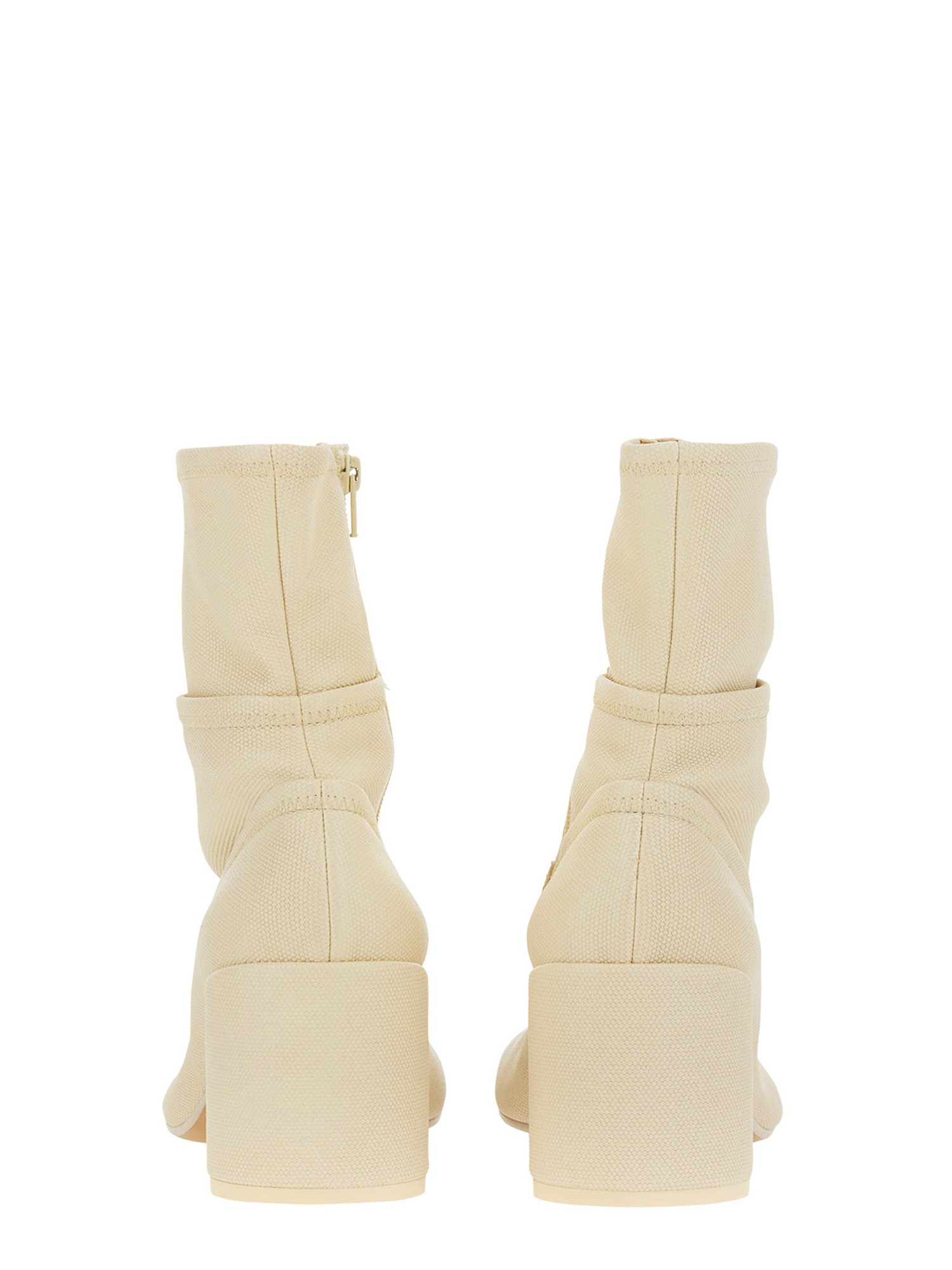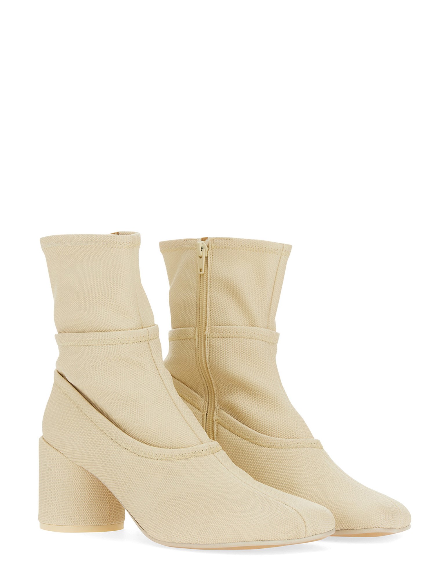 Realizzati in tela, gli stivaletti Anatomic sono ornati da linee di cucitura che creano l'impressione di molteplici iterazioni dello stile Anatomic. Caratterizzati da un tacco curvo tonale di 7 cm e da una zip interna laterale. La firma discreta ma distinta di MM6, una linea di cucitura orizzontale bianca, è presente sul retro delle scarpe.