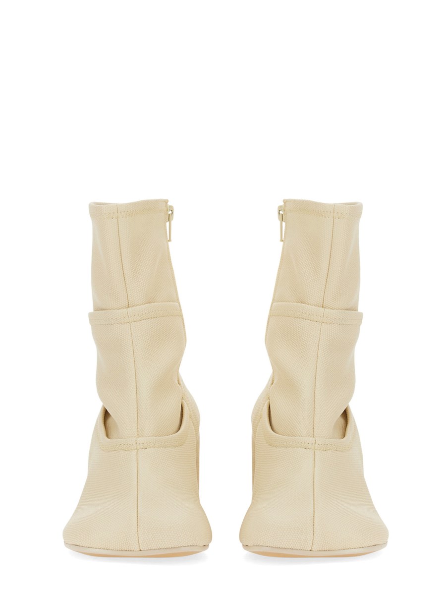 Realizzati in tela, gli stivaletti Anatomic sono ornati da linee di cucitura che creano l'impressione di molteplici iterazioni dello stile Anatomic. Caratterizzati da un tacco curvo tonale di 7 cm e da una zip interna laterale. La firma discreta ma distinta di MM6, una linea di cucitura orizzontale bianca, è presente sul retro delle scarpe.