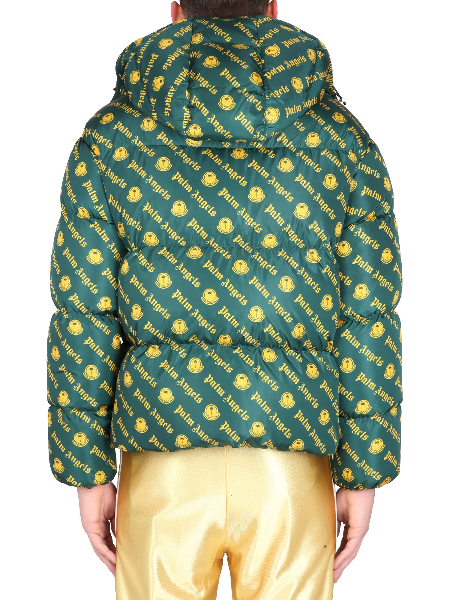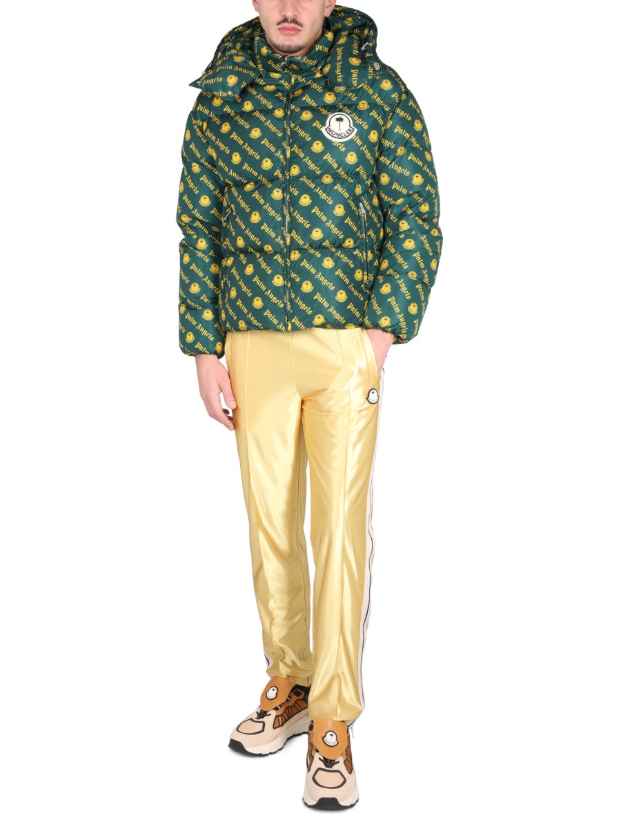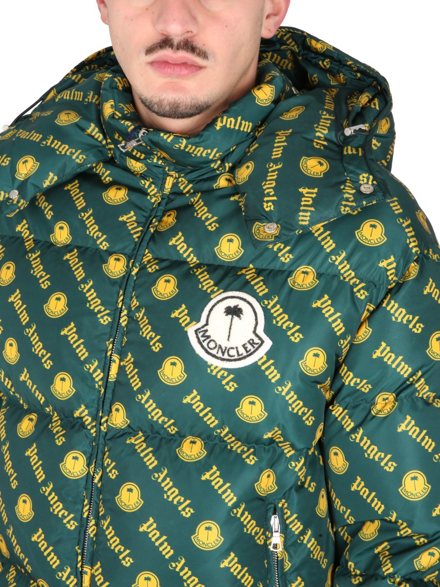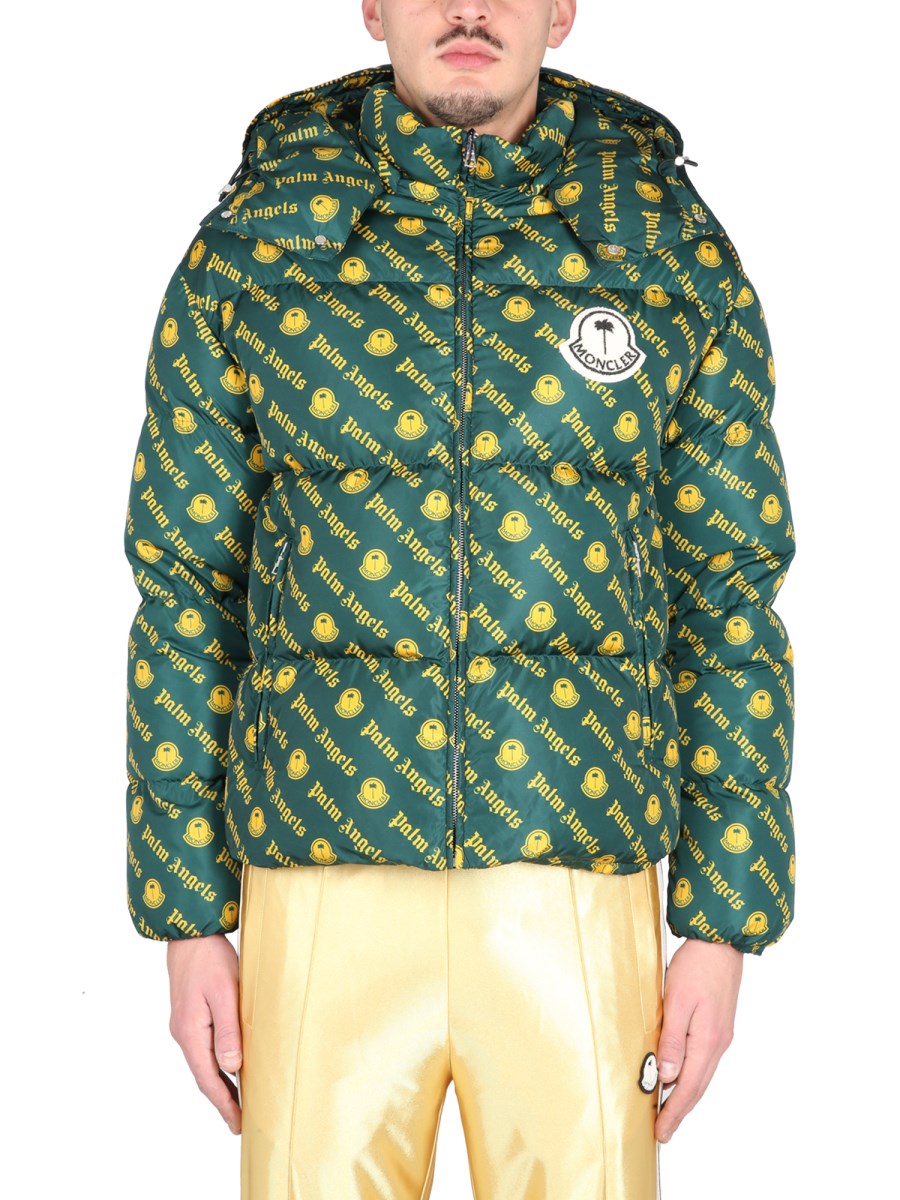 Il piumino Thompson, dal design avvolgente, ha una vestibilità ampia ed è arricchito da un grande cappuccio in piuma. Realizzato in nylon tecnico, il piumino corto presenta una stampa diagonale all-over con il logo della collaborazione Moncler Genius. La giacca presenta un'etichetta interna Palm Angels® raffigurante un campo da hockey su prato.