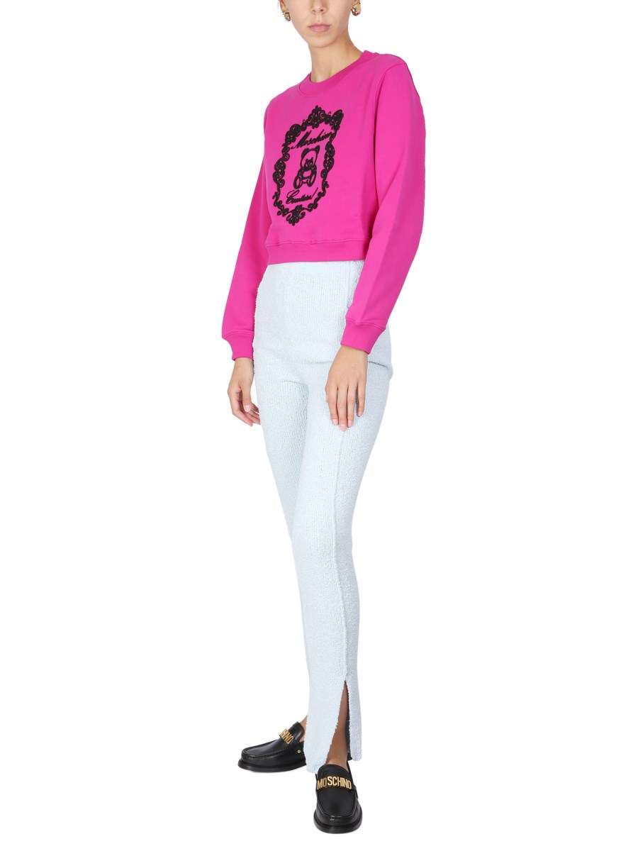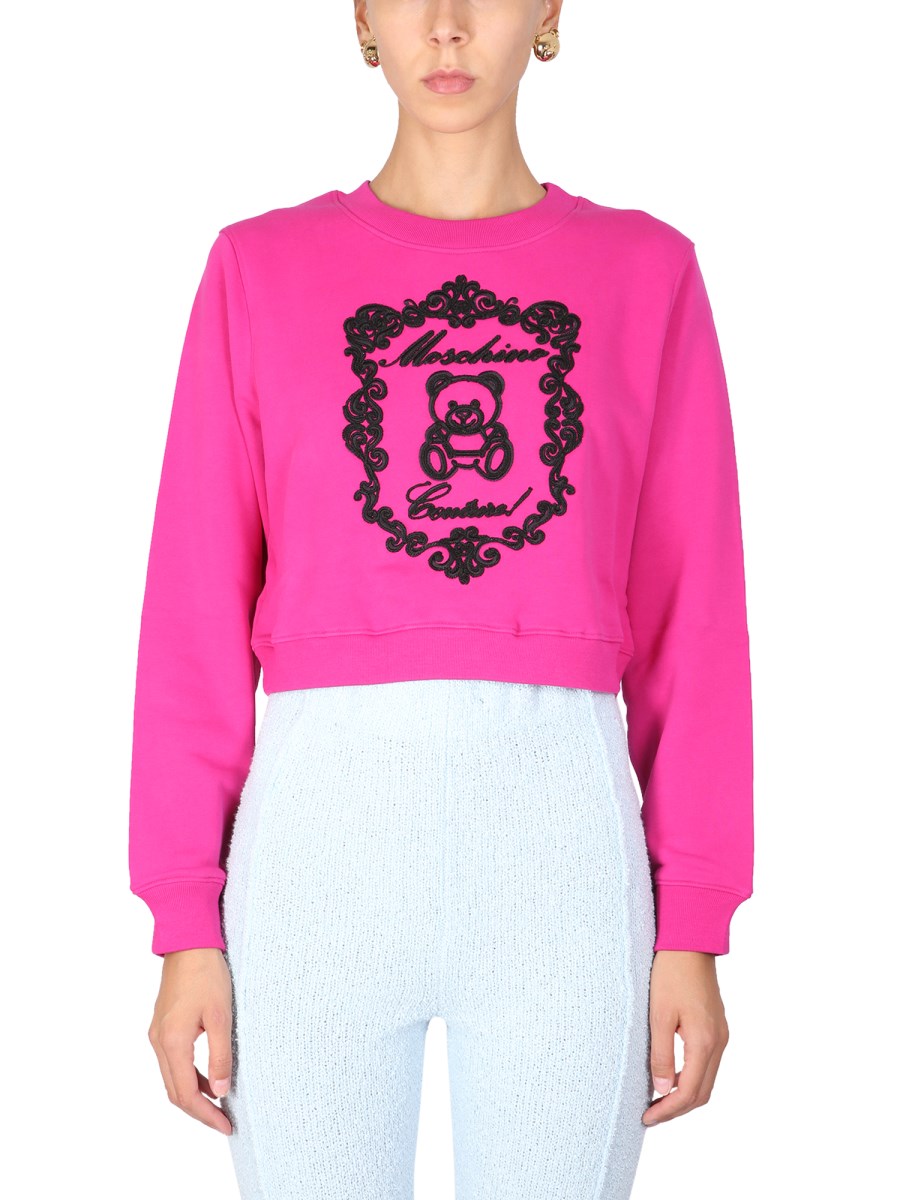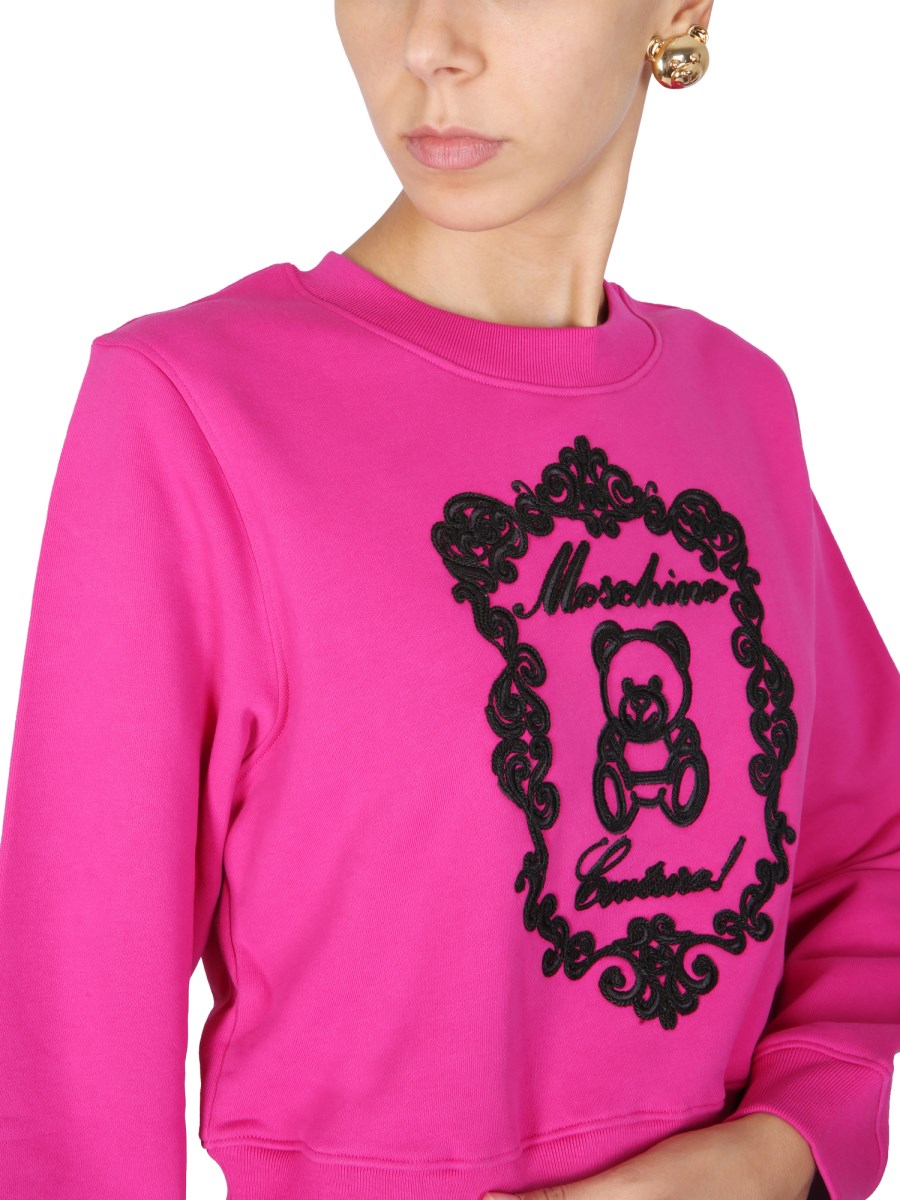 Questa felpa della maison Moschino è un capo essenziale del guardaroba, che aggiunge un tocco di freschezza ai look di squadra. Realizzata in puro cotone, presenta un girocollo e maniche lunghe. Accattivante e preziosa, la t-shirt regular fit presenta un ricamo con logo Teddy sul davanti. È un capo semplice, facile e comodo.
