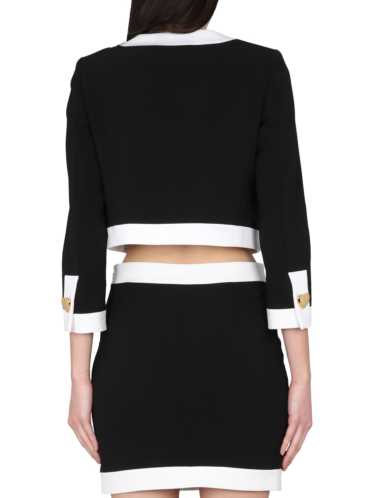 Questa adorabile giacca di Moschino è perfetta per l'inverno. È realizzata in morbido e caldo pile che vi terrà al caldo e al riparo. Presenta una chiusura frontale con ganci nascosti, bottoni decorativi a cuore e spalline imbottite. La giacca ha una silhouette cropped e presenta uno scollo rotondo con maniche lunghe.