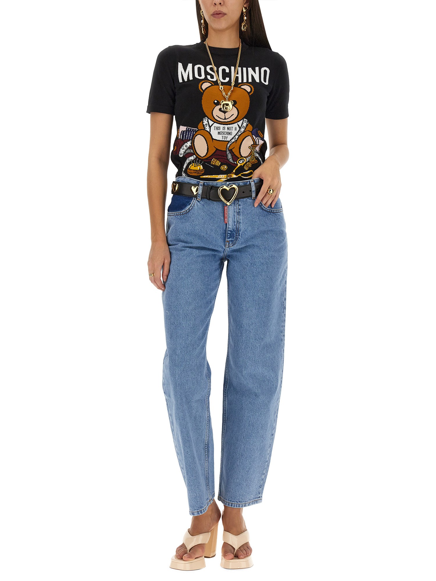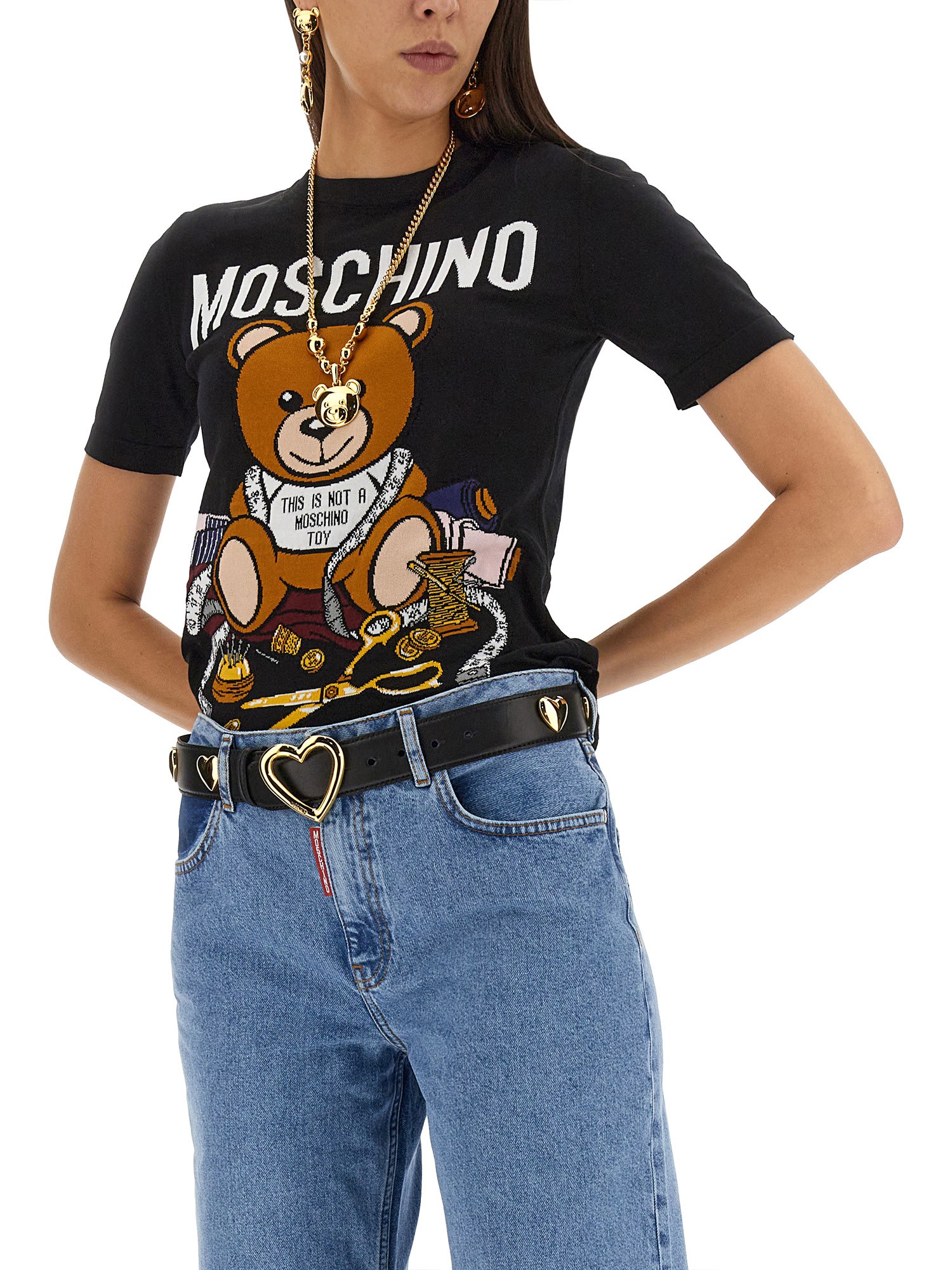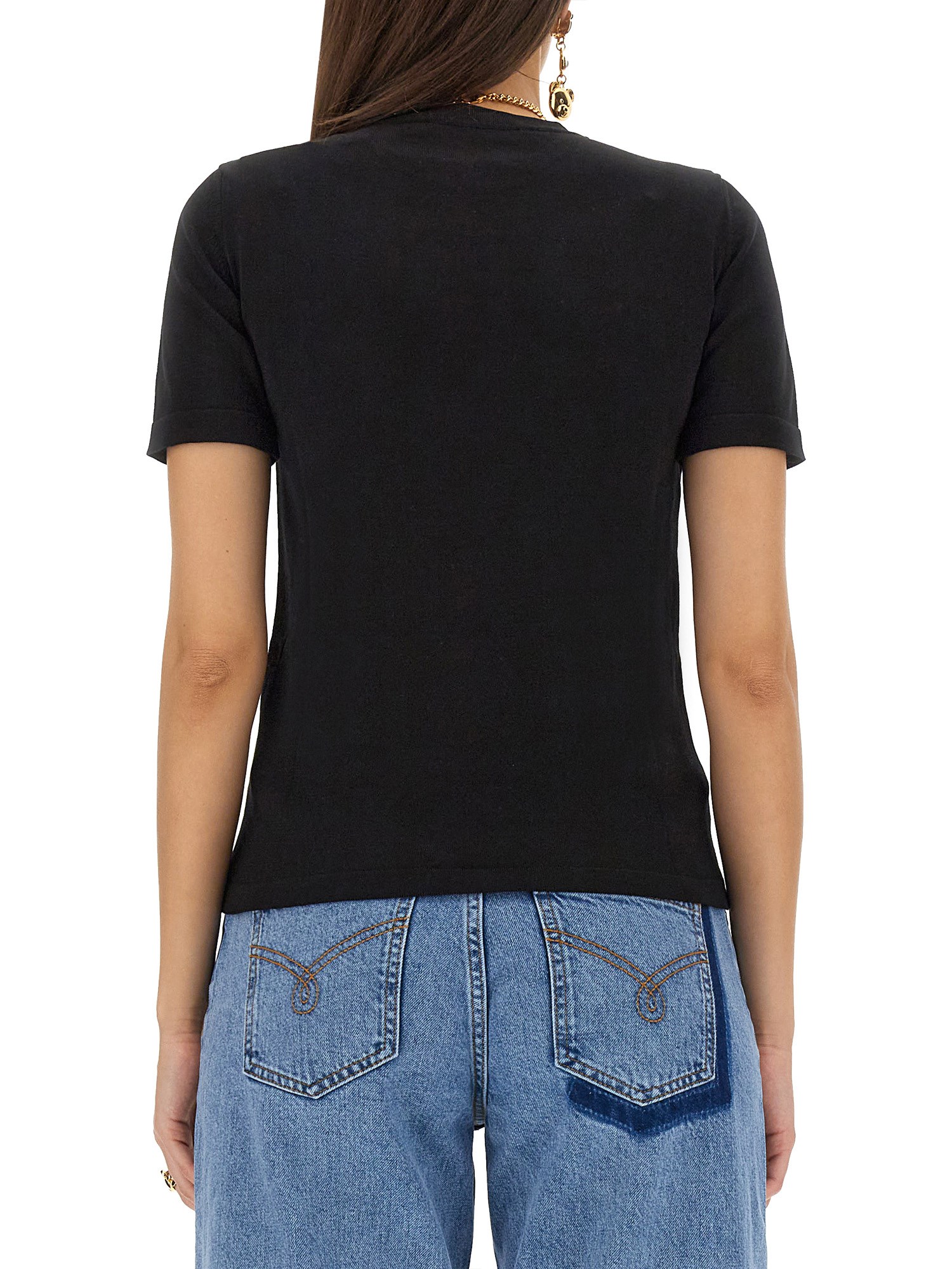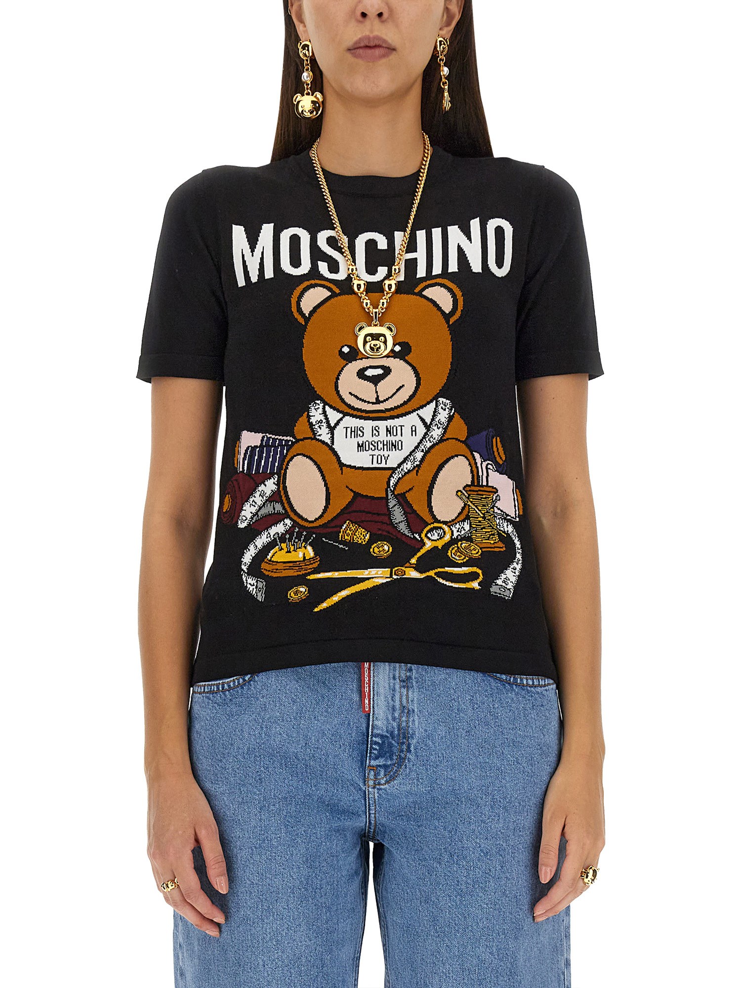 Vi presentiamo la raffinata T-shirt in cotone a girocollo di Moschino, impreziosita da un'accattivante stampa di orsetti. Realizzato con la massima precisione, questo capolavoro nero emana opulenza e raffinatezza. Immergetevi in un comfort senza pari, mentre il morbido tessuto accarezza delicatamente la vostra pelle. Elevate il vostro guardaroba con questo lussuoso capo d'abbigliamento.