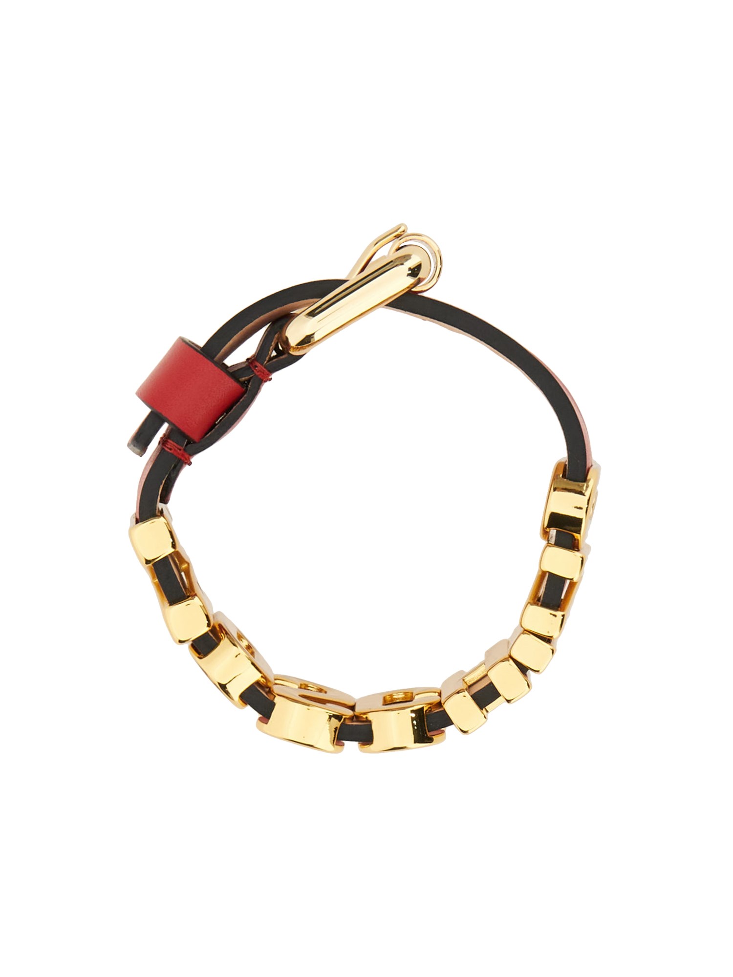 Questo splendido braccialetto di Moschino combina una lussuosa pelle rossa con una scritta dorata, creando un pezzo davvero notevole che eleverà senza sforzo qualsiasi outfit. La texture liscia e la sensazione di morbidezza della pelle assicurano una vestibilità confortevole al polso, rendendolo adatto all'uso quotidiano.