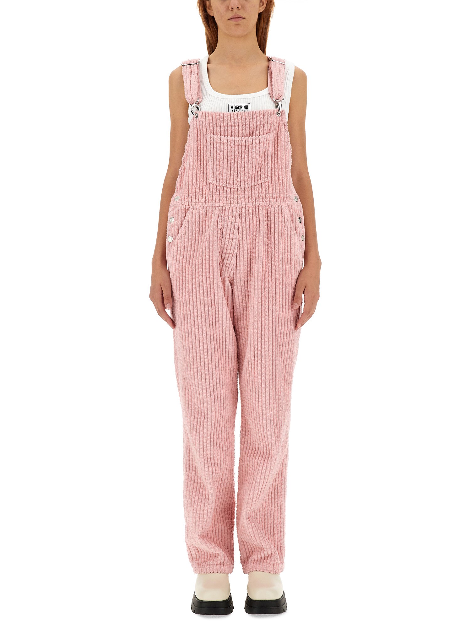 Questa salopette in velluto a coste di Moschino Jeans è perfetta per chi cerca un look casual e alla moda. Il velluto a coste è realizzato al 100% in puro cotone ed è stato cucito insieme con filo rosa chiaro. Il tessuto a coste è stato tagliato come una salopette e presenta due tasche sul davanti e due sul retro.