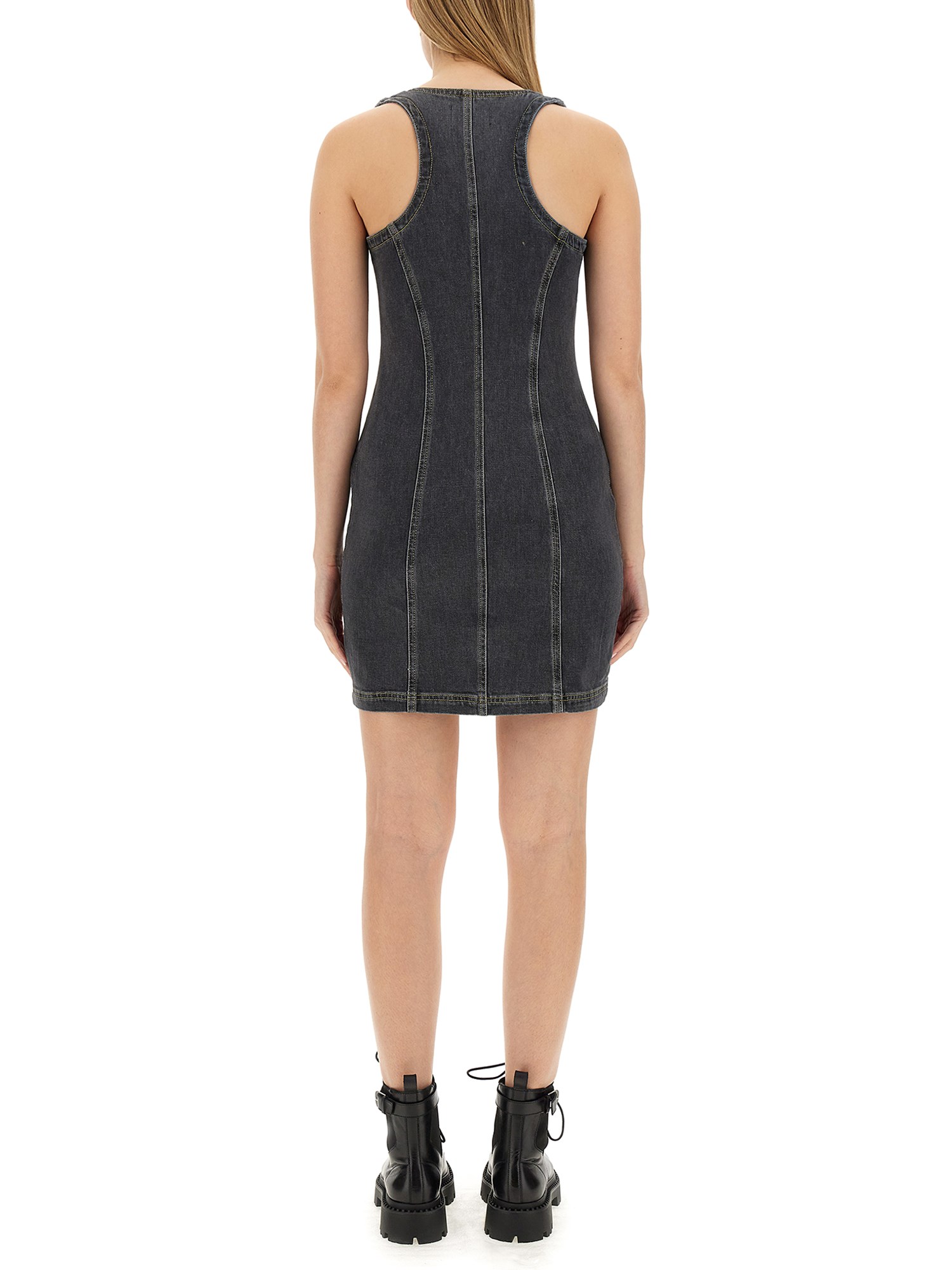 Questo abito di Moschino Jeans è un mix perfetto di comfort e raffinatezza. Il design senza maniche consente di muoversi liberamente, mentre lo scollo a V aggiunge un tocco di fascino. La chiusura frontale con cerniera assicura una vestibilità perfetta, mentre il tessuto in cotone denim di prima qualità offre una sensazione di lusso sulla pelle.