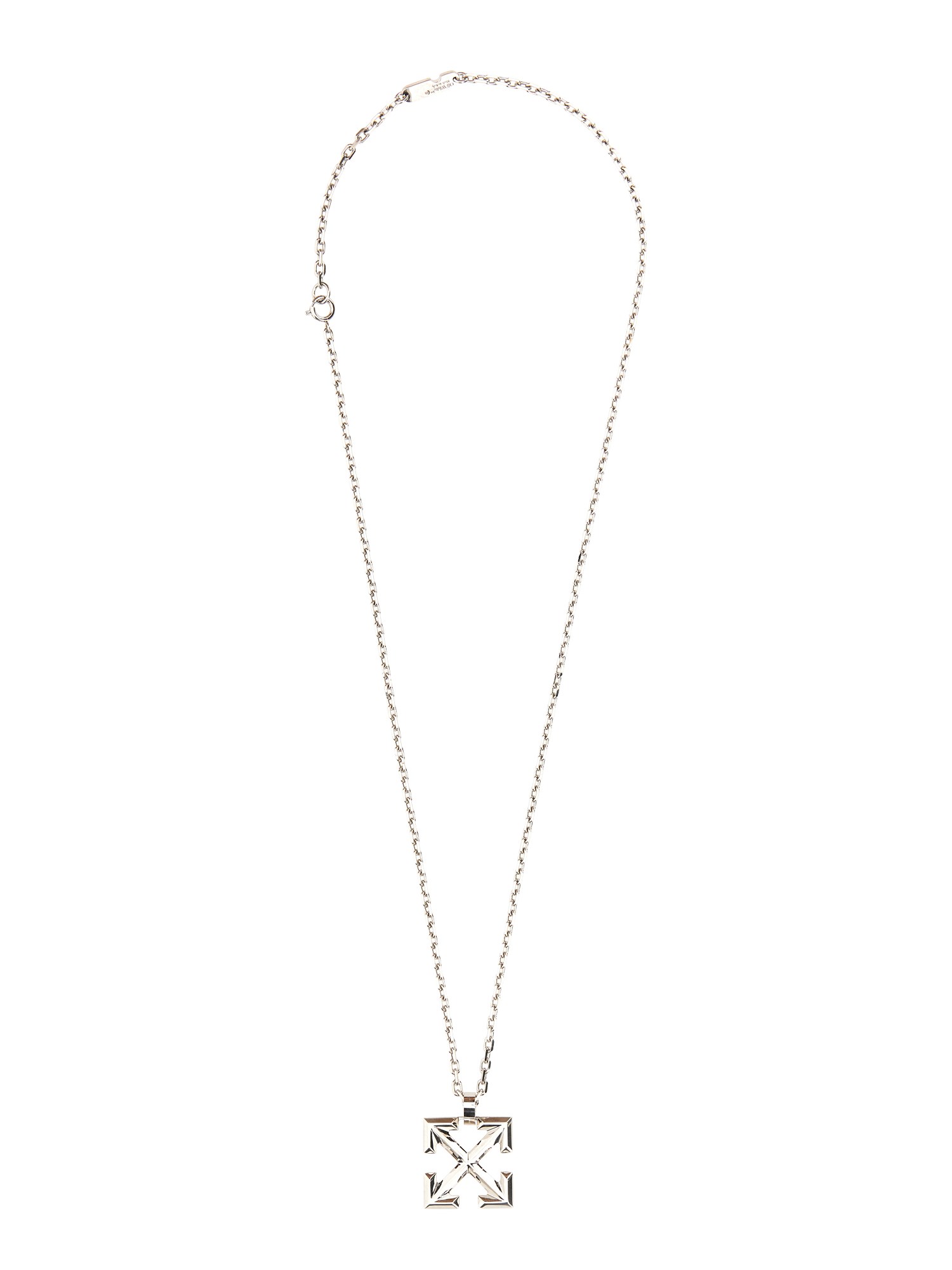La collana con ciondolo a forma di freccia con chiusura a gancio di Off-White è un accessorio delicato e semplice, ideale per essere abbinato o per aggiungere un tocco di colore a un outfit. Si tratta di un ciondolo in argento sterling con chiusura a gancio a forma di freccia, circondato da un gruppo di smalti neri. La collana è in taglia unica e può essere indossata lunga o corta.