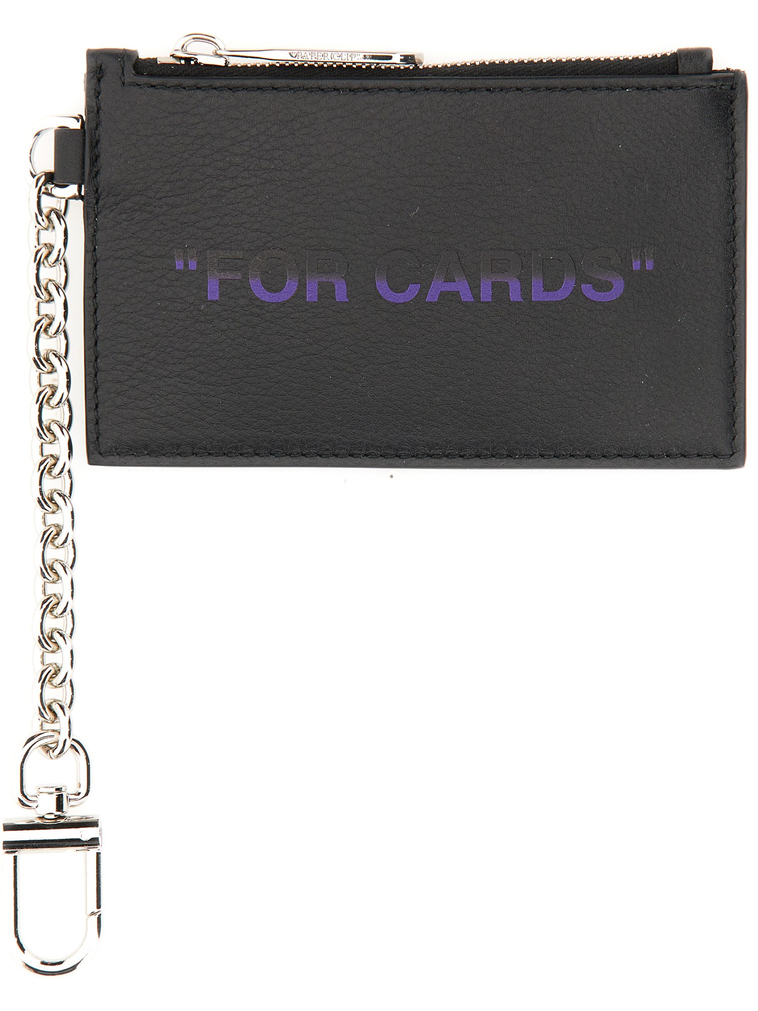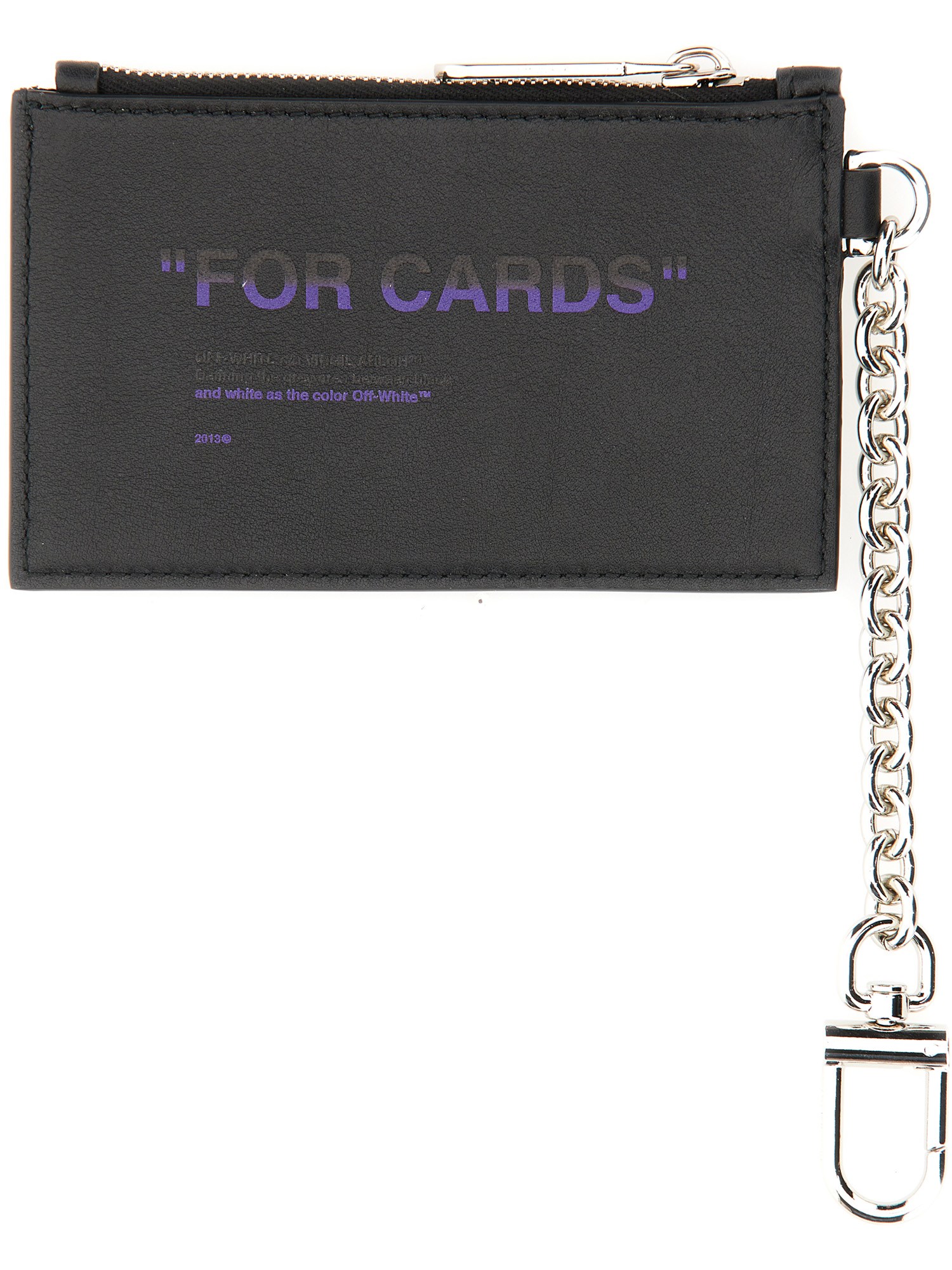 Questo piccolo portacarte nero di Off-White ha una chiusura a zip in pelle con moschettone. Il portacarte è dotato di un piccolo lembo pieghevole che può essere fissato con un moschettone o una spilla da balia. Il portacarte può anche essere facilmente infilato nella tasca posteriore di un paio di jeans o di altri pantaloni.