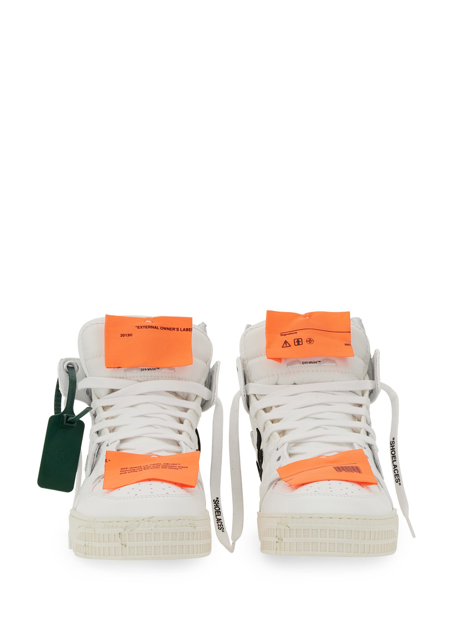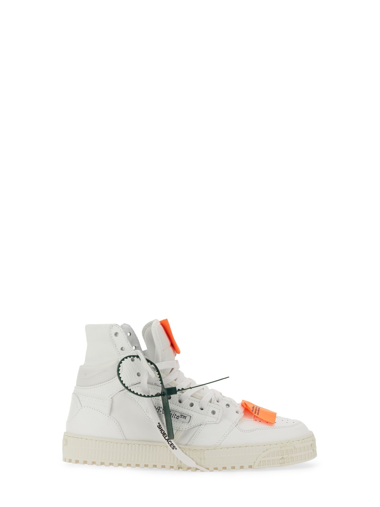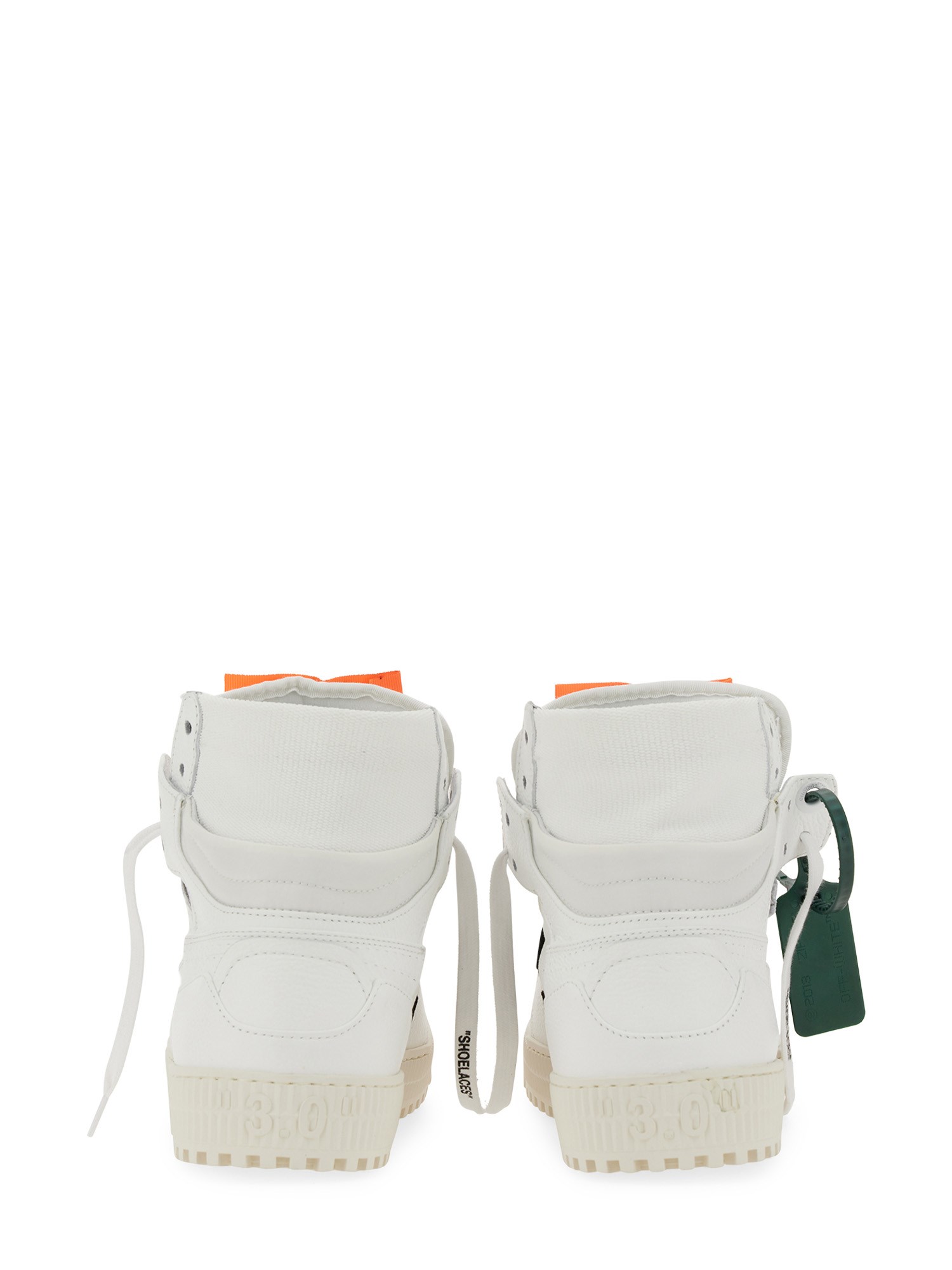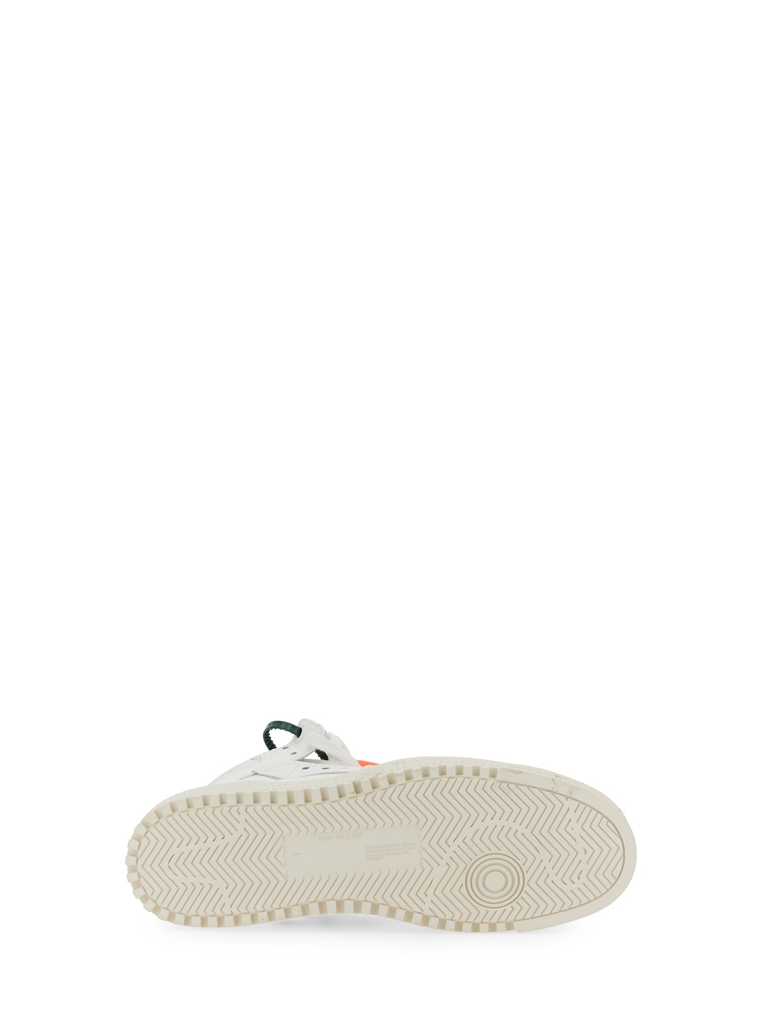 Sneakers alte "Off-Court" 3.0 in bianco con logo Off-White™ su un lato e patch a forma di freccia arancione sull'altro. Etichette nere in dettaglio. Suola in gomma bianca. Chiusura con lacci bianchi.