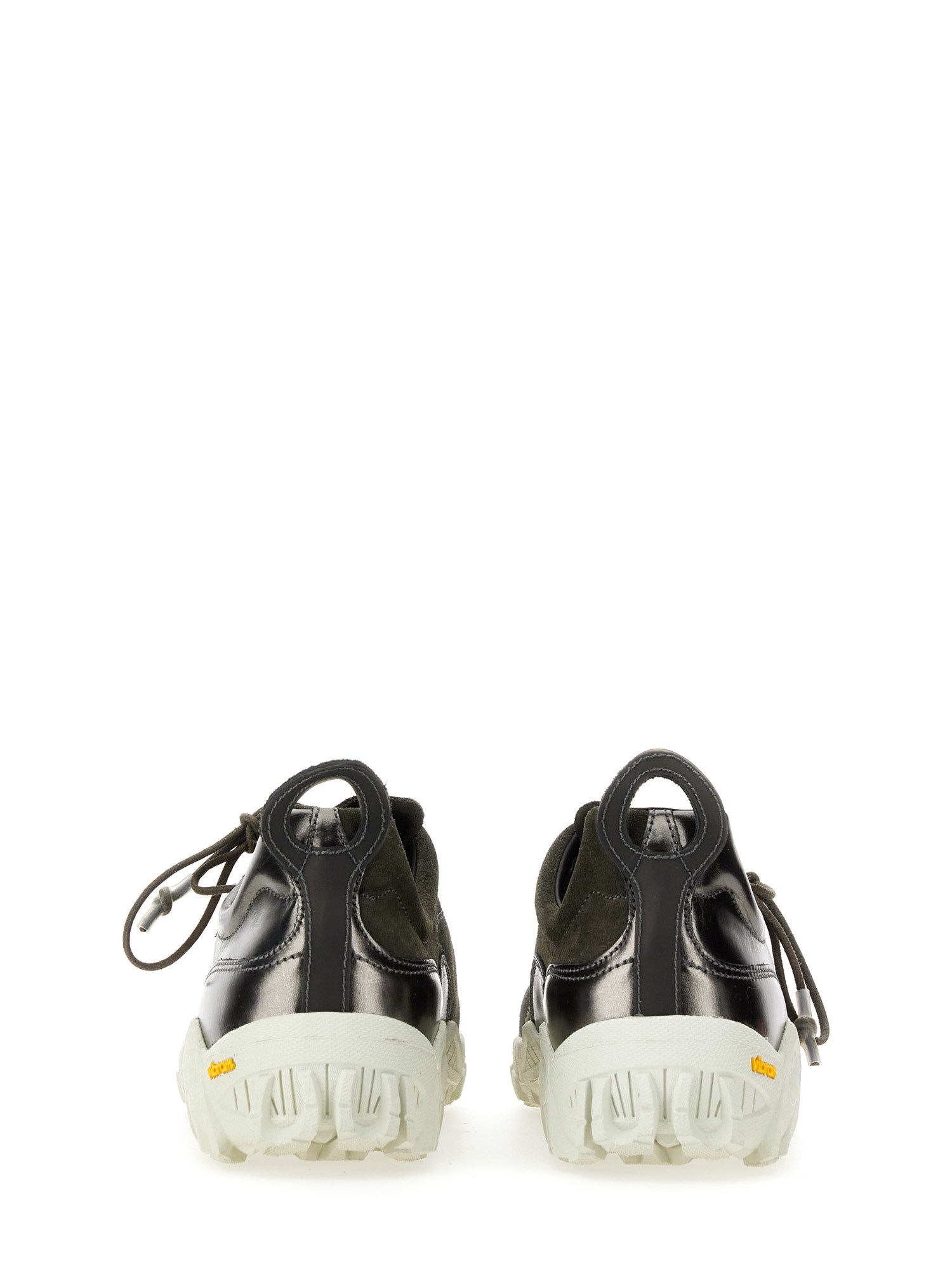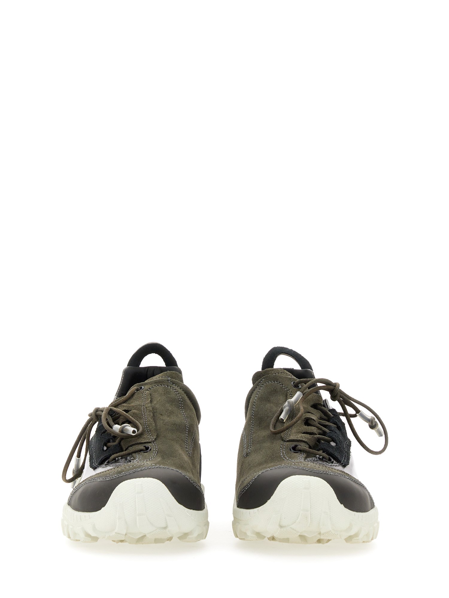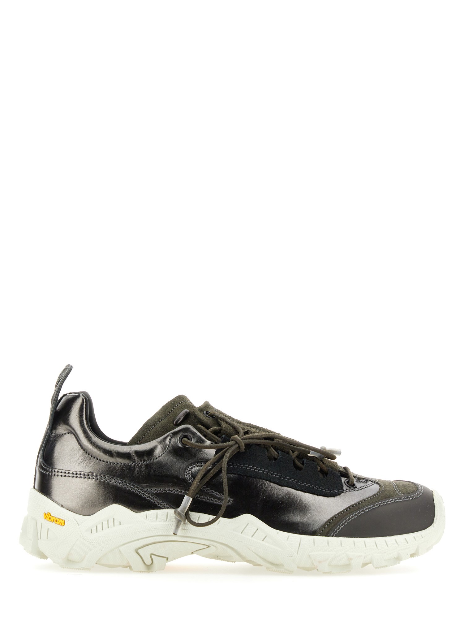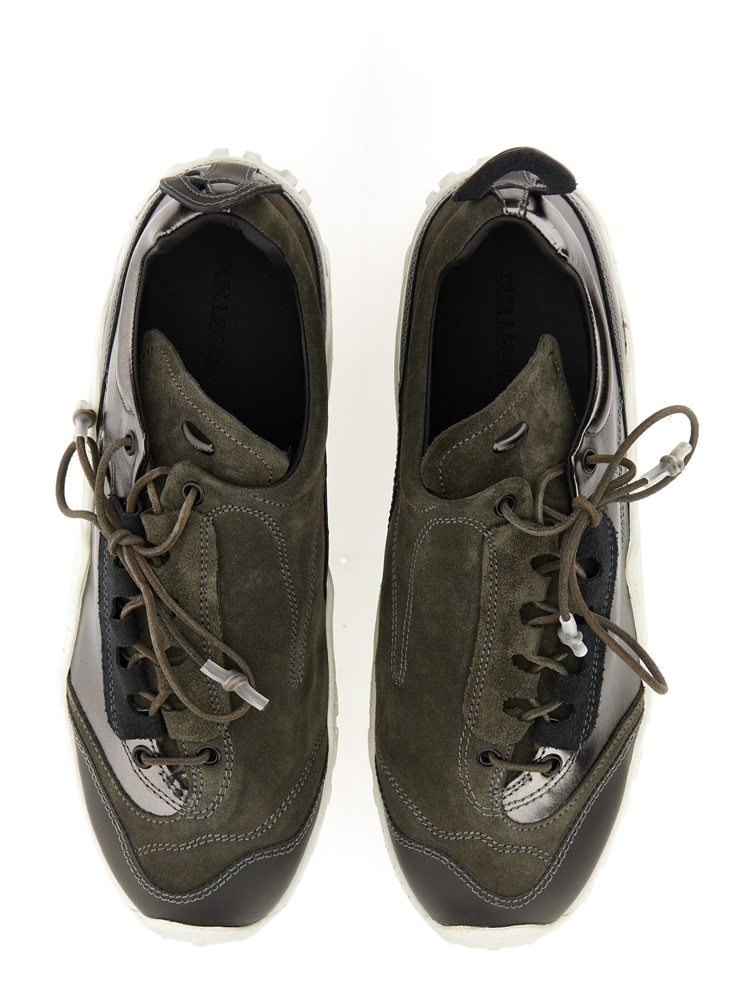 Realizzate in pelle scamosciata e metallizzata con pannelli a contrasto, le Gabe hanno una calzata generosa e presentano un'allacciatura asimmetrica, lacci in pelle arrotondati con punte rivestite in gomma, un puntale in poliuretano a contrasto, una suola Vibram, un tiretto ovale sul tallone e un rivetto in metallo OUR LEGACY sulla linguetta.