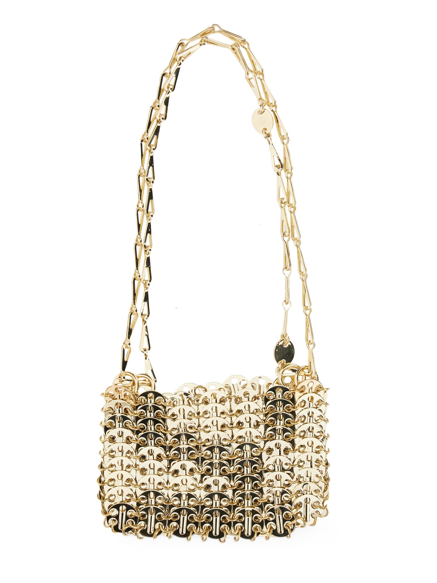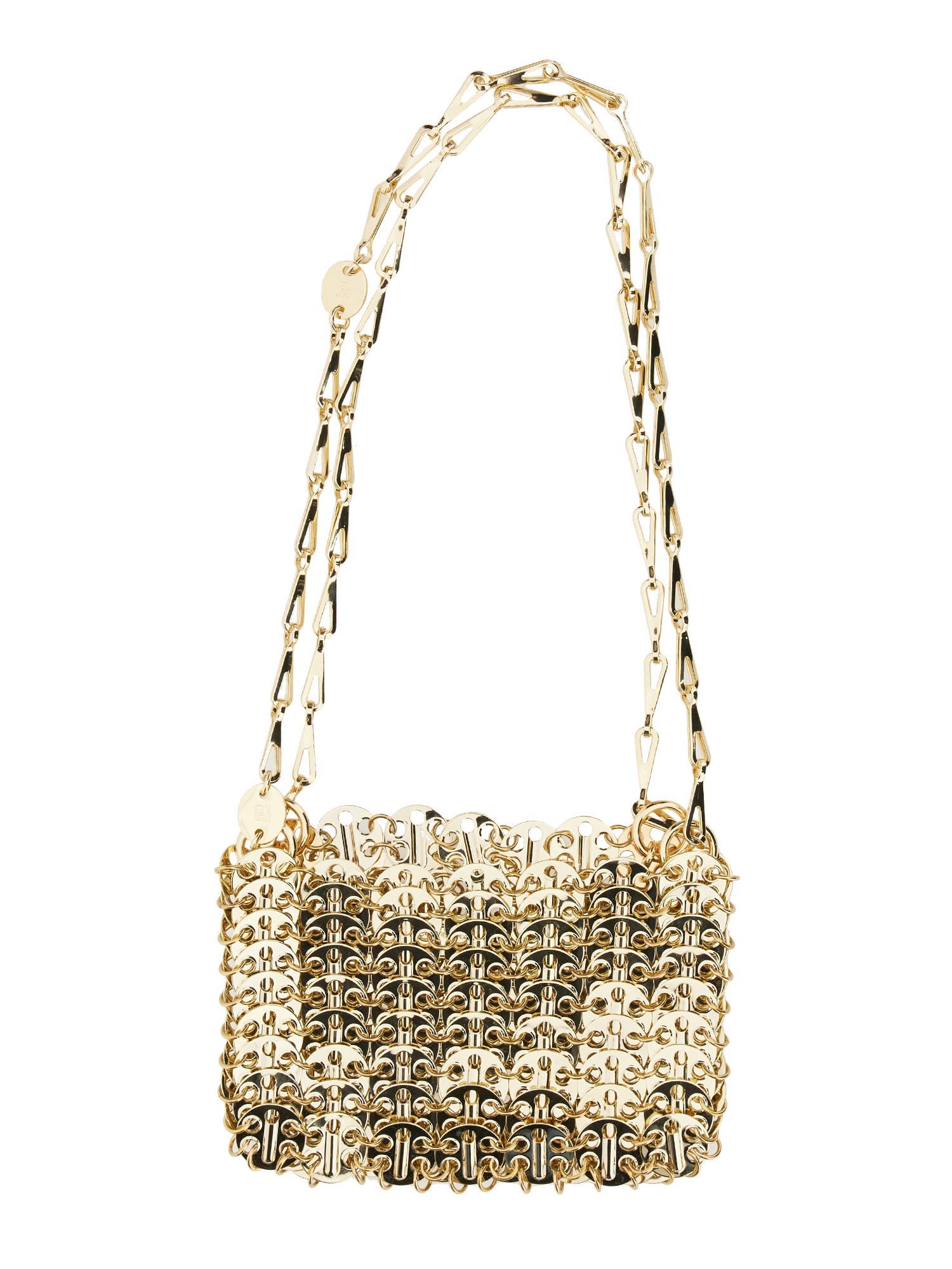 Questa borsa dorata è una riedizione della borsa Iconic 69 e mostra l'identità e il know-how della Maison Paco Rabanne. La borsa dorata è un nuovo formato del marchio Iconic 1969. Queste borse iconiche sono mini borse a catena XS. Presenta una tracolla a catena con una struttura morbida e flessibile con dischi di metallo. È una reinterpretazione dello storico modello iconico 69.