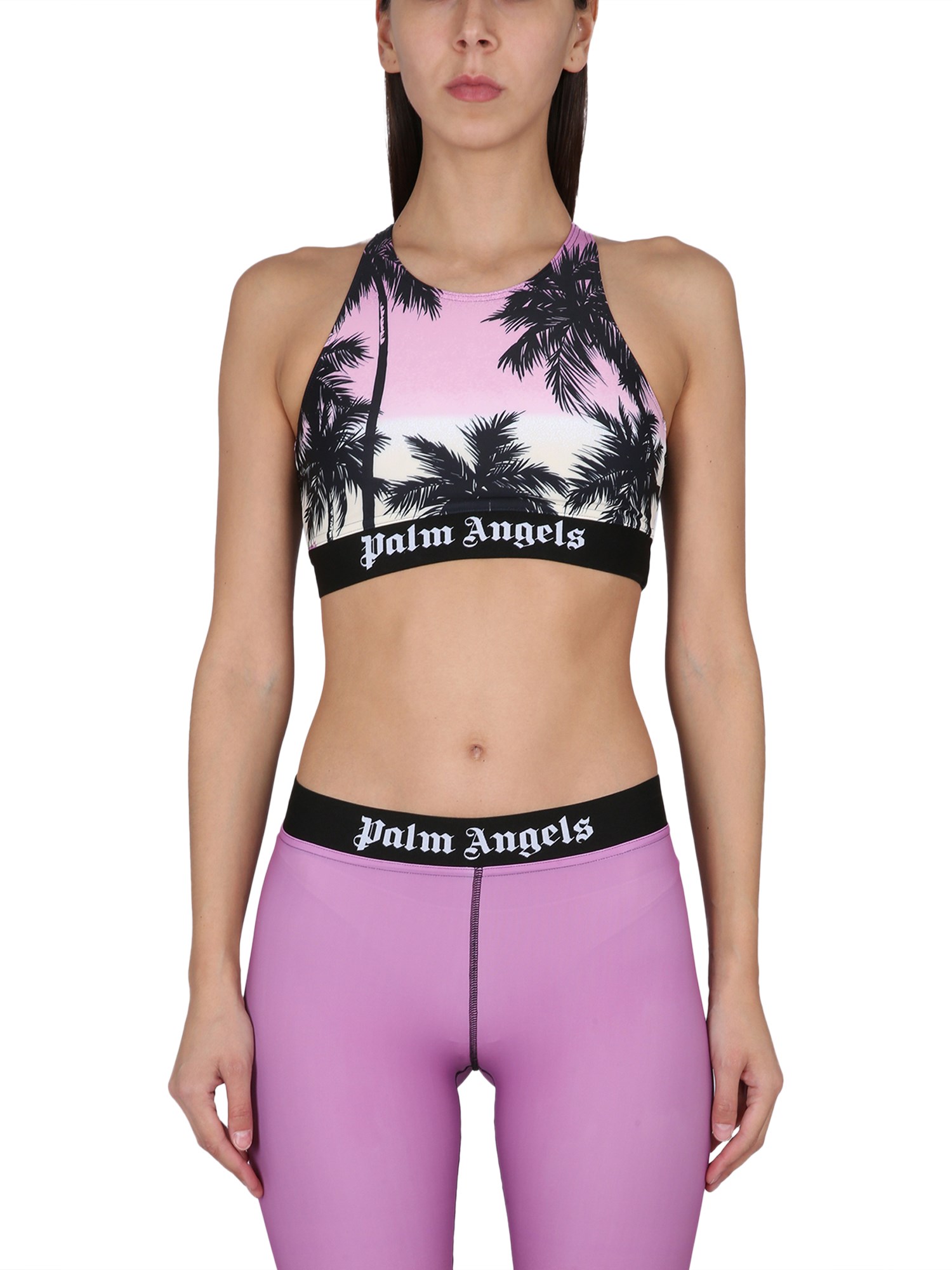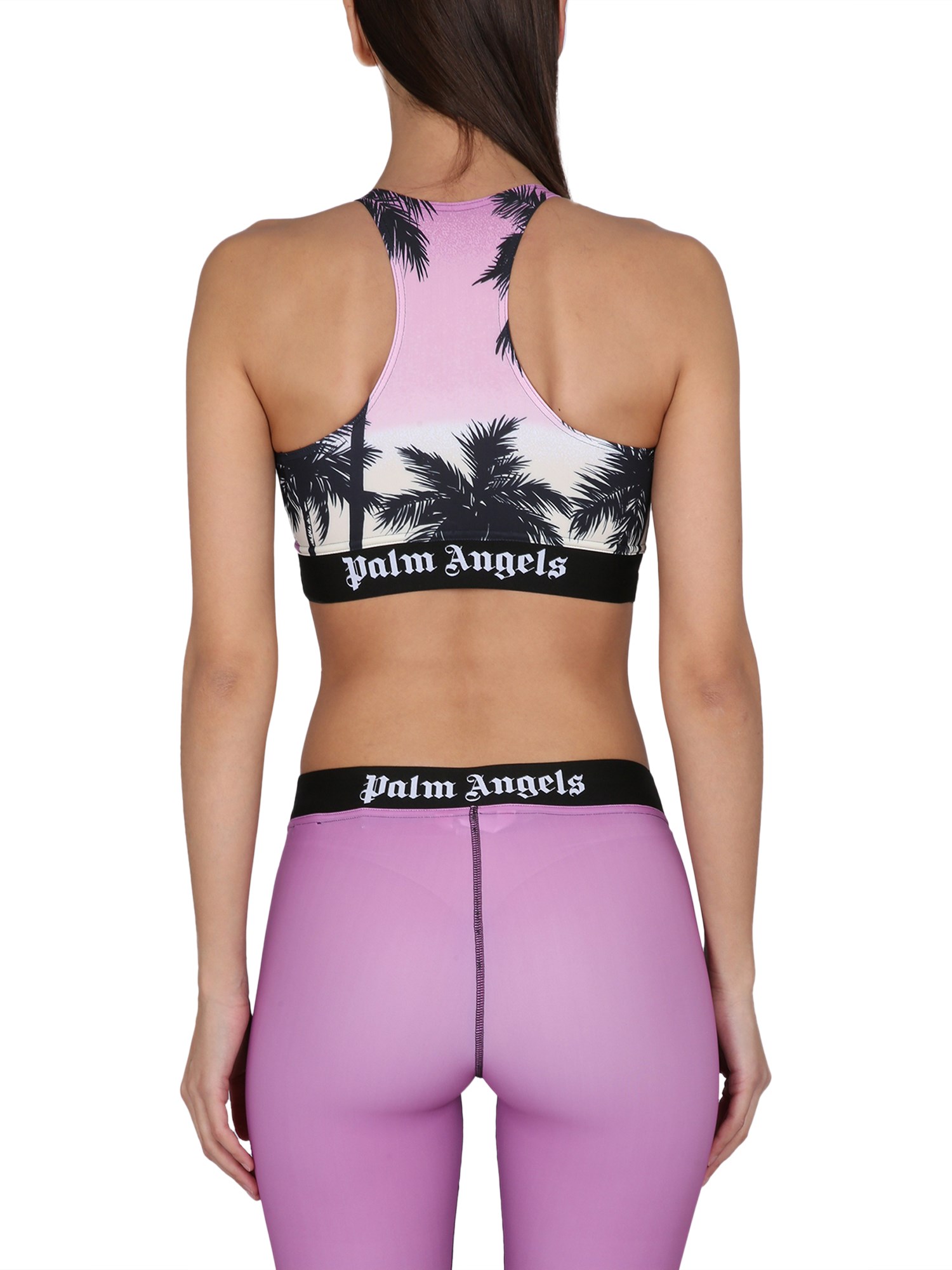 L'ultimo tipo di reggiseno sportivo proposto da Palm Angels è in misto poliammide, leggero e confortevole. Questo reggiseno sportivo è caratterizzato da una schiena a raggiera e da una fascia elastica in vita con un motivo a forma di palma del tramonto.
