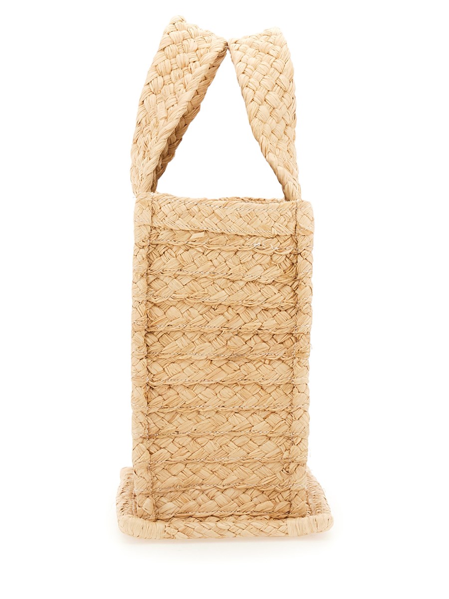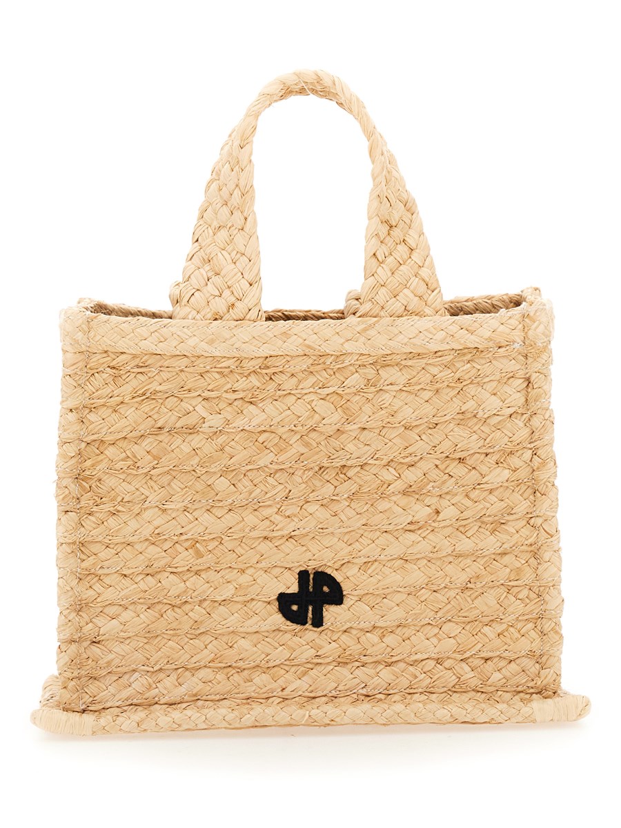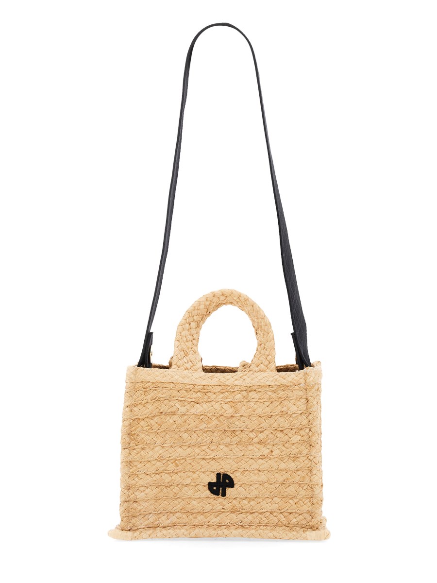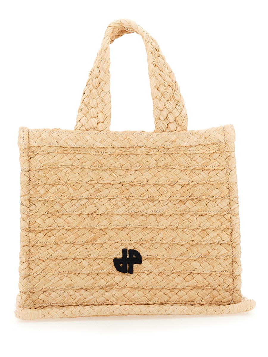 Tote in rafia naturale vaniglia. Monogramma JP in nero sul davanti. Tracolla in tela nera goffrata con bottoni dorati. Due manici superiori. Può essere portata a mano o a spalla.