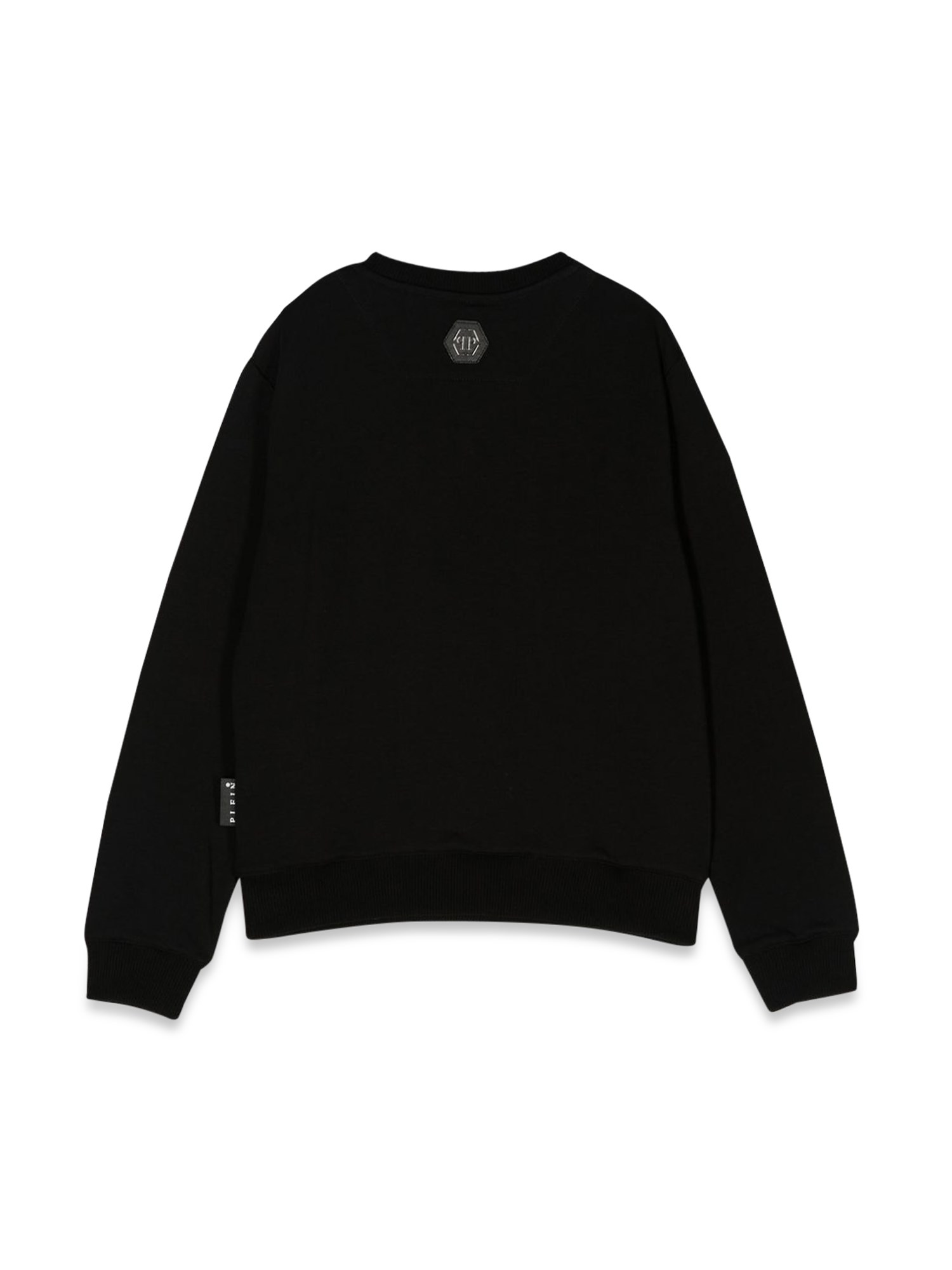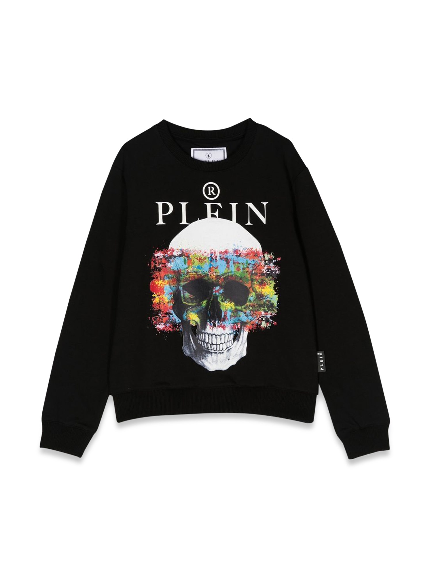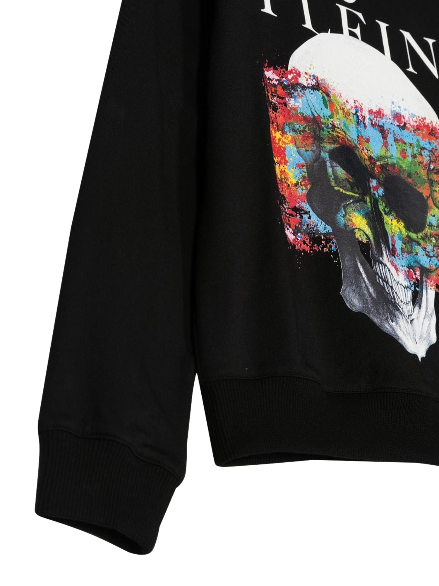 Felpa comoda di Philipp Plein, realizzata al 100% in cotone. È di colore nero e presenta un disegno di teschio sul davanti. Il teschio è stampato su un misto cotone che rende il teschio ancora più cool e tagliente. La felpa ha un girocollo e polsini a coste. È un regalo perfetto per chi ama i teschi o ha senso dello stile.