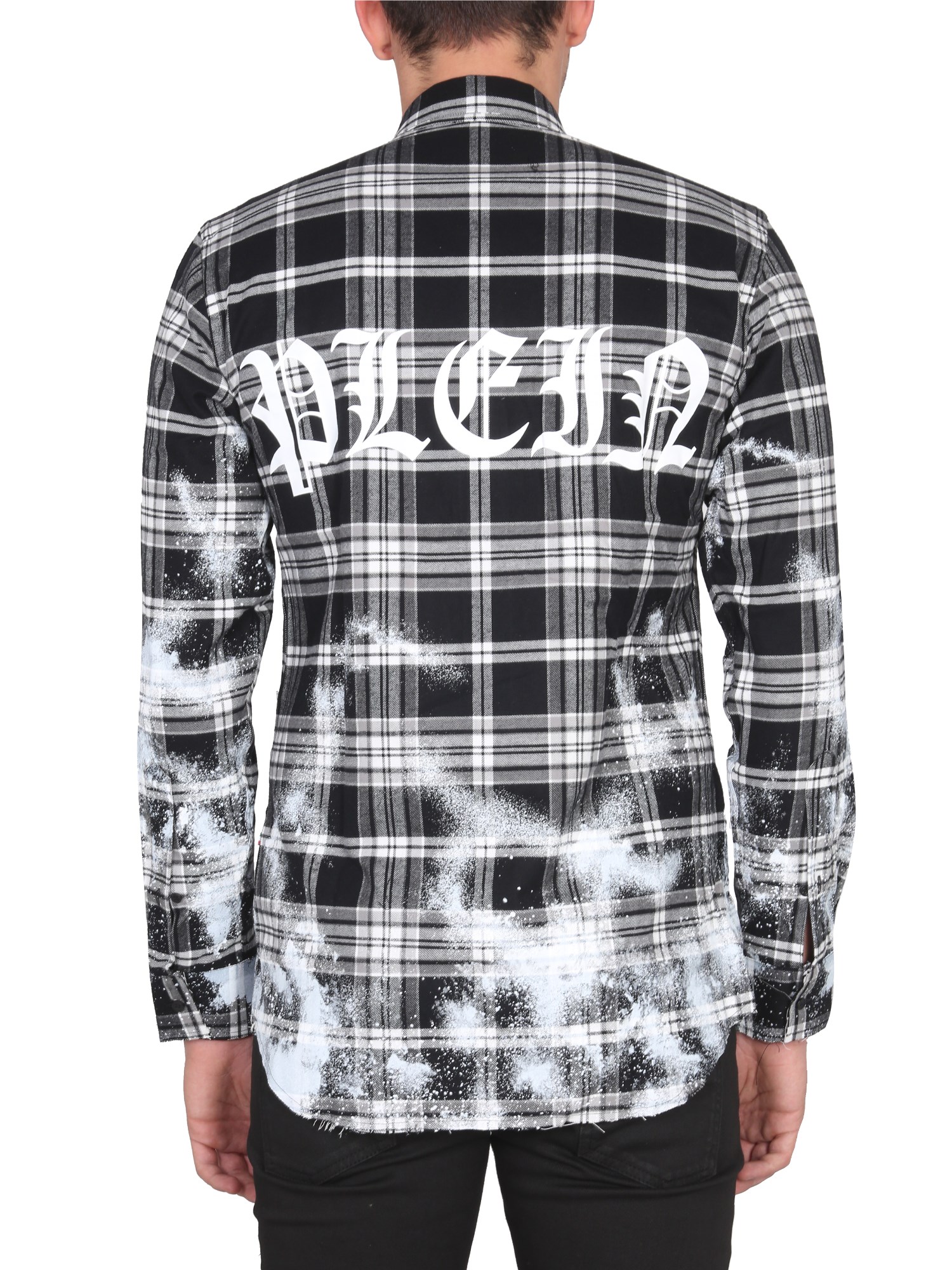 Godetevi il look fresco e rilassato della camicia in flanella con motivo tartan della maison Philipp Plein. Questa camicia icona presenta un logo in stile gotico stampato sul retro che offre un look unico. Presenta una chiusura a bottoni con logo e una vestibilità sugar daddy. Il pantaloncino in cotone presenta un effetto di colore schizzato e localizzato.