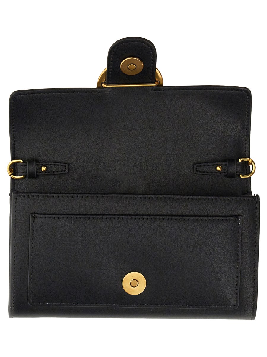 Portafoglio Love Bag con tracolla in morbida e setosa pelle. La chiusura con bottone nascosto è impreziosita dall'iconica fibbia Love Birds Diamond Cut in metallo. L'accessorio è foderato in microfibra, ha una tasca centrale divisoria con cerniera e scomparti per carte di credito. La tracolla rimovibile con catena metallica a maglie rotonde consente di indossare la borsa come una crossbody bag.