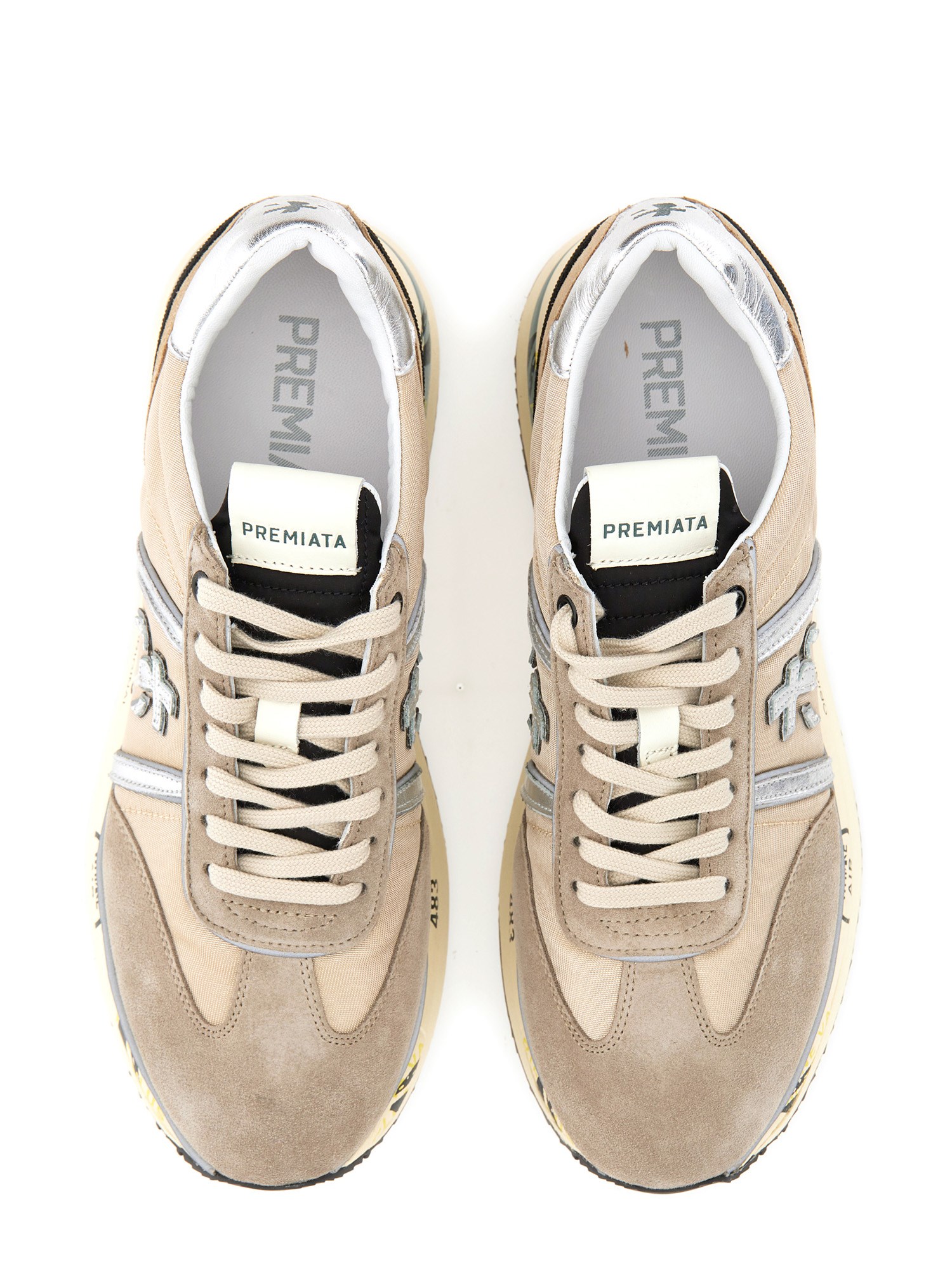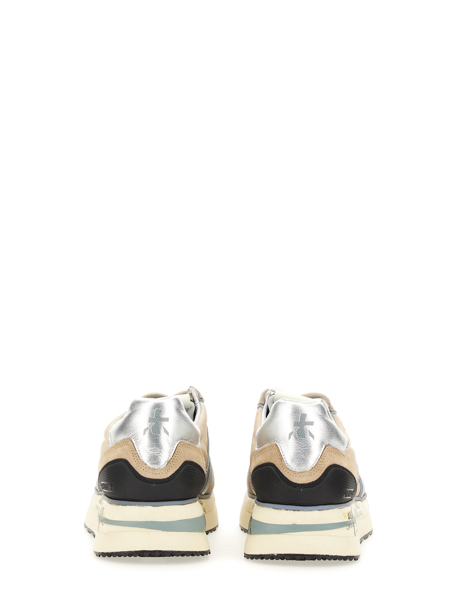 La scarpa è resa unica dal mix di pelli e tessuti nei toni del beige e dai dettagli argentati a contrasto. Il fondo valorizza il look, contribuendo a dare uno spirito casual glam e a slanciare la silhouette.