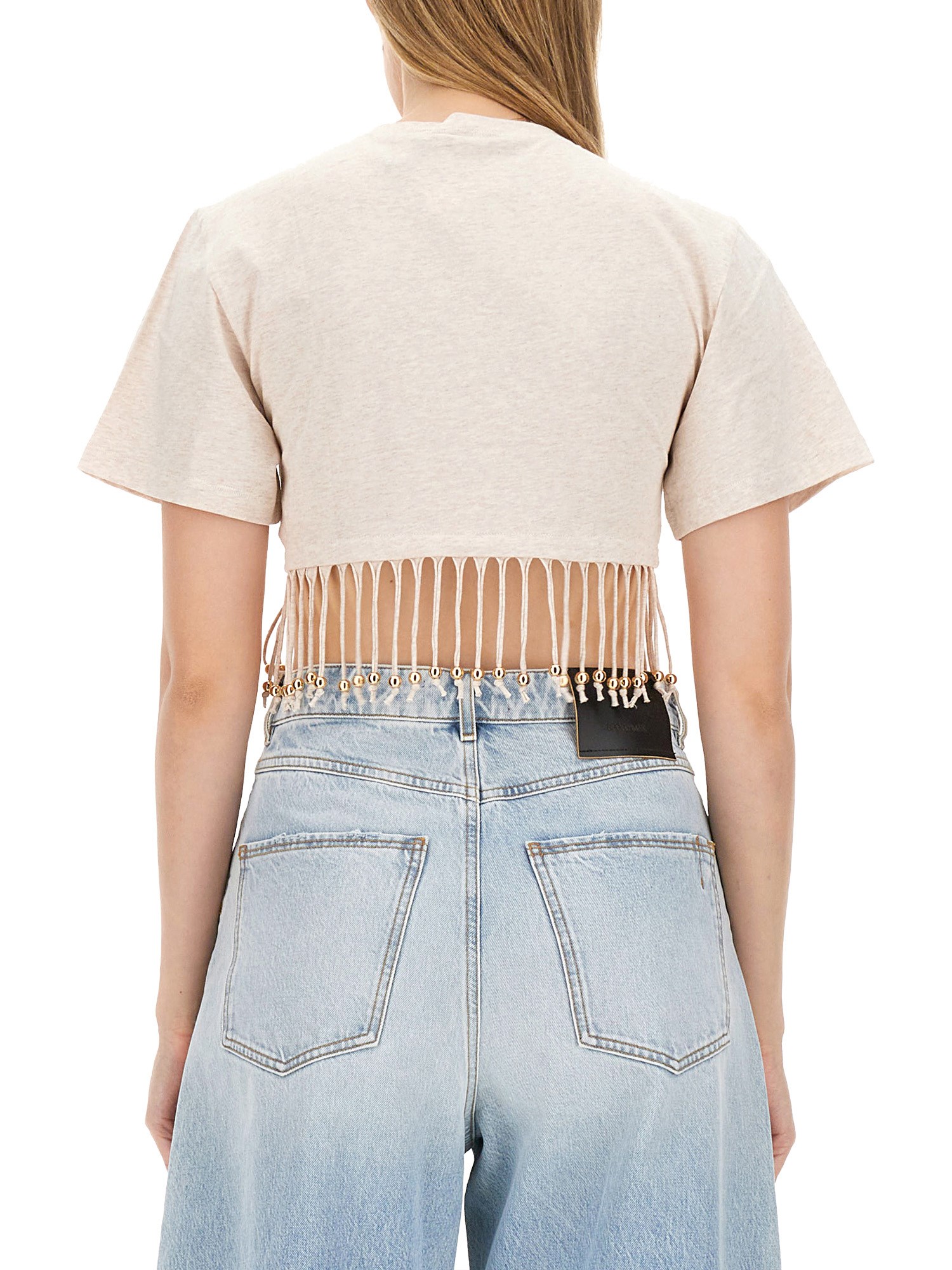 La T-shirt con frange di Rabanne combina uno stile contemporaneo con un tocco unico, caratterizzato da un accattivante dettaglio di frange che aggiunge movimento e consistenza. Realizzata con materiali di alta qualità, questa t-shirt offre comfort e durata, rendendola un'aggiunta versatile a qualsiasi guardaroba. La sua silhouette moderna e il suo design distintivo la rendono adatta a diverse occasioni, dalle uscite casual agli eventi più eleganti. Elevate il vostro stile con questo pezzo forte che incarna lo spirito innovativo di Rabanne.