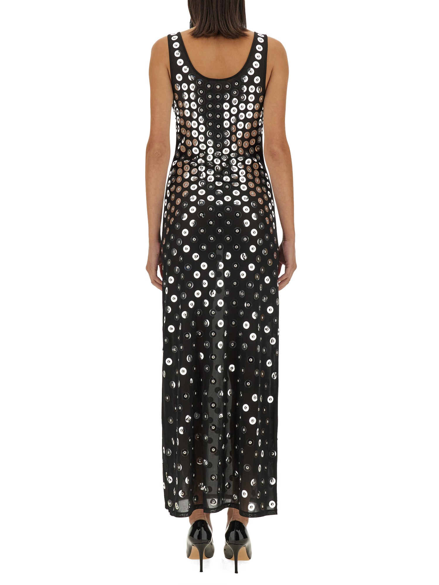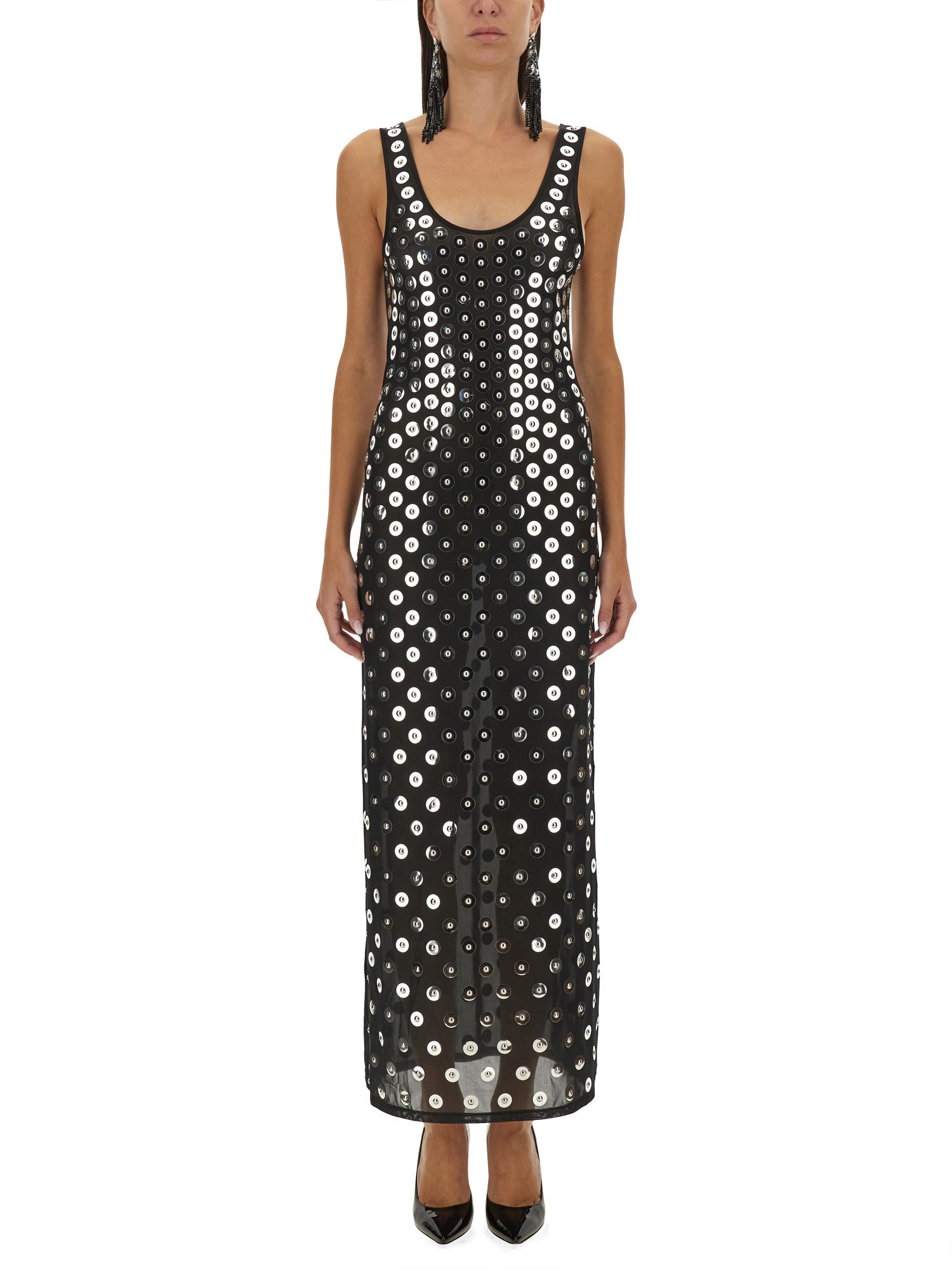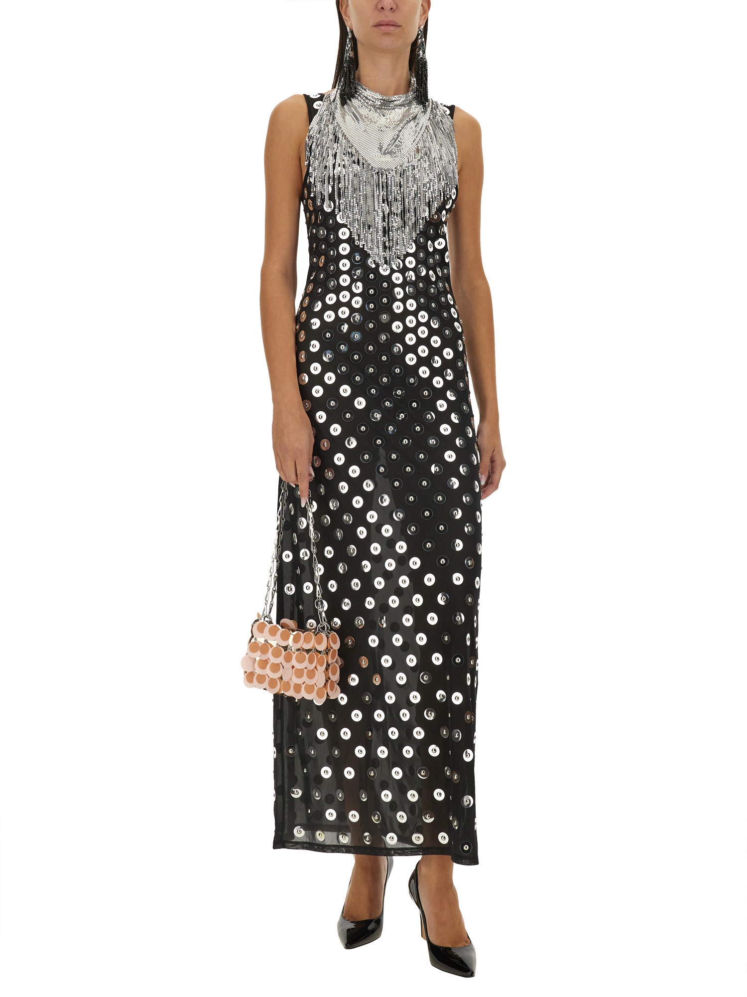 Questo squisito abito lungo ricamato di Rabanne è un perfetto connubio di eleganza e design contemporaneo. Realizzato con una meticolosa attenzione ai dettagli, l'abito presenta ricami intricati che aggiungono un tocco di raffinatezza alla sua silhouette fluida. Ideale per occasioni formali o eventi di alto livello, offre comfort e stile, rendendolo un'aggiunta versatile a qualsiasi guardaroba. Il tessuto lussuoso si drappeggia magnificamente, valorizzando la figura di chi lo indossa e assicurando un movimento aggraziato. Elevate il vostro stile con questo splendido capo che incarna la femminilità moderna.