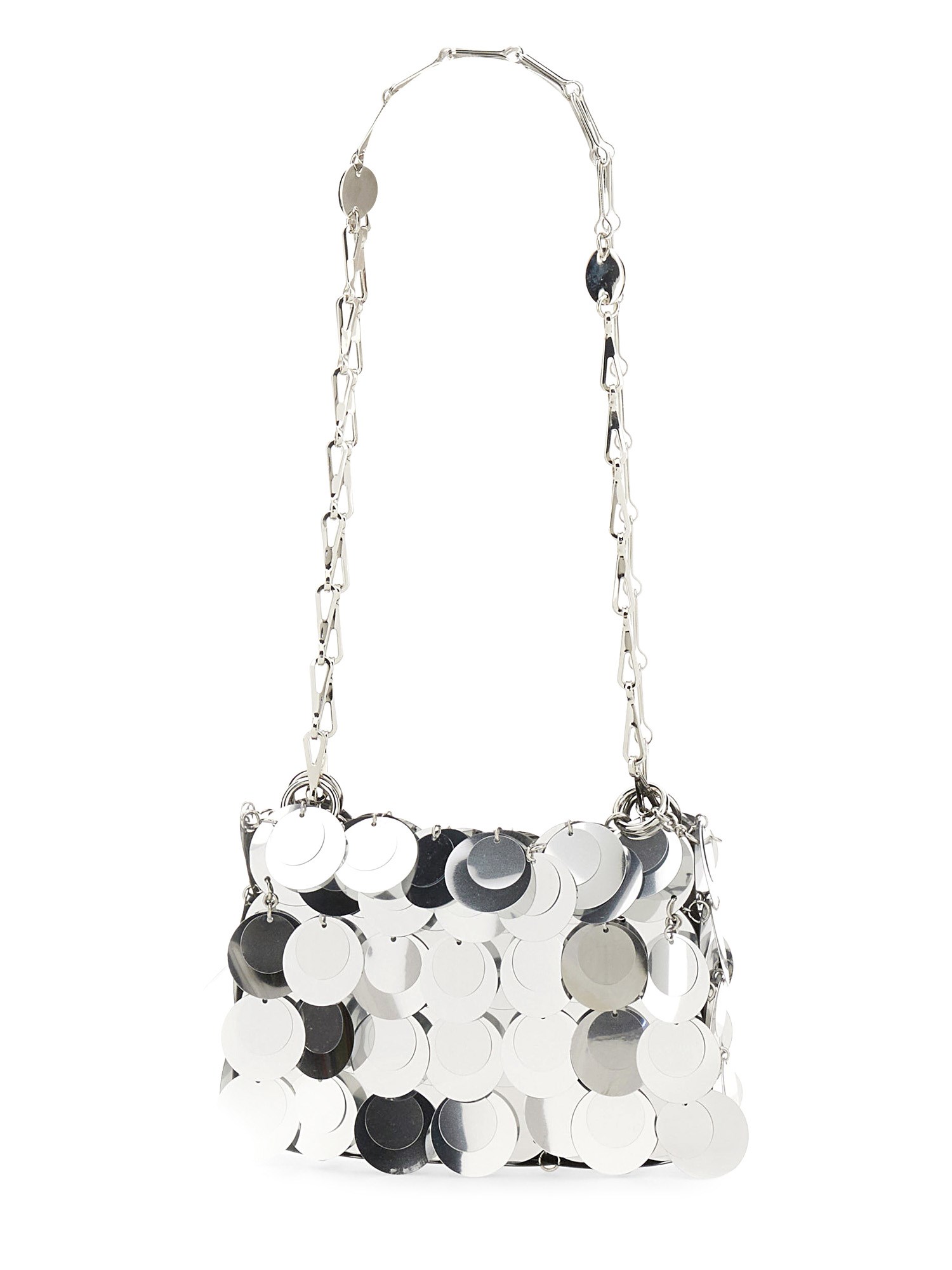 La borsa "Sparkle Nano" di Rabanne è un accessorio di grande impatto che unisce un design moderno a un tocco di glamour. Realizzata con un'attenzione meticolosa ai dettagli, questa borsa presenta un'esclusiva finitura scintillante che cattura la luce in modo meraviglioso, rendendola un pezzo forte per ogni occasione. Le sue dimensioni compatte sono perfette per trasportare gli oggetti essenziali mantenendo una silhouette chic, mentre il design versatile permette di abbinarla senza sforzo sia a un abbigliamento casual che formale. Elevate il vostro stile con la squisita fattura e l'eleganza contemporanea della borsa Sparkle Nano.