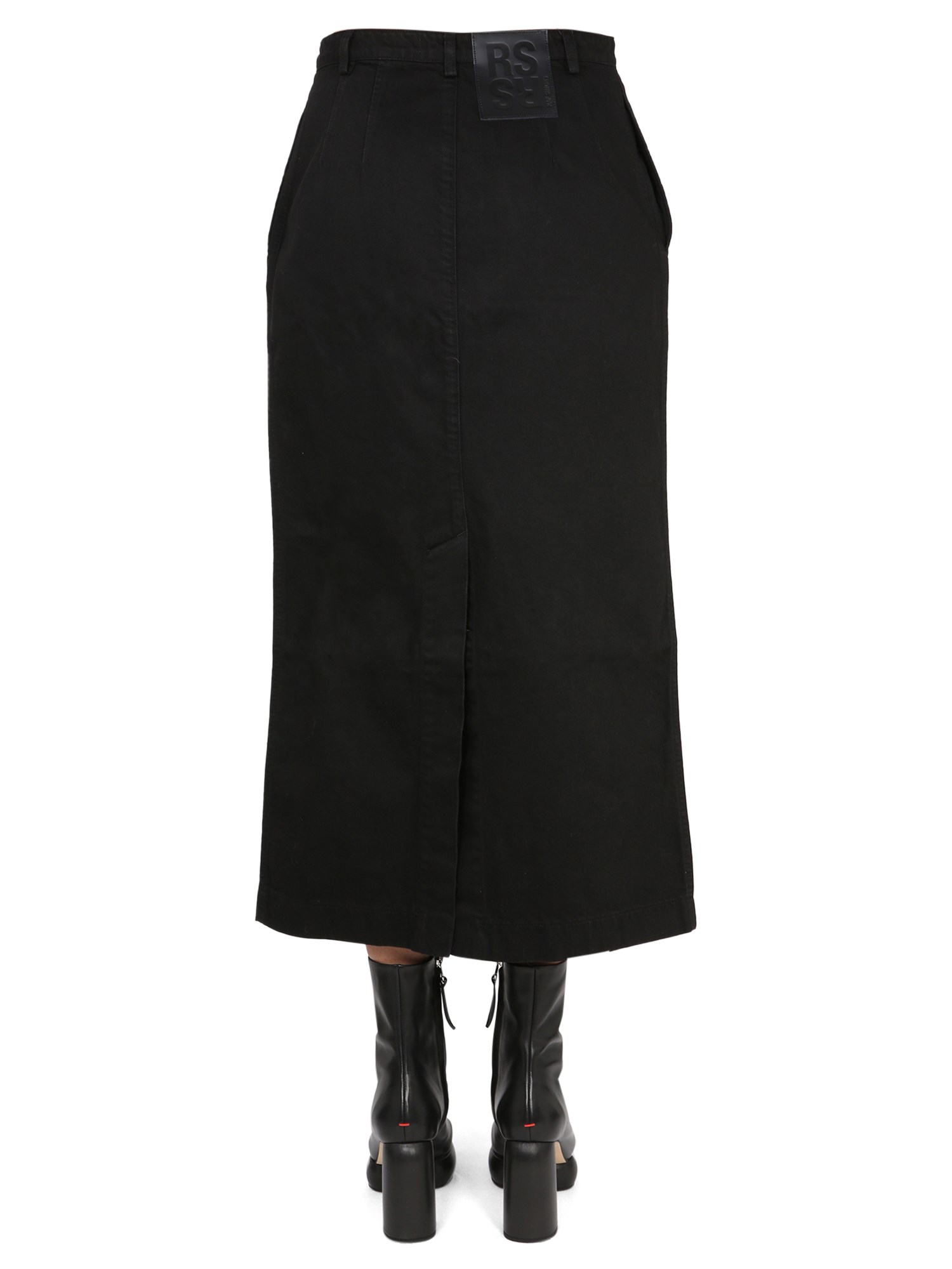 Questa particolare gonna di Raf Simons è una gonna midi in cotone denim con chiusura frontale a bottoni. È una gonna basica che si abbina a tutto ed è un ottimo capo per il guardaroba. È dotata di passanti in vita per poterla accessoriare con la propria cintura preferita e presenta una toppa con logo sul retro.