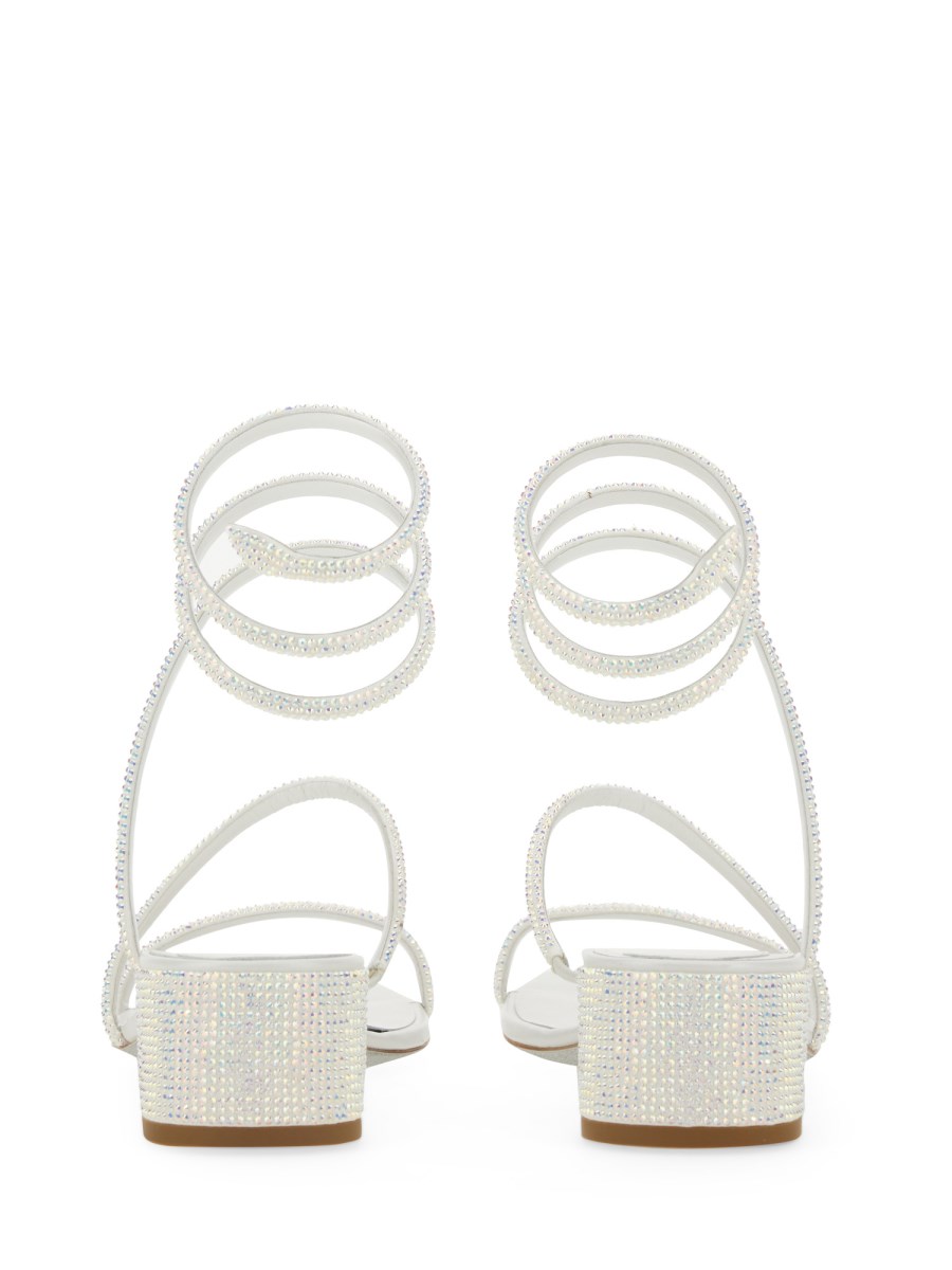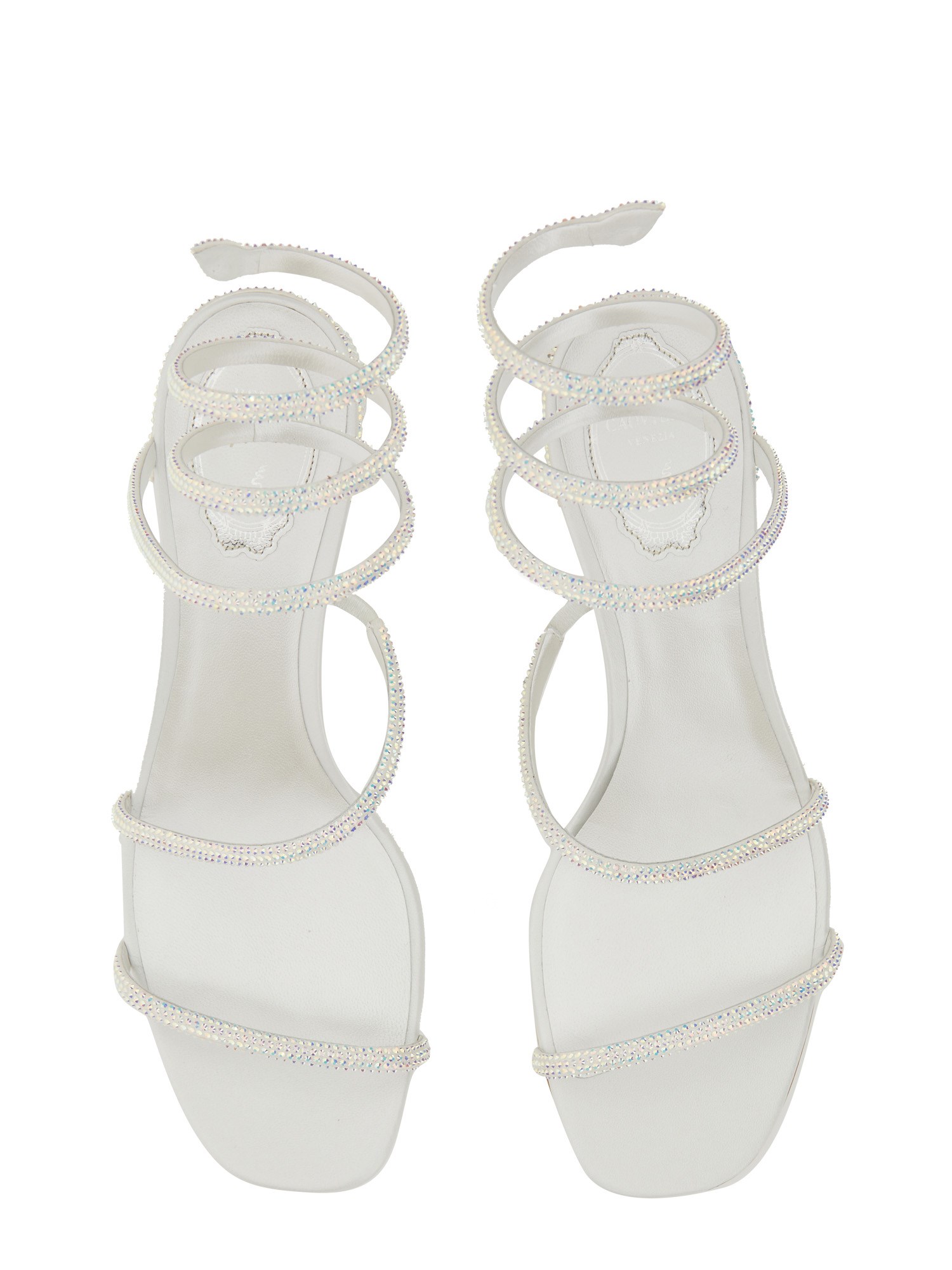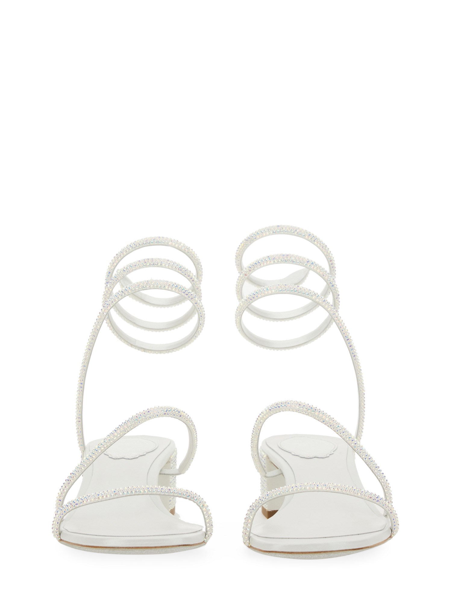 I sandali in raso bianco CLEO sono pensati per dare un tocco di classe ai look da giorno e da sera. Questi eleganti sandali con tacco basso, realizzati in Italia, hanno un doppio cinturino e una molla intorno alla caviglia con una finitura a testa di serpente ricoperta da piccoli zirconi in tinta. Il tacco glitterato rappresenta un dettaglio originale che aggiunge ulteriore fascino al modello.