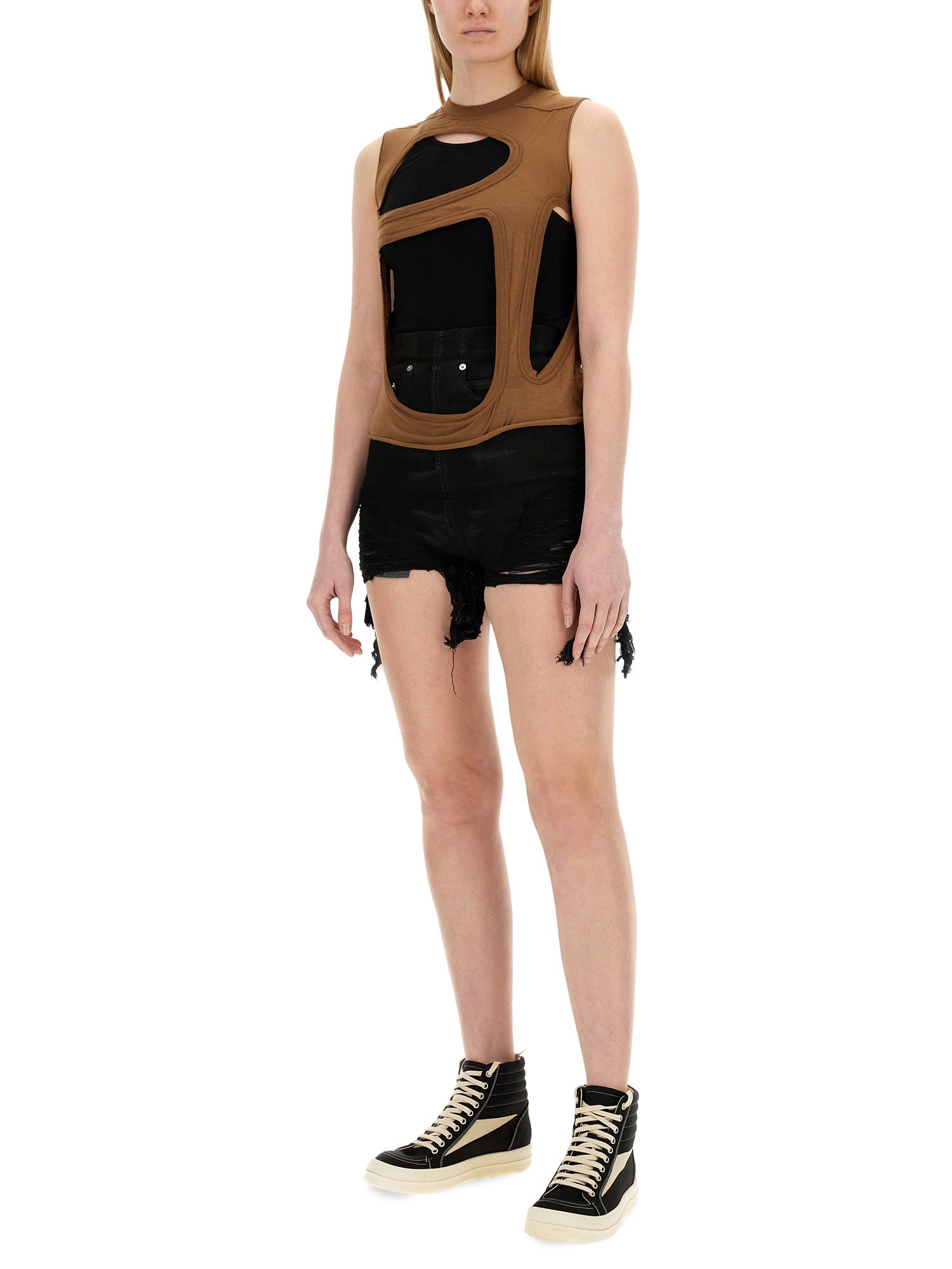 Questo top di Rick Owens Drkshdw non solo è comodo da indossare, ma emana anche un'atmosfera chic e di tendenza. Realizzato con precisione, questo top marrone è caratterizzato da dettagli di taglio unici che aggiungono un tocco di stile al suo design complessivo. I tagli strategicamente posizionati creano un motivo visivamente accattivante, regalandovi un look alla moda senza sforzo. Il tessuto in cotone morbido e traspirante assicura un comfort per tutto il giorno, rendendolo perfetto per ogni occasione.