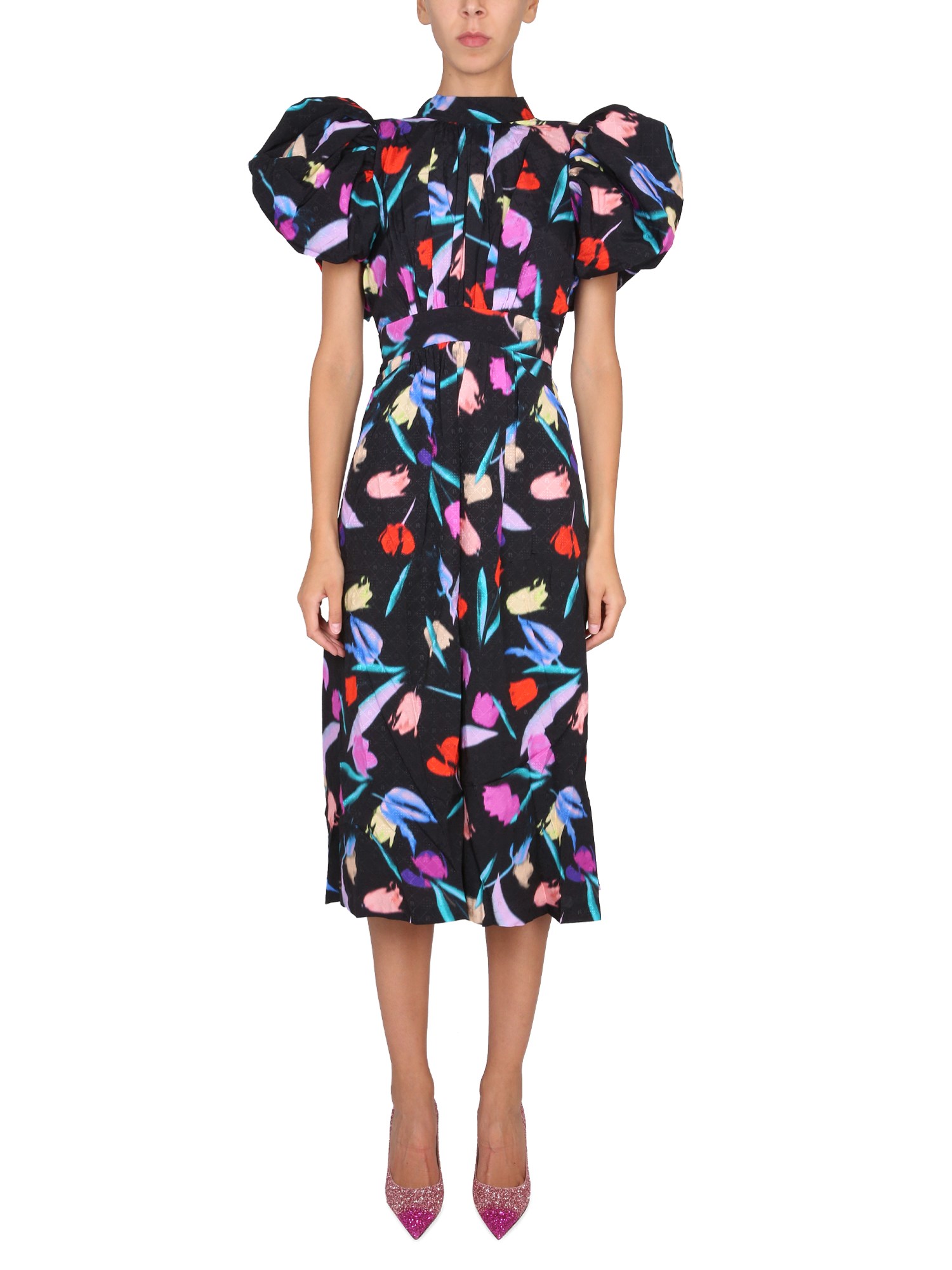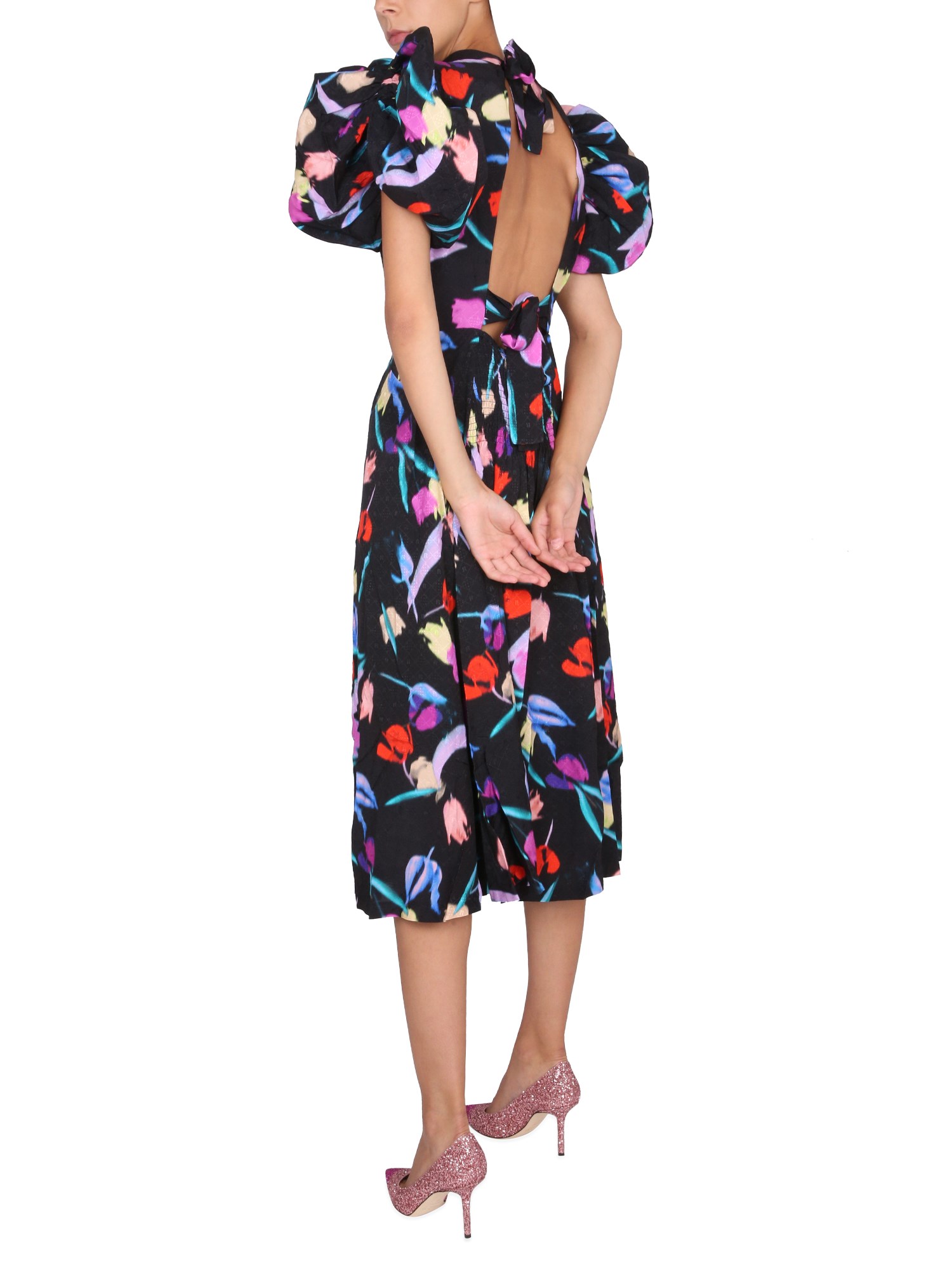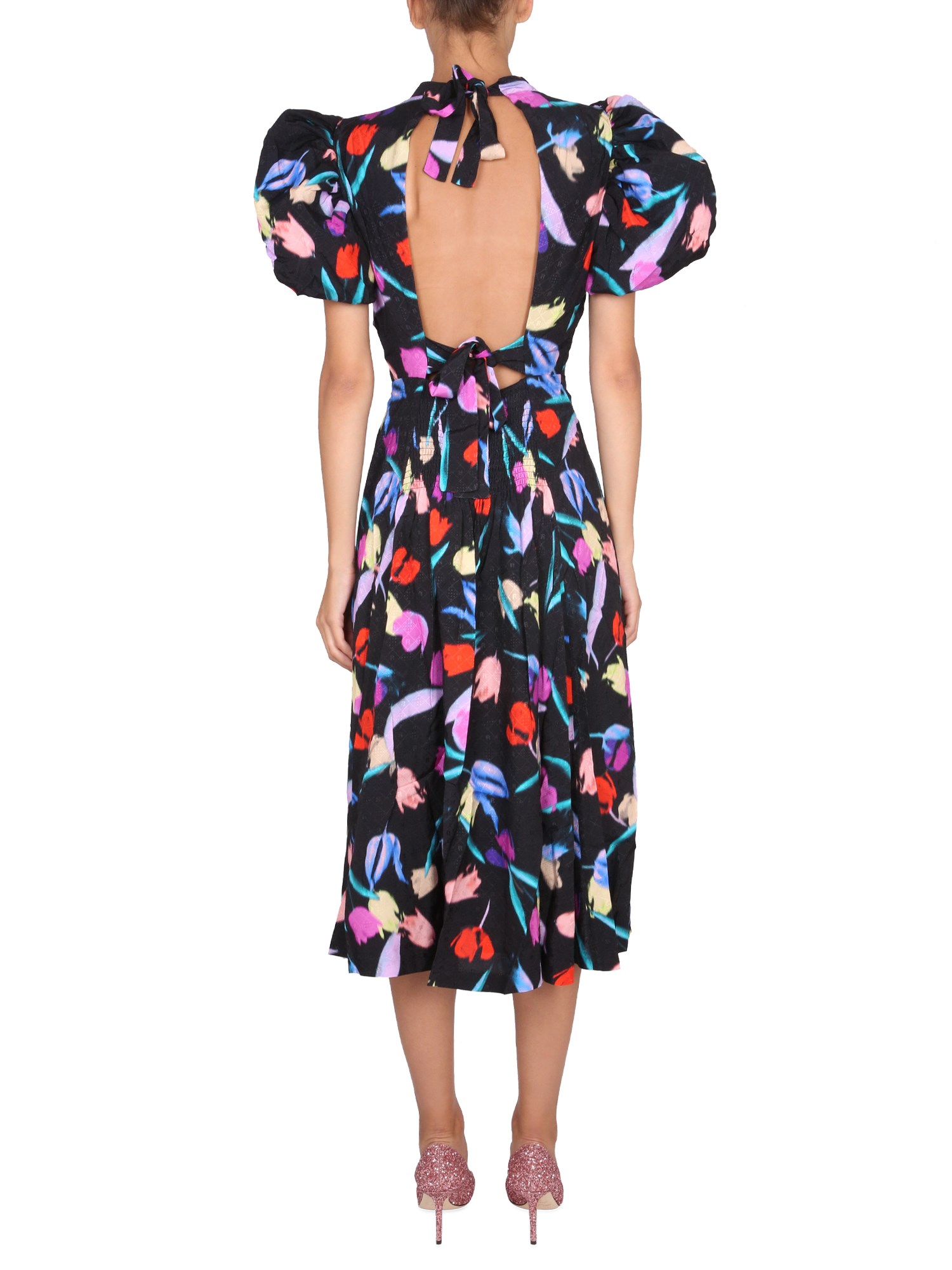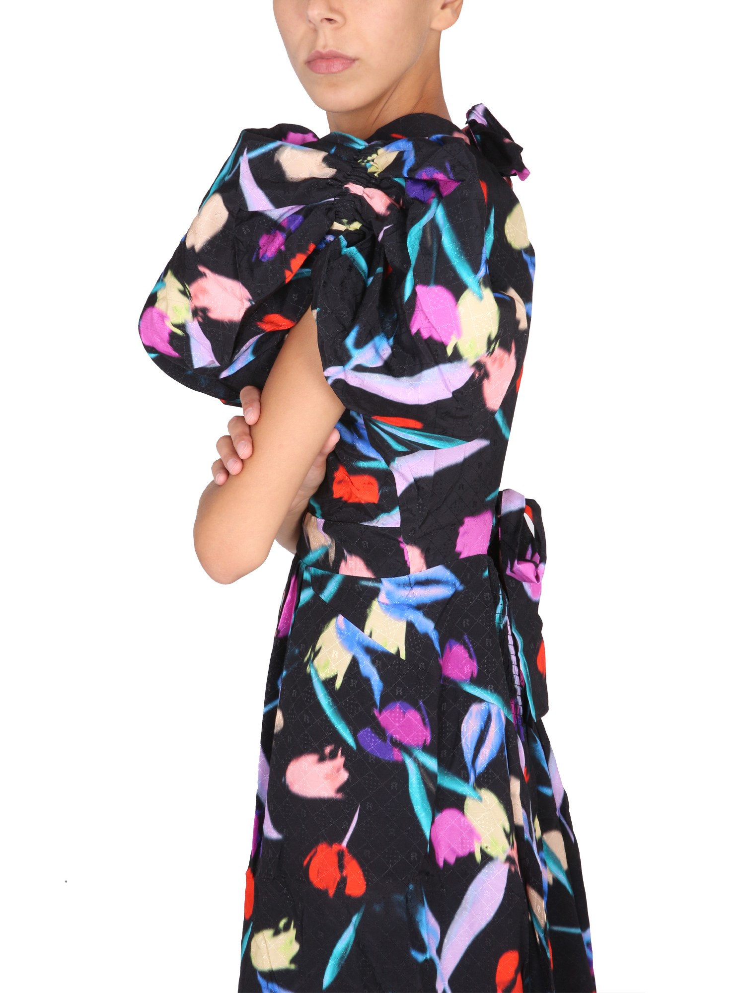 Fate un'apparizione appariscente indossando l'abito "Noon" della maison Rotate Birger Christensen. Presenta un collo alto, maniche a sbuffo, schiena aperta con chiusura a nodo e una silhouette di lunghezza midi. L'abito presenta una stampa logo all-over. L'abito ha un aspetto elegante e si abbina a tacchi alti.