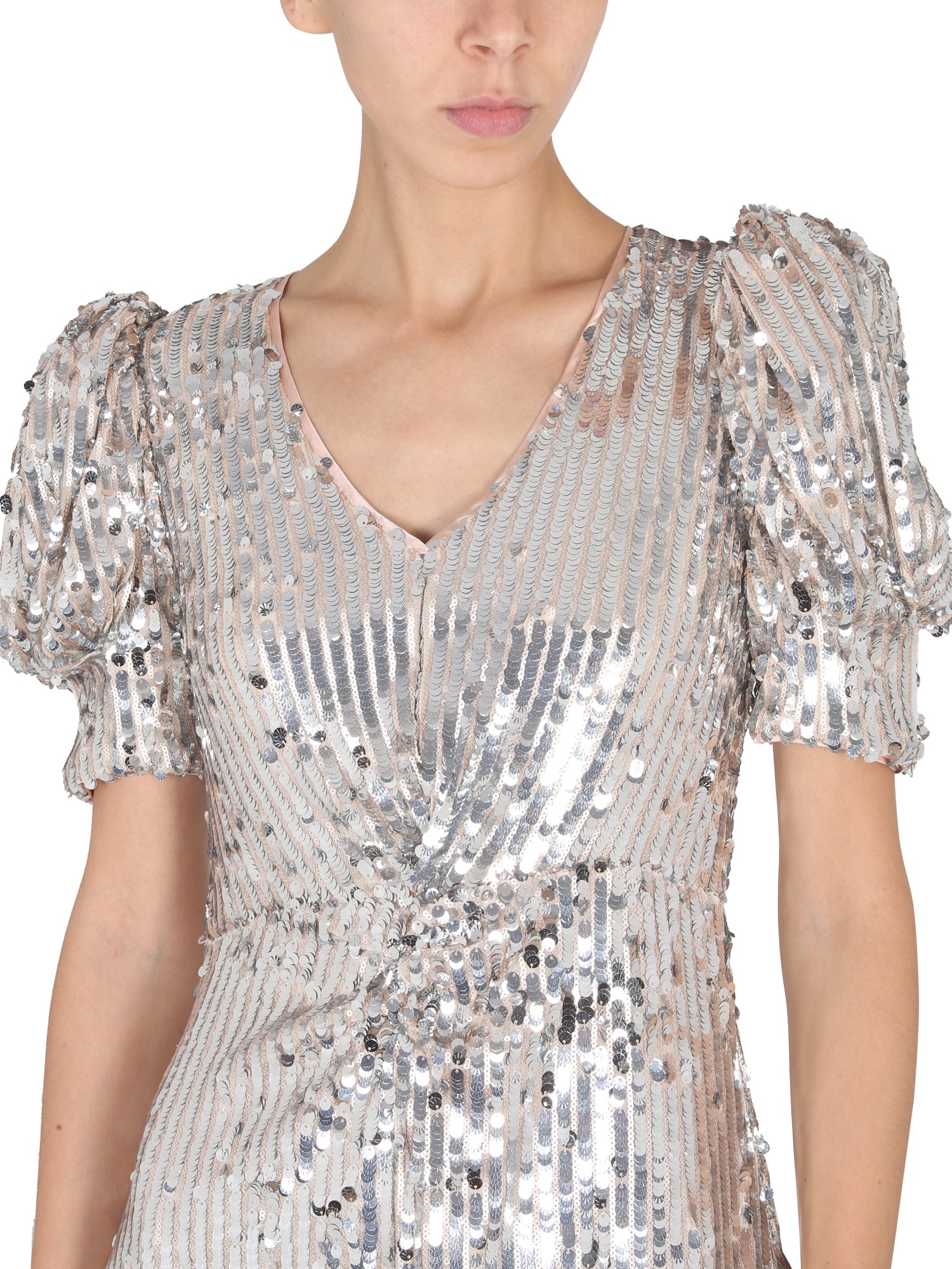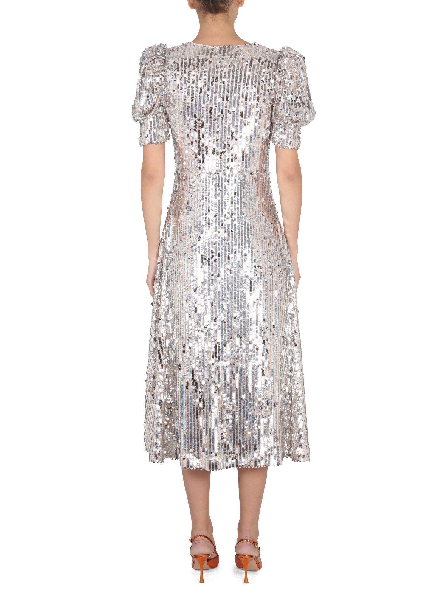 Il Sequin Midi Slit Dress è caratterizzato da splendidi dettagli in paillettes argentate su tutto il tessuto a rete, maniche a sbuffo e scollatura a V. Presenta arricciature sul punto vita, che creano un lusinghiero effetto drappeggiato sul davanti. L'abito perfetto per le feste.
