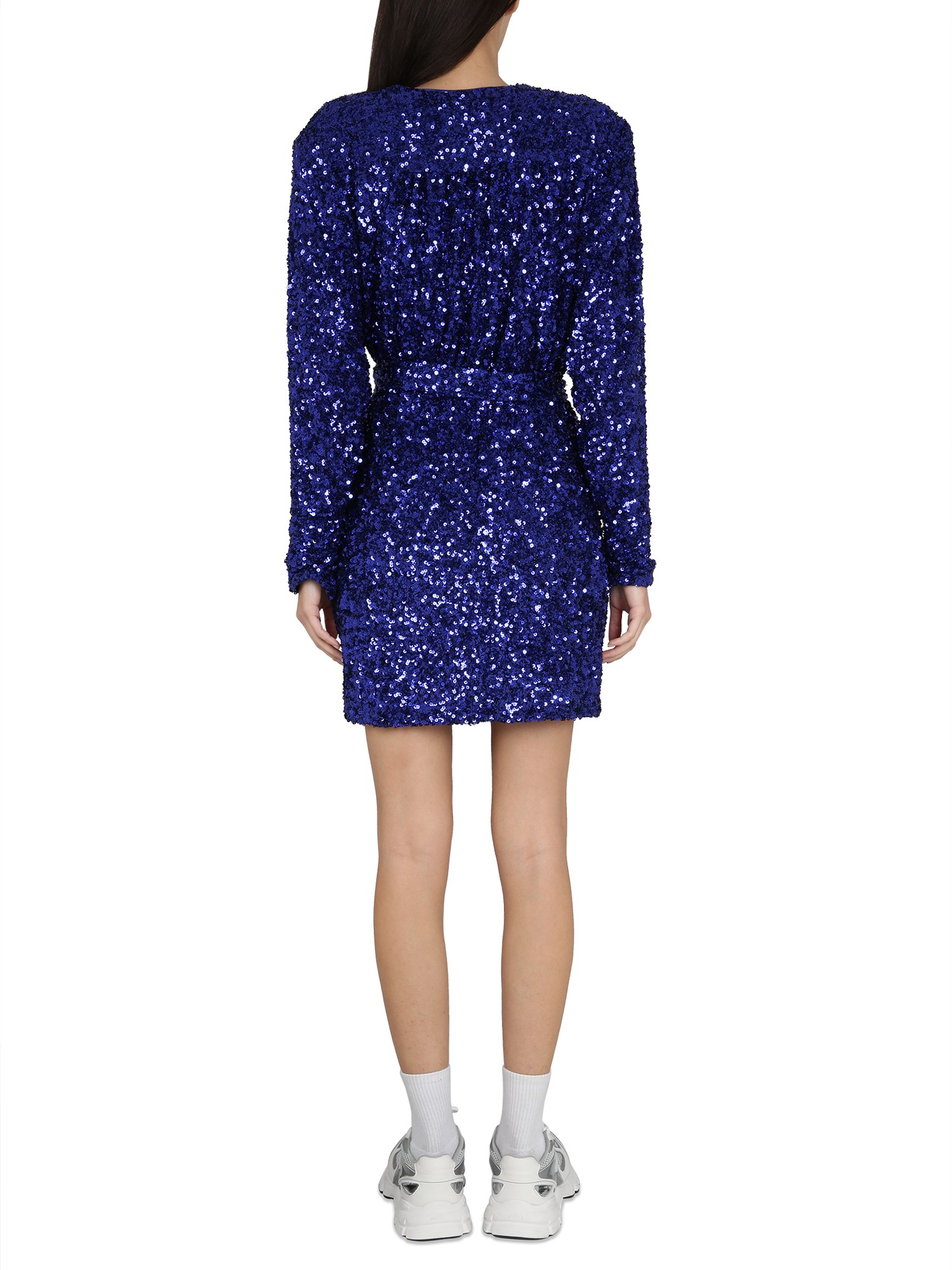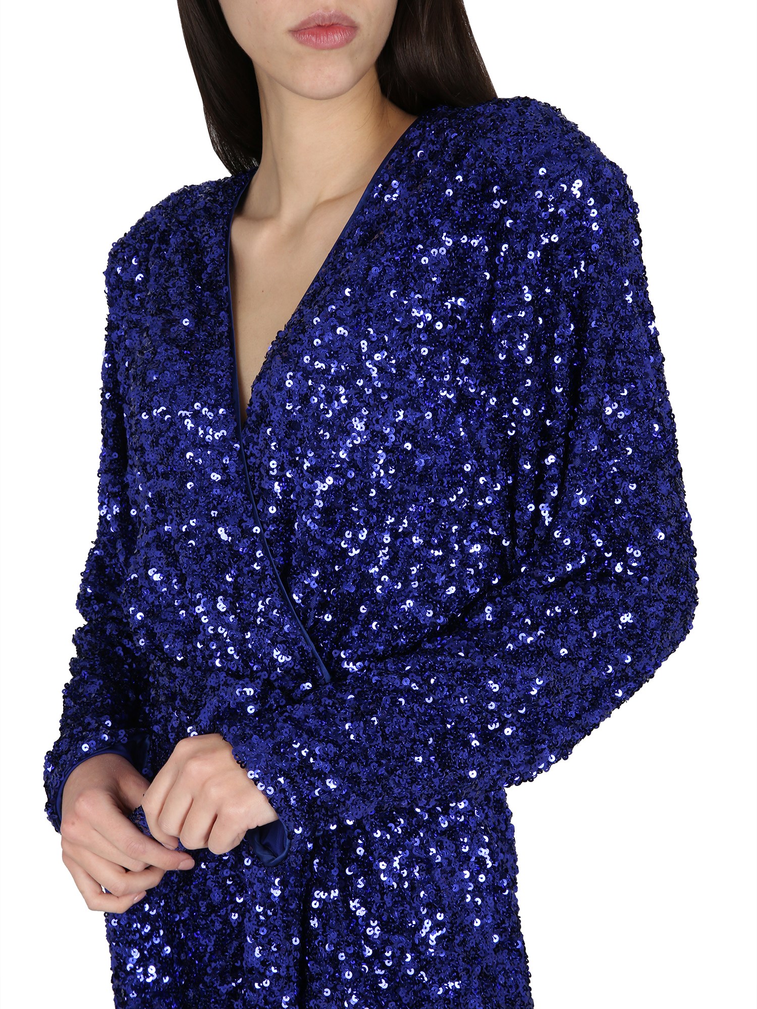 Il Sequin Wide-Shoulder Wrap Dress è realizzato in un bellissimo tessuto di paillettes, che strizza l'occhio ai tempi della discoteca degli anni '80. È un abito a portafoglio che si chiude con una fascia e con bottoni a pressione nascosti in vita. Ha maniche a pipistrello ed è l'abito perfetto per le feste.