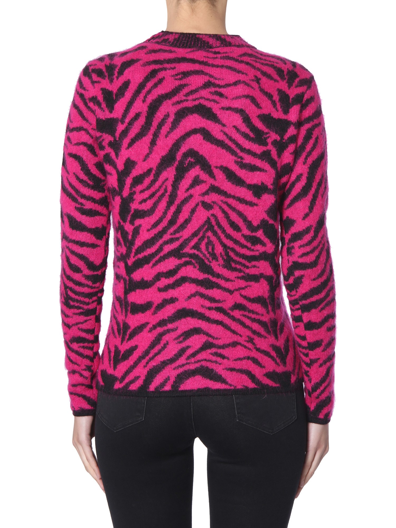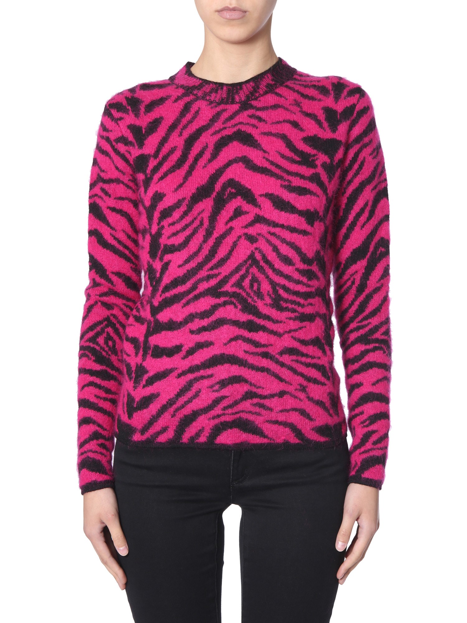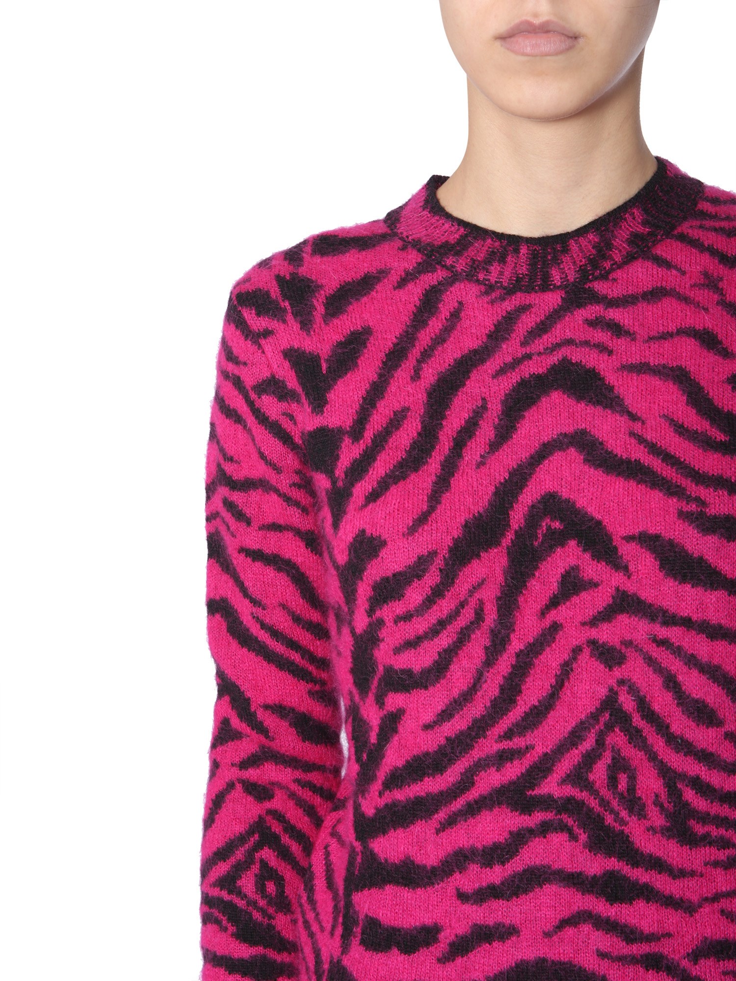 - GIROCOLLO- STAMPA ZEBRATA- REGULAR FIT- 60% LANA, 24% MOHAIR, 16% POLIAMMIDE- MADE IN ITALY- LA MODELLA È ALTA 184 CM E INDOSSA LA TAGLIA S