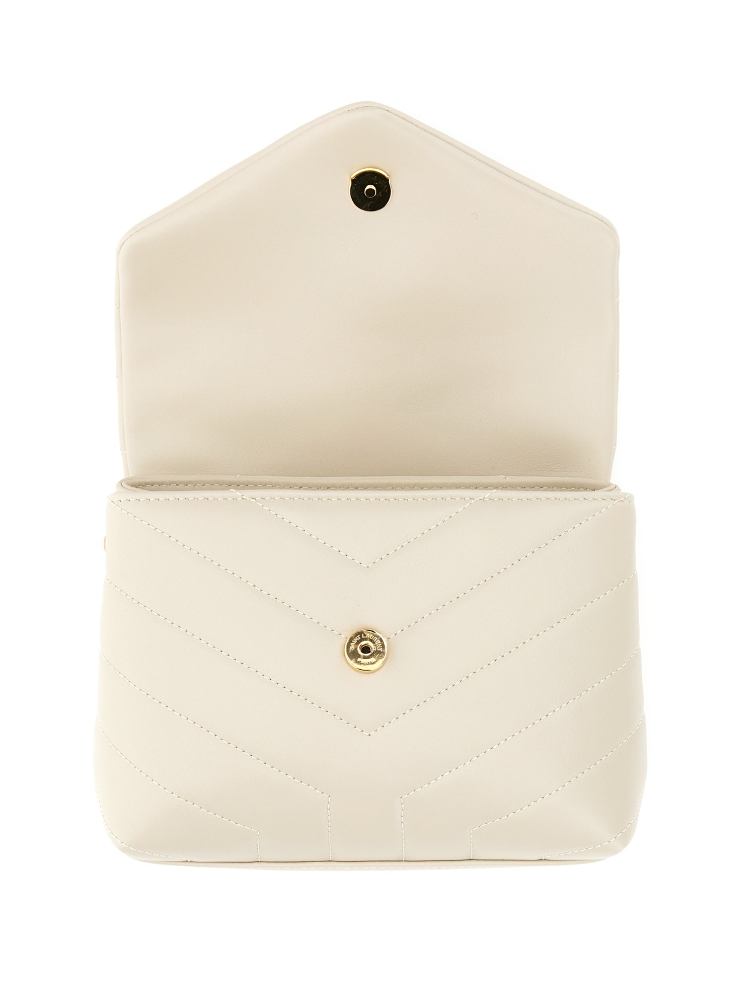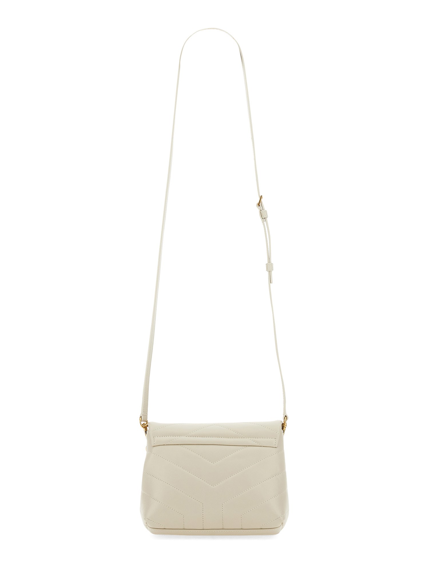 Borsa monogram Saint Laurent dalla struttura morbida con patta frontale, decorata con cuciture trapuntate a "Y" e iniziali YSL in metallo, caratterizzata da una tracolla in pelle regolabile e rimovibile che può essere indossata a mano o a spalla.