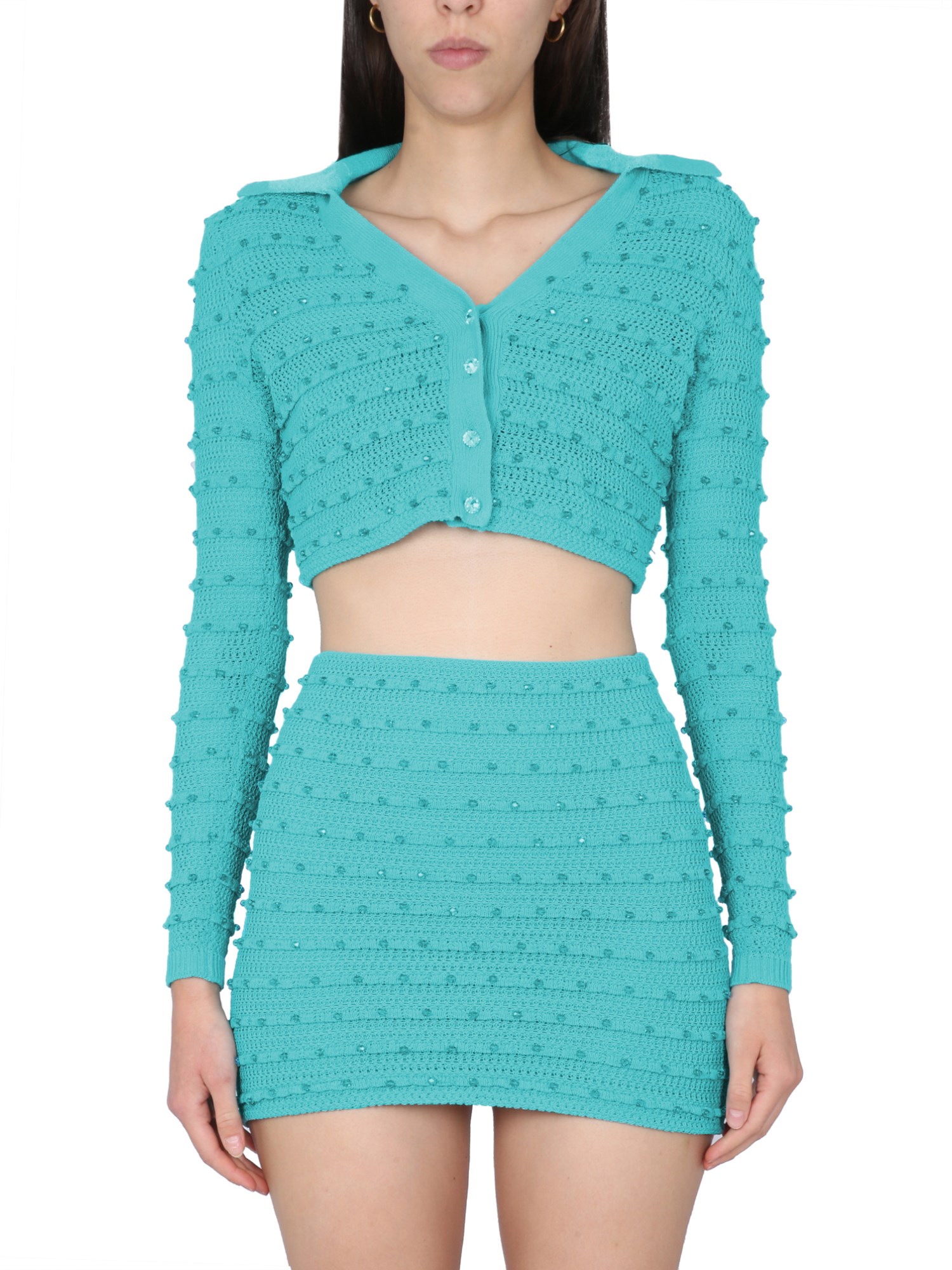 Questa giacca in maglia verde con perline è realizzata con fibre naturali che la rendono leggera e traspirante. I dettagli con perline lungo le finiture aggiungono un tocco di stile unico, mentre la maglia larga assicura una vestibilità comoda e flessibile. Un capo perfetto per aggiungere un tocco di stile a qualsiasi guardaroba.
