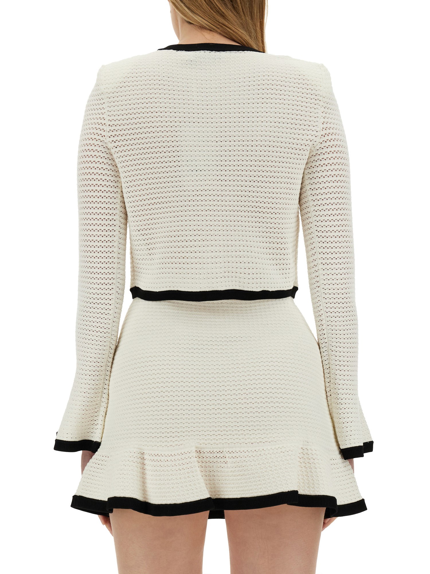 Questo elegante cardigan cropped di Self-Portrait presenta una chiusura frontale con bottoni per una facile vestibilità e un look classico. I colori a contrasto bianco e nero aggiungono un tocco di modernità a questo capo versatile, rendendolo perfetto per essere indossato su qualsiasi outfit. Realizzato con materiali di alta qualità, questo cardigan è comodo e chic e rappresenta un'aggiunta indispensabile a qualsiasi guardaroba.