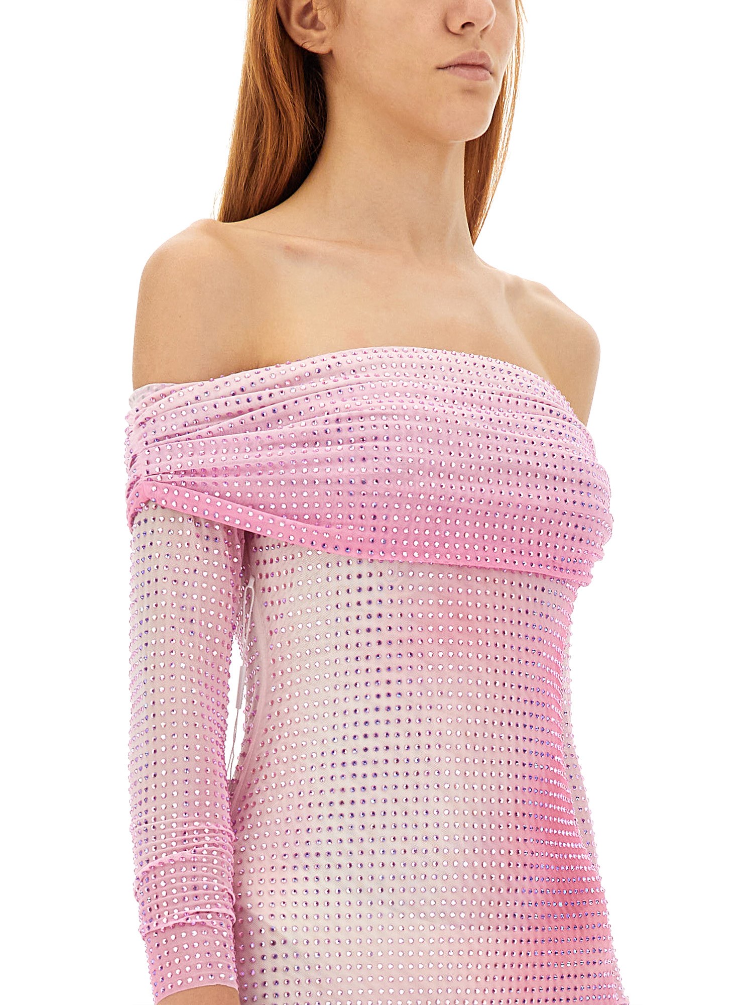 Tagliato in mesh tempestato di strass per una finitura scintillante, questo maxi abito rosa di Self-Portrait è pronto per le avventure dopo il tramonto. Realizzato in morbido jersey che aderisce al corpo, presenta un'elegante scollatura off-shoulder e una sensuale stampa a contorno.