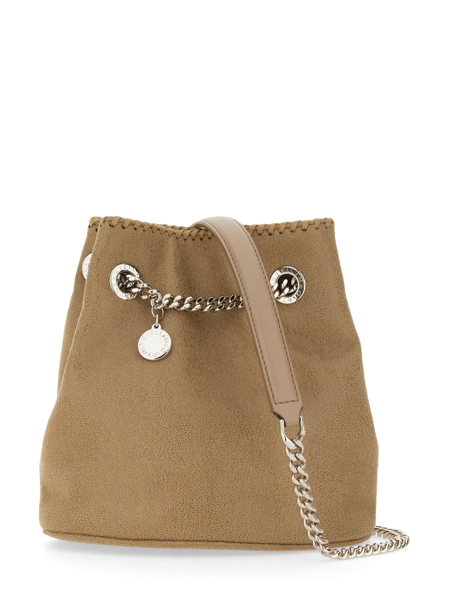 Vi presentiamo la Falabella Bucket Bag di Stella McCartney, un accessorio lussuoso e sostenibile che unisce stile ed etica. Realizzata con materiali cruelty-free, questa borsa iconica presenta il caratteristico bordo a catena e il disco con logo, che aggiungono un tocco di raffinatezza a qualsiasi outfit. Grazie agli interni spaziosi e alla tracolla regolabile, questa borsa versatile è perfetta per l'uso quotidiano o per le occasioni speciali. Elevate il vostro look con l'eleganza senza tempo della Falabella Bucket Bag.
