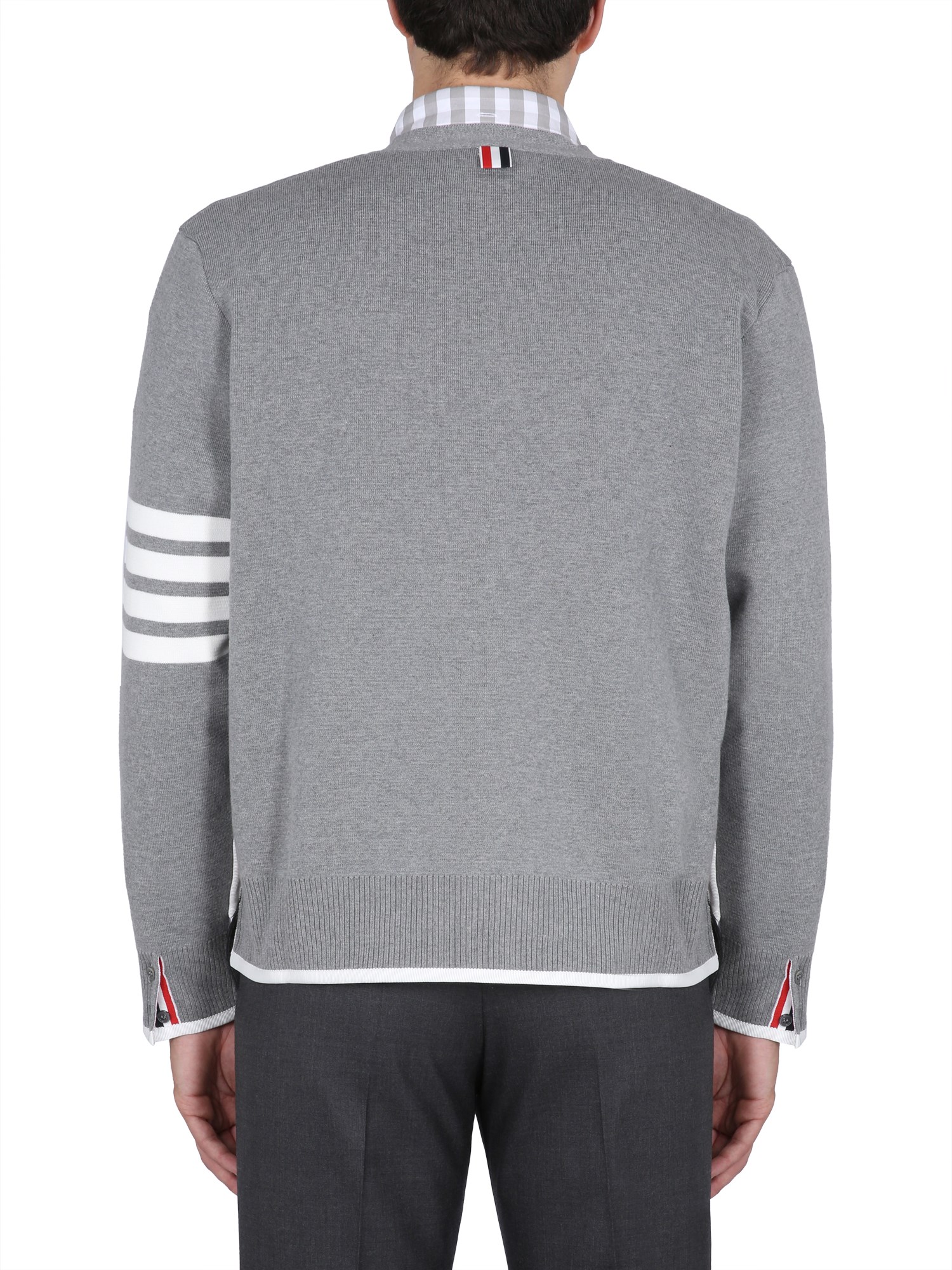 Il cardigan a righe 4Bar di Thom Browne è un capo d'abbigliamento con colletto e polsini in maglia a coste. È realizzato in un morbido tessuto di cotone, perfetto per le giornate di freddo leggero. Il cardigan presenta uno scollo a V, maniche lunghe e chiusura frontale con bottoni. Ha un dettaglio a righe 4bar sulla manica per aggiungere stile.