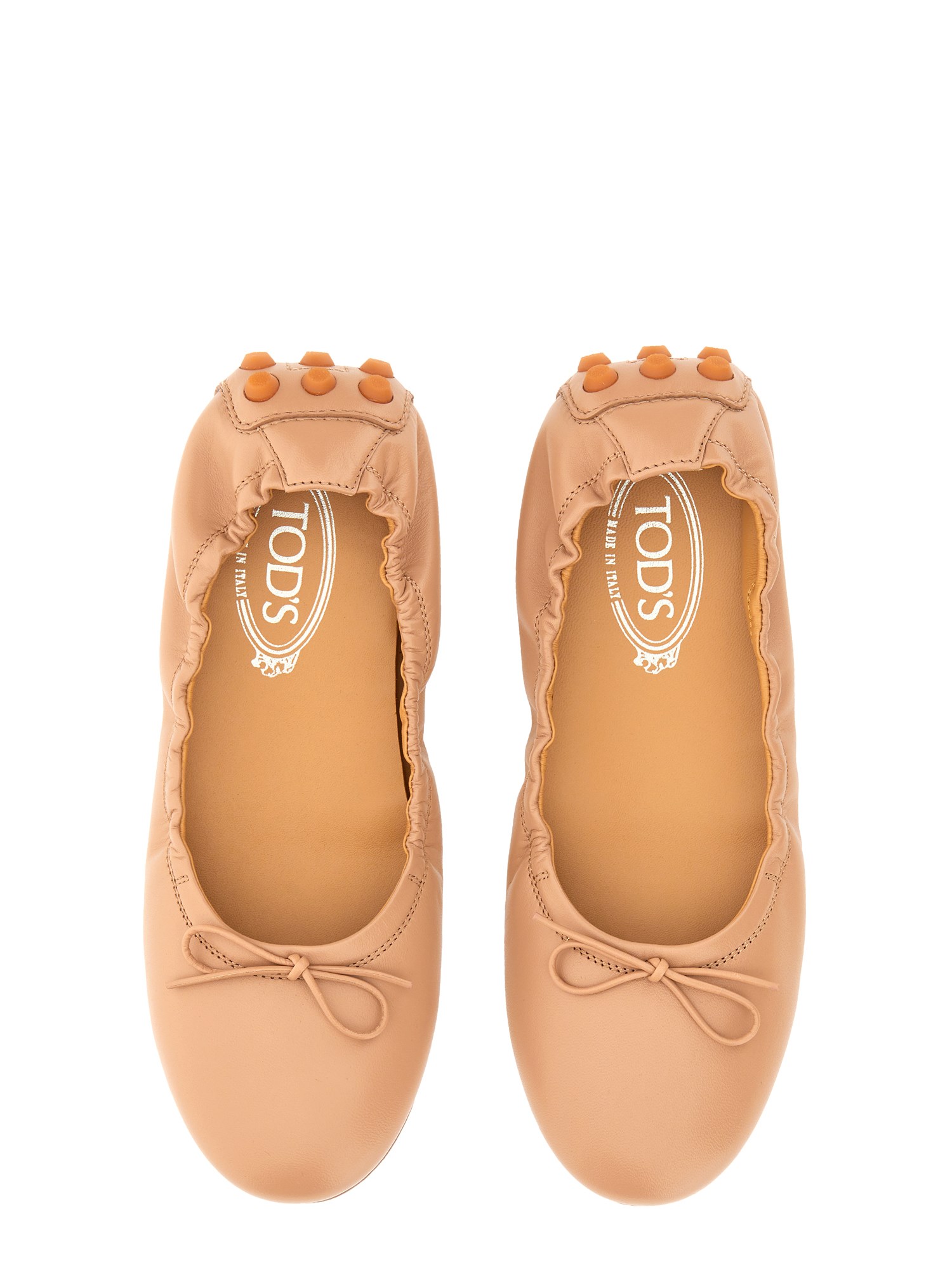La caratteristica suola con ciottoli di gomma che arrivano fino al tallone è un emblema del mondo Tod's. Queste ballerine reintroducono la loro versione contemporanea, con ciottoli di gomma enfatizzati. Realizzate in morbida pelle, con fiocco e finiture elastiche, uniscono stile, comfort e femminilità.