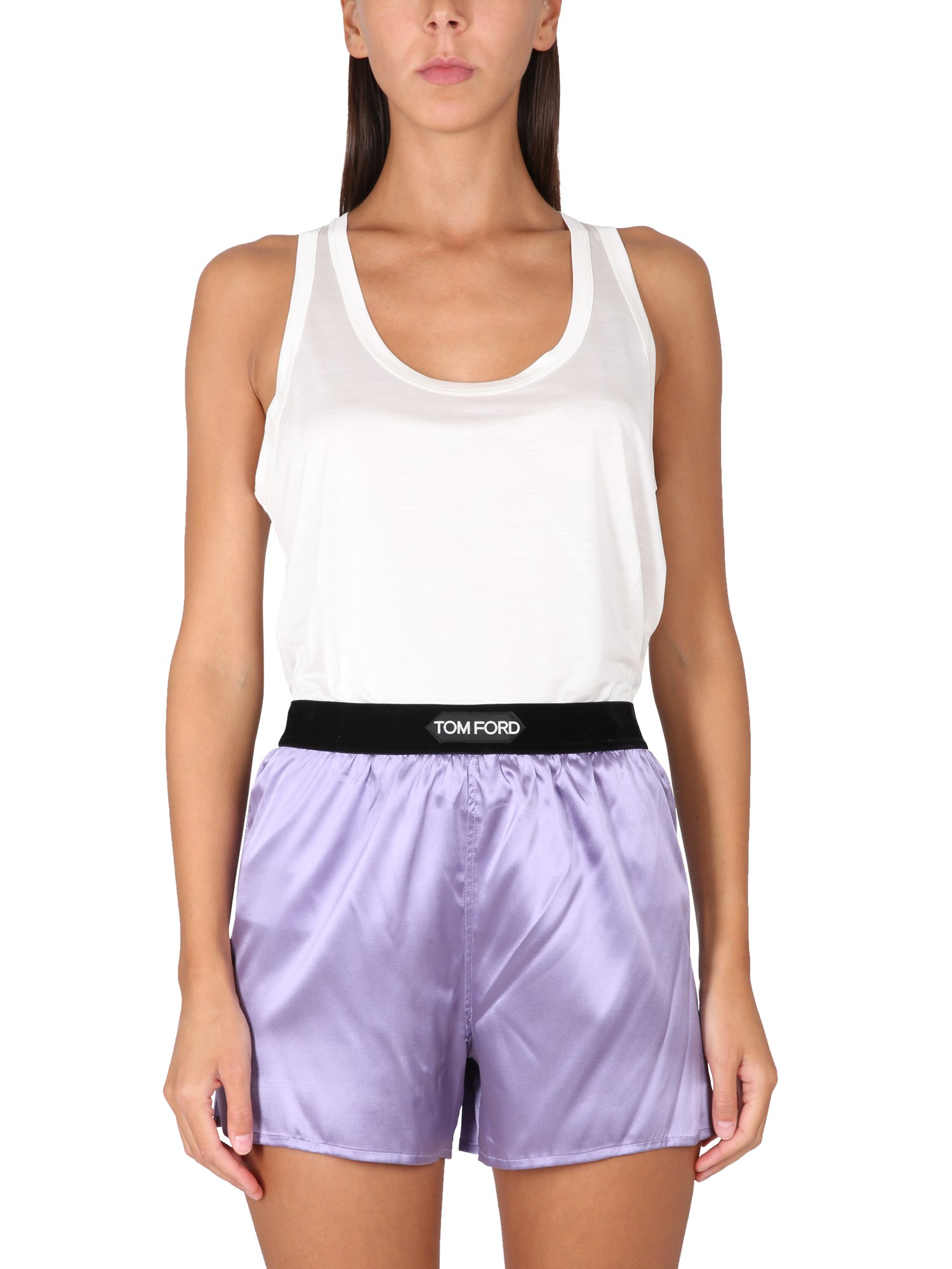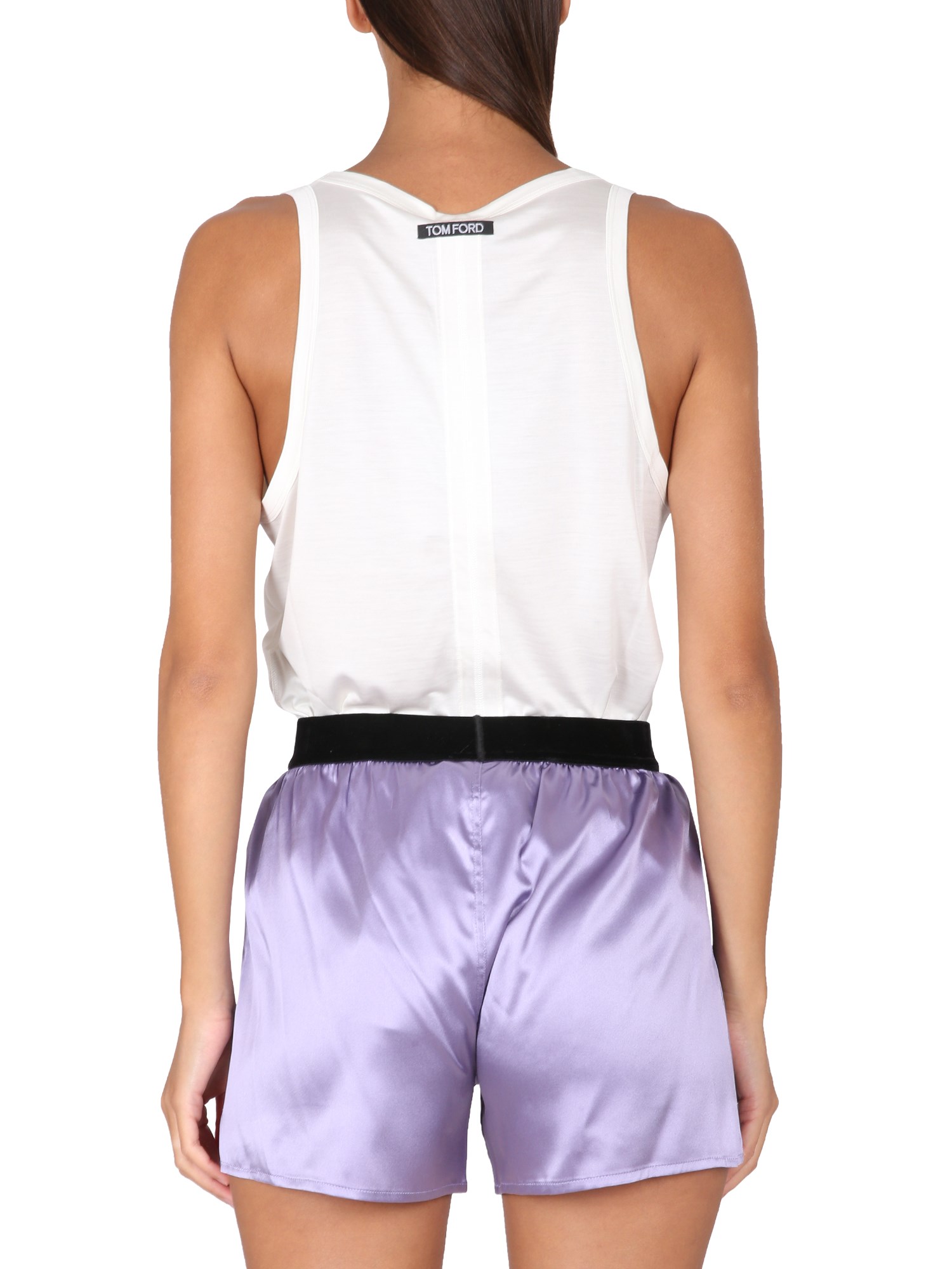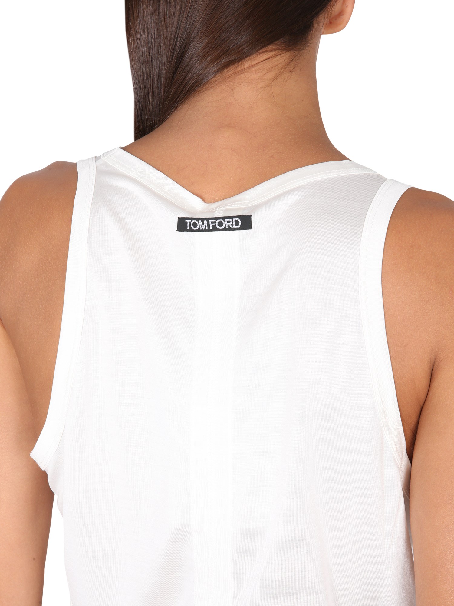 Top in seta con scollo rotondo e spalline sottili di Tom Ford dal design sottile e moderno. Ha una silhouette lunga e snella, ideale per chi vuole farsi notare. Questo top è realizzato in seta morbida e trasparente ed è sagomato per adattarsi perfettamente alla vita. È un top in seta di alta qualità, liscio e leggero.