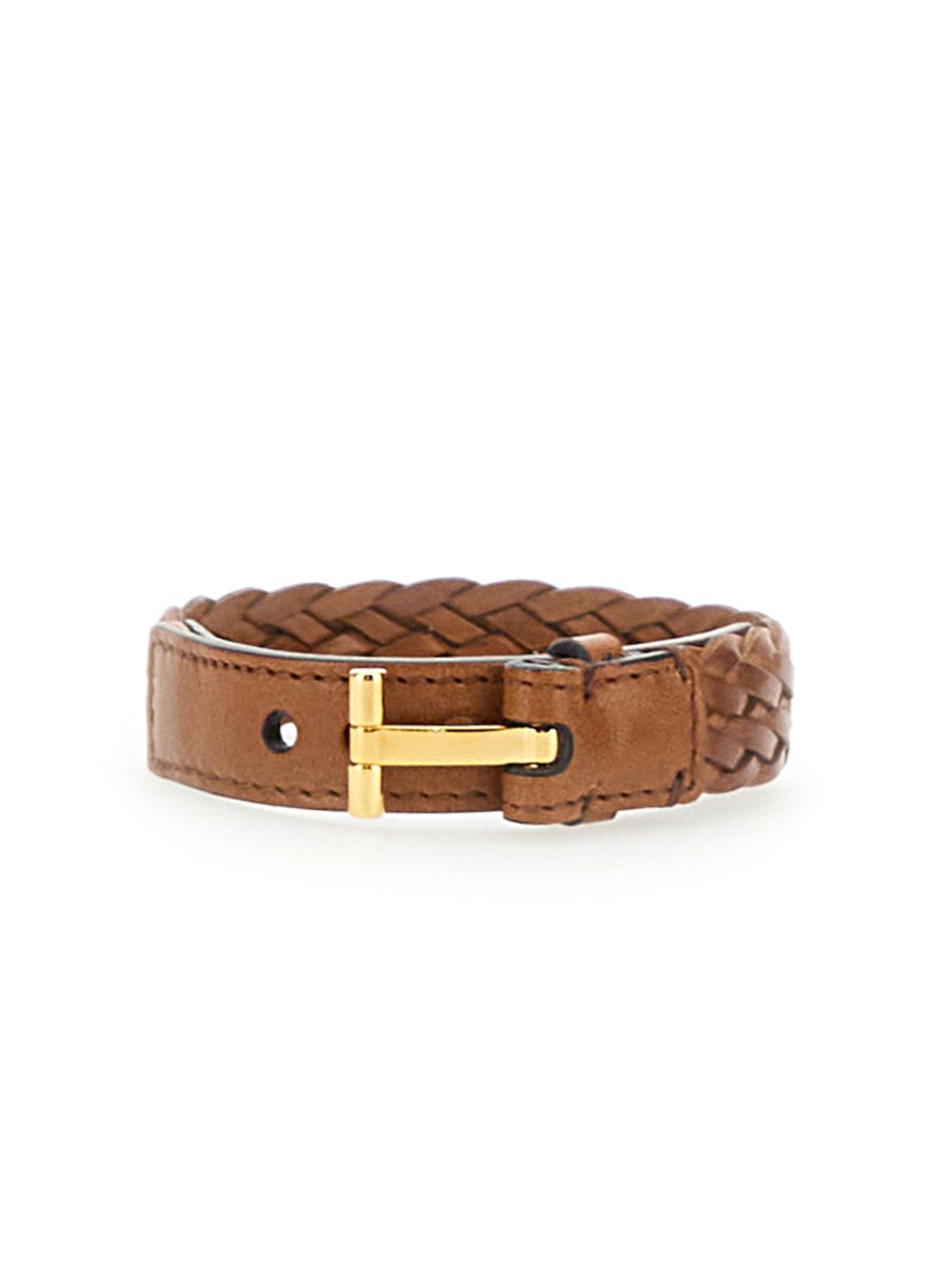 Questo bracciale in pelle intrecciata di Tom Ford è un pezzo audace con una finitura dorata contemporanea e una chiusura tradizionale. La pelle intrecciata ha un buon peso e un aspetto classico, mentre la chiusura ha il classico simbolo della donna al comando. È l'accessorio perfetto per una donna elegante e sicura di sé che sa come apparire al meglio.