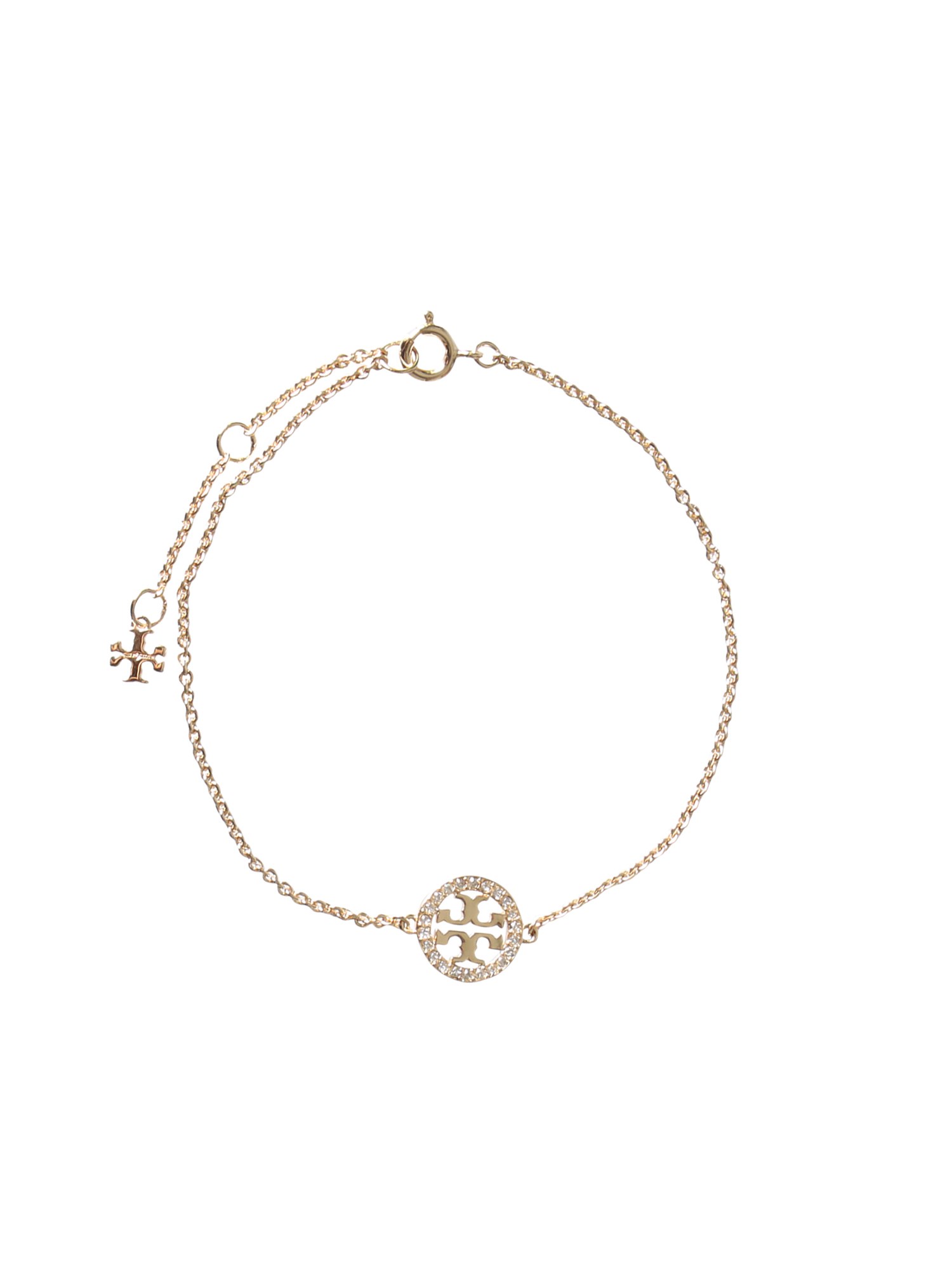 L'esclusivo bracciale a catena Miller Pavé della maison Tory Burch è composto da piccole maglie che si adattano al polso con una chiusura regolabile in perle. È dotato di un logo con cristalli Swaroski. Il bracciale con finitura dorata ha un look elegante e contemporaneo che resiste alla prova del tempo.